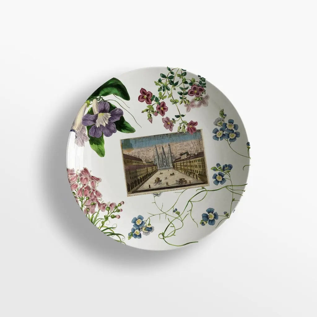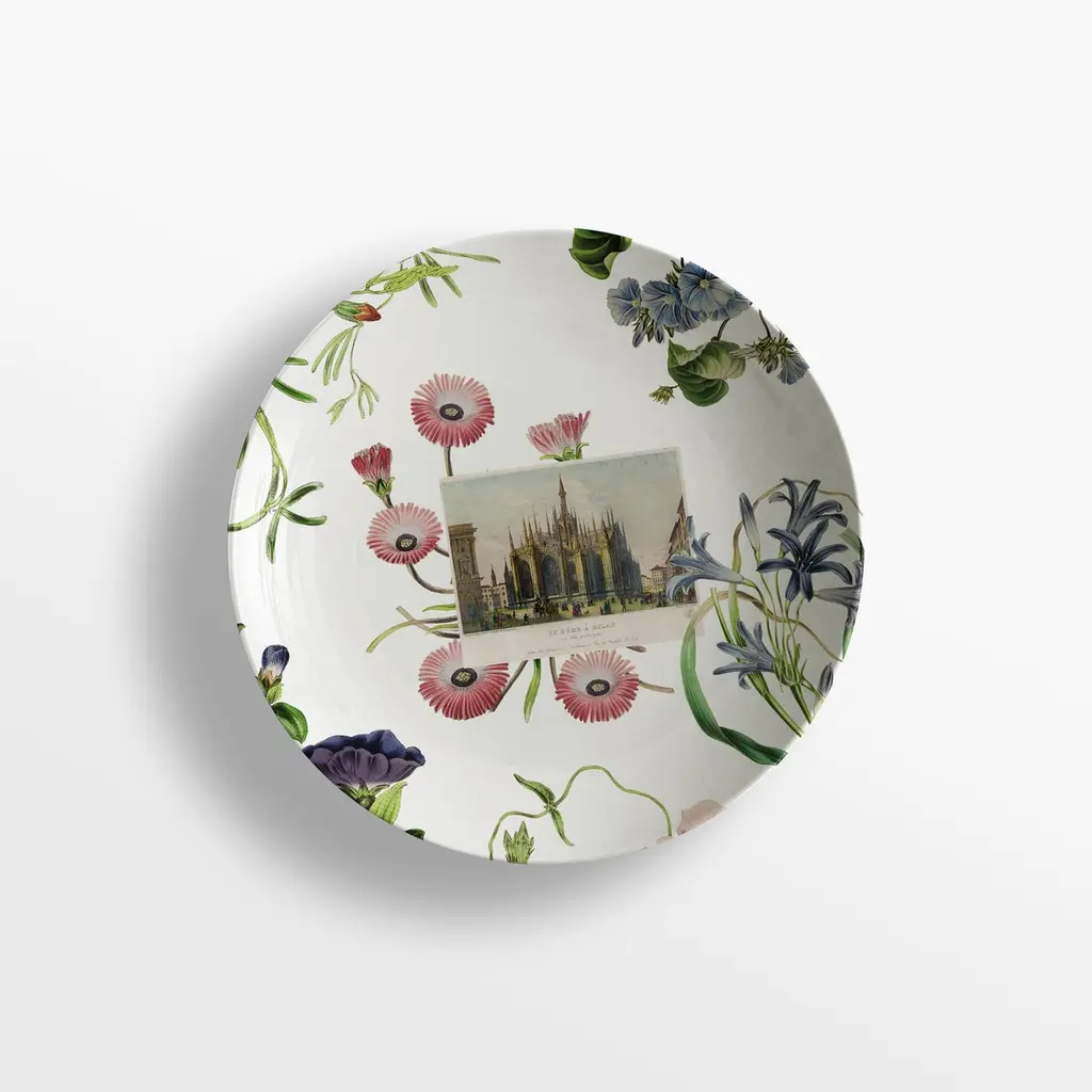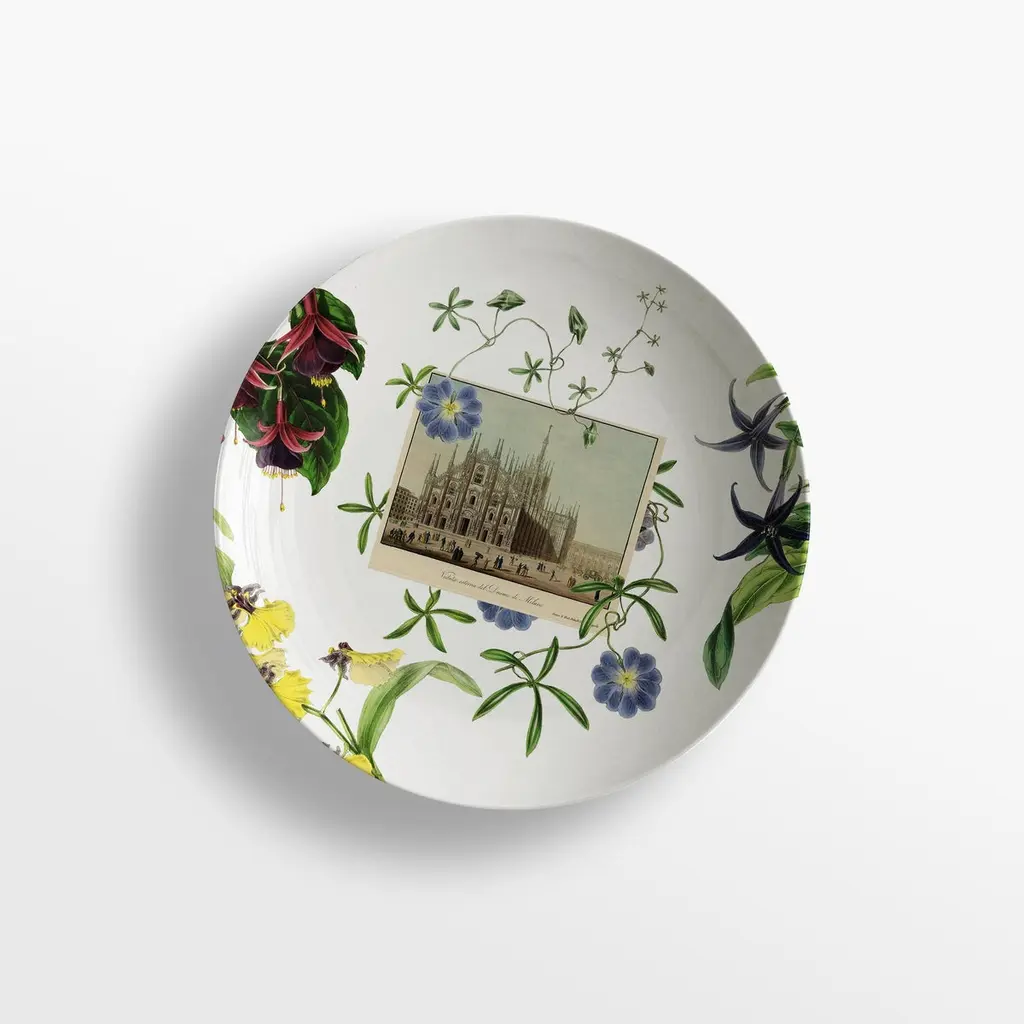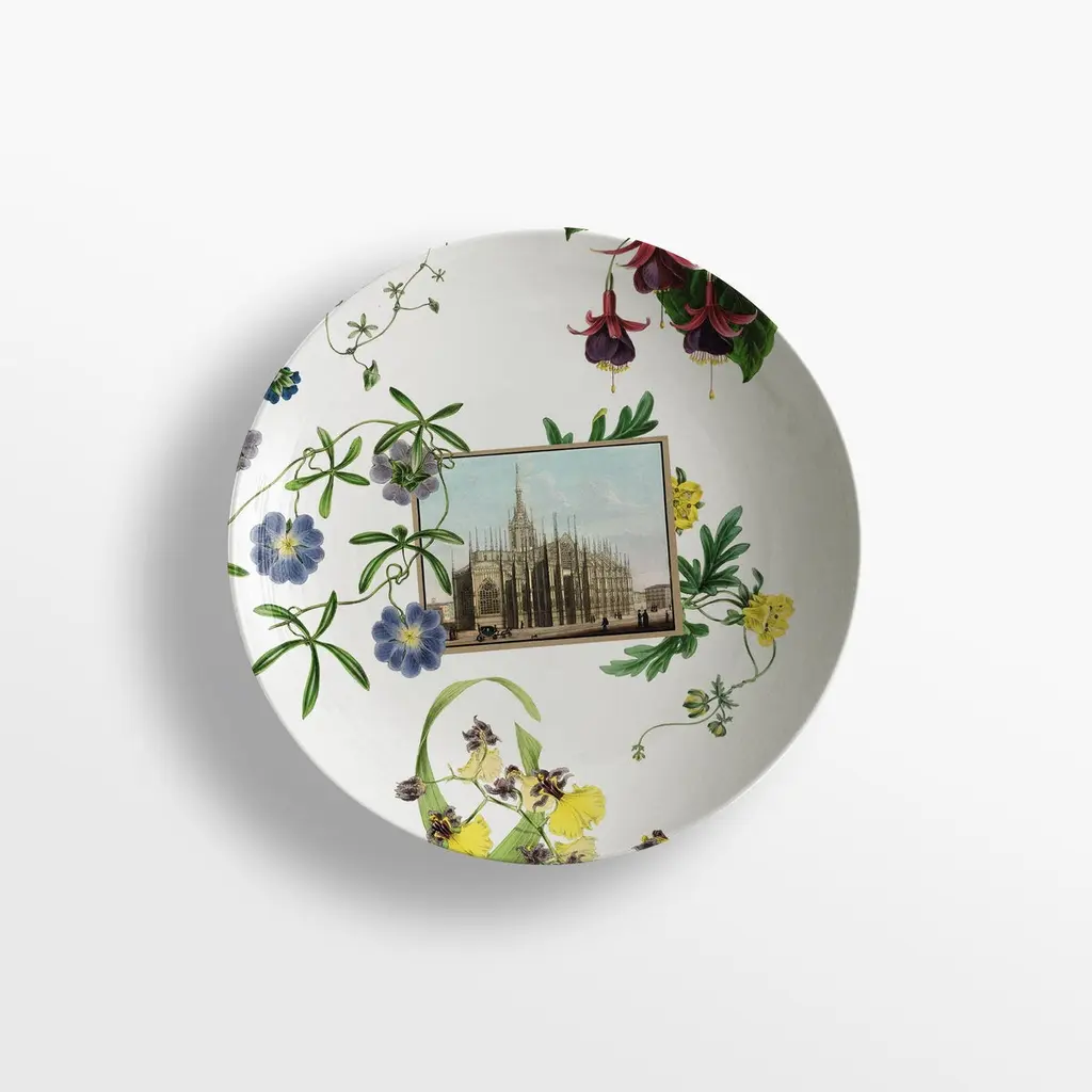 From the encounter between the historical archives of the Duomo di Milano and the imagery of Grand Tour by Vito Nesta, this unique collections of porcelains and fabrics were born. “La storia Infinita” is a dedication to all that work of study and design of the various parts that make up the splendid cathedral, we find study details of the balustrades, statues, spiers and even maps from where the marble was extracted for the facade still some unique hand-painted postcards of the cathedral just finished.Buyers, through the purchase of these collections, will contribute to the restructuring of the spiers of the Duomo as part of the proceeds will be donated to the Veneranda Fabbrica for this purpose.Set of 6 soup plates.