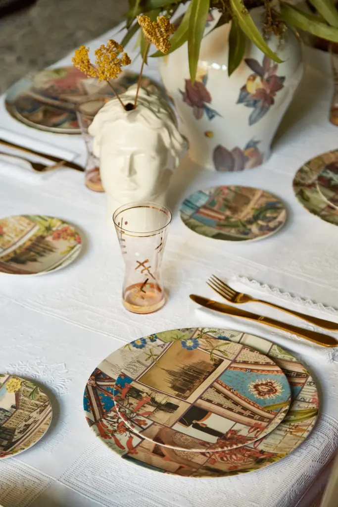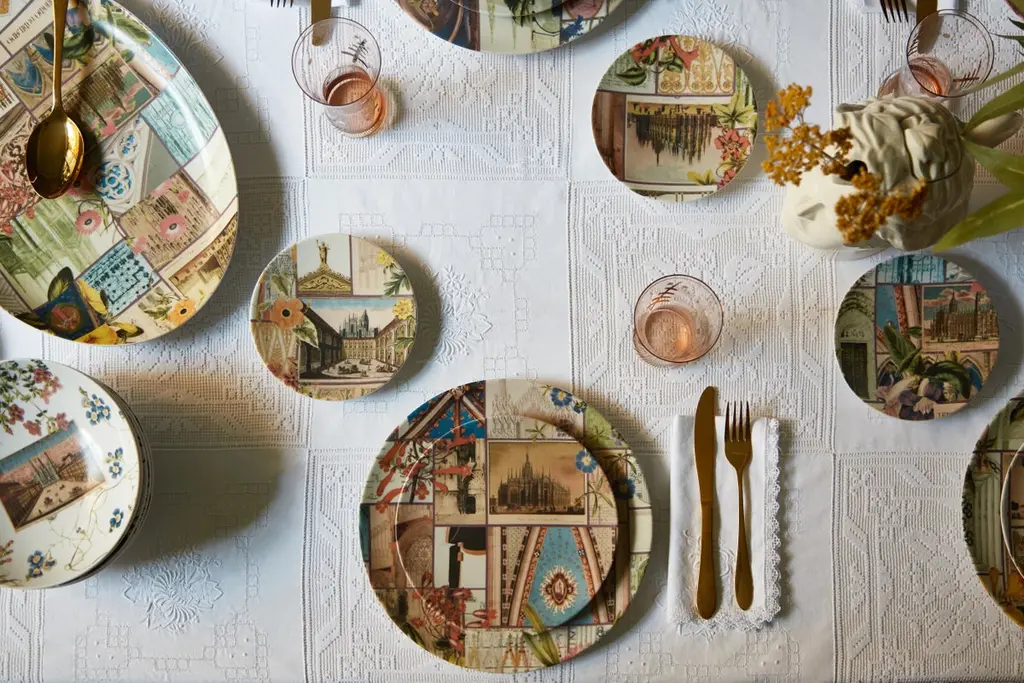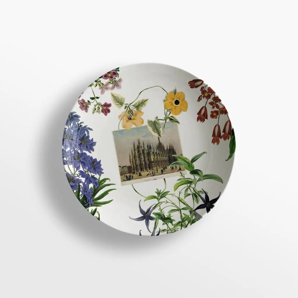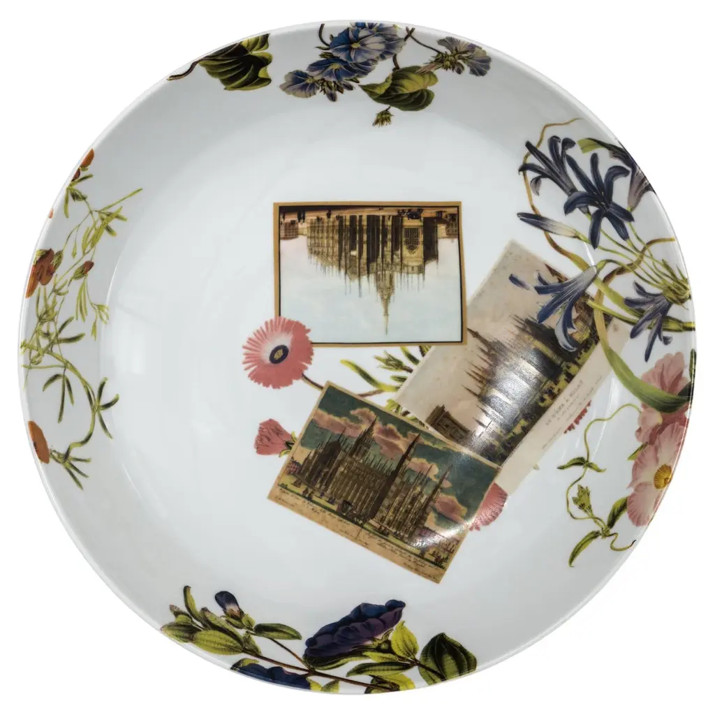 From the encounter between the historical archives of the Duomo di Milano and the imagery of Grand Tour by Vito Nesta, this unique collections of porcelains and fabrics were born. “La storia Infinita” is a dedication to all that work of study and design of the various parts that make up the splendid cathedral, we find study details of the balustrades, statues, spiers and even maps from where the marble was extracted for the facade still some unique hand-painted postcards of the cathedral just finished.Buyers, through the purchase of these collections, will contribute to the restructuring of the spiers of the Duomo as part of the proceeds will be donated to the Veneranda Fabbrica for this purpose.Set of 6 soup plates.
