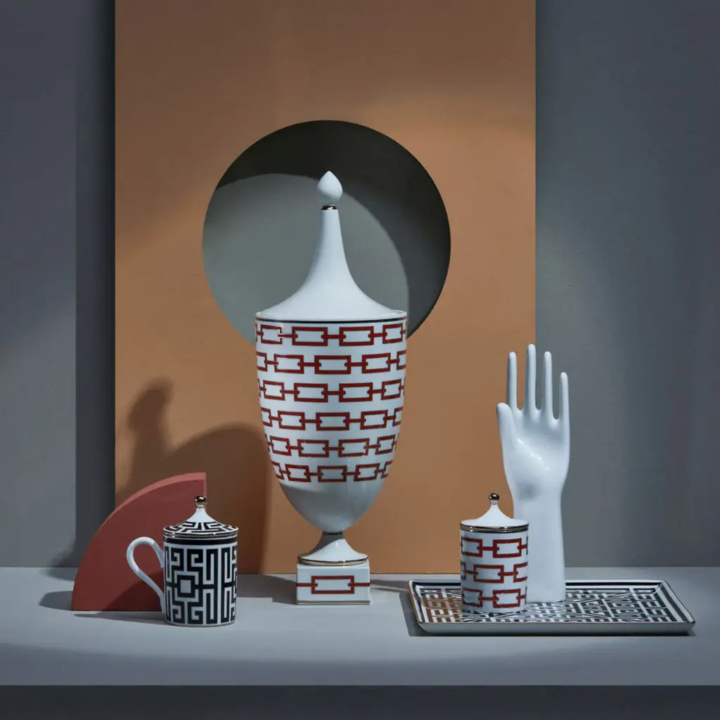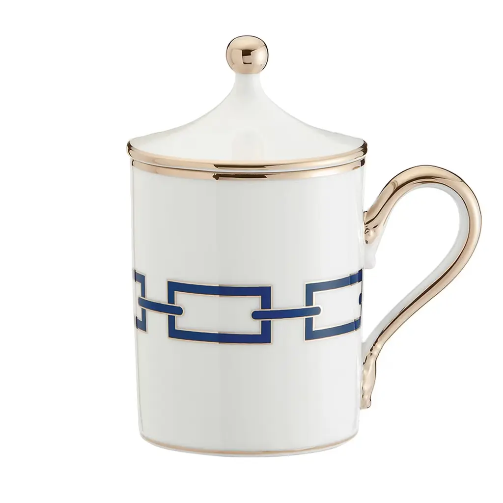 This mug with lid (cc 400) is an elegant way to enrich an everyday ritual with exquisite allure and a unique design. Part of the Labirinto Collection, designed in 1926 by iconic designer Gio Ponti, the black geometric decoration adds a refined touch to this mug. Gold accents highlight its silhouette and the lid.