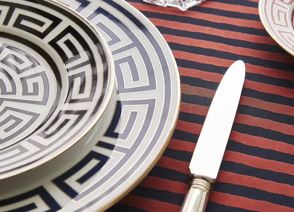 This stunning set of six dinner plates is elegant and modern, boasting a striking decoration designed by iconic master Gio Ponti in 1926. Part of the Labirinto collection, which means maze in Italian, the decoration features a geometric pattern in a superb scarlet-red hue that adds a refined touch to this piece, while also creating a timeless color combination with the white of the background and the gold details.