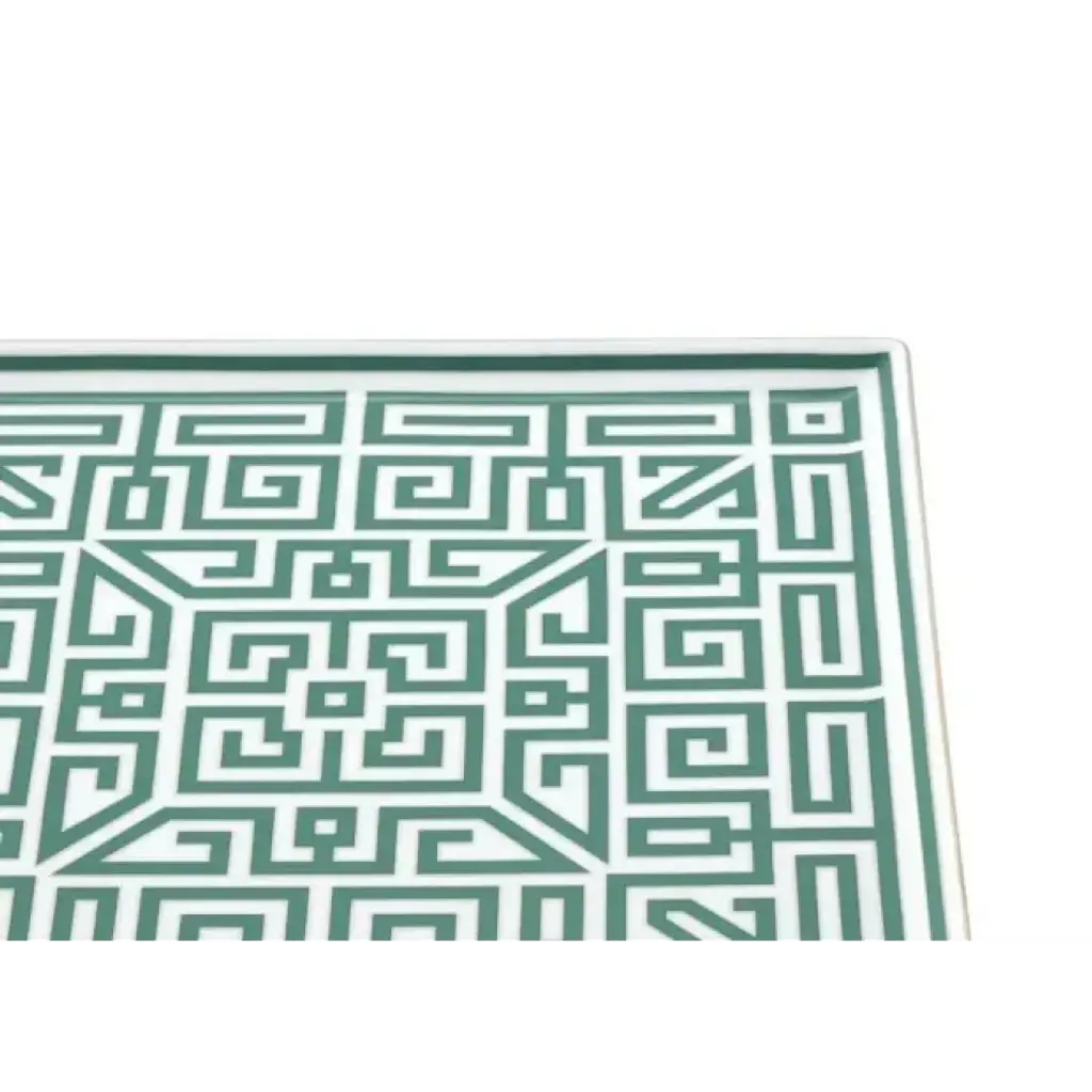 Square porcelain plate with emerald green and platinum decoration. Labirinto collection by Gio Ponti. It stands out for its emerald green geometric decoration embellished with platinum threading, a tribute to Ginori 1735 craftsmanship. Available in other colours, it completes the tableware for unique and sophisticated mise en place through an unforgettable gourmet journey. Labirinto is a symbol of the art of Italian porcelain and its evolution. Born from the creative genius of Gio Ponti and expressing the union between innovation and tradition as a tribute to the unmistakable style of Ginori 1735.