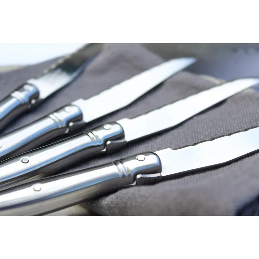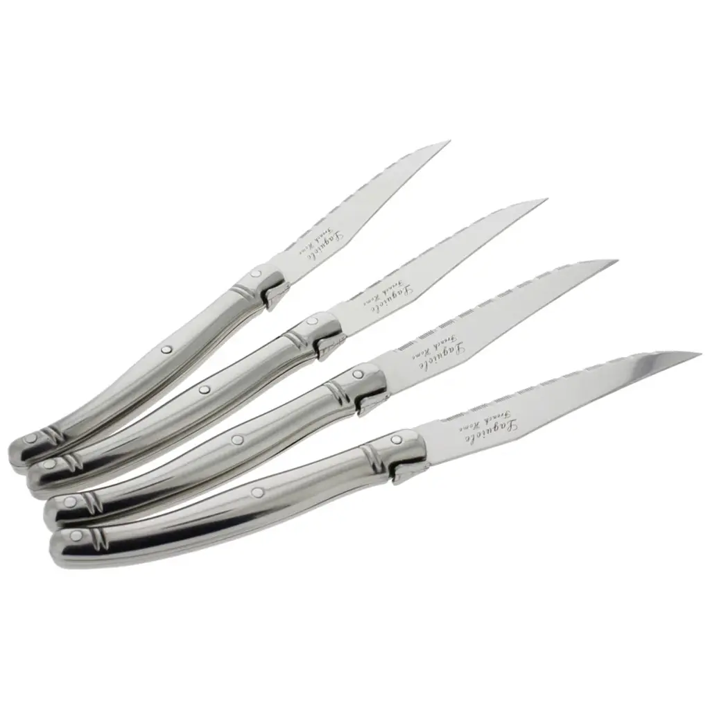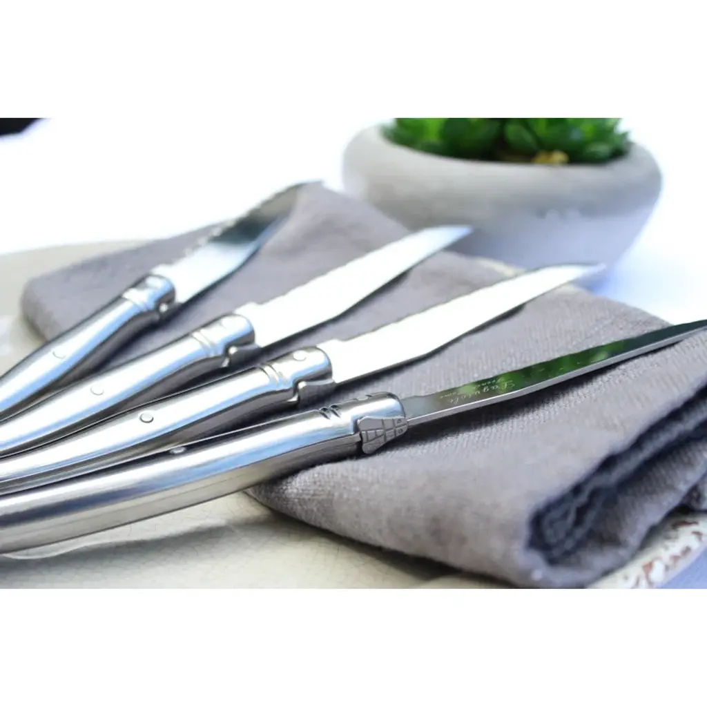 Serve up steak dinners with this set of four knives. Crafted with a handle, each piece features a serrated blade to cut with ease. A motif that reads Laguiole French home adorns each blade for a decorative touch. Best of all, this set is safe to put in the dishwasher for easy cleanup. Though this set is perfect for your own home, it’s also a great housewarming or wedding gift option.