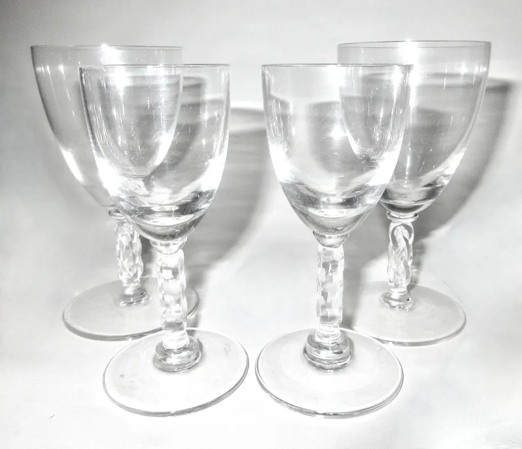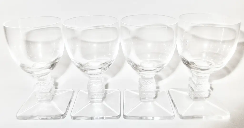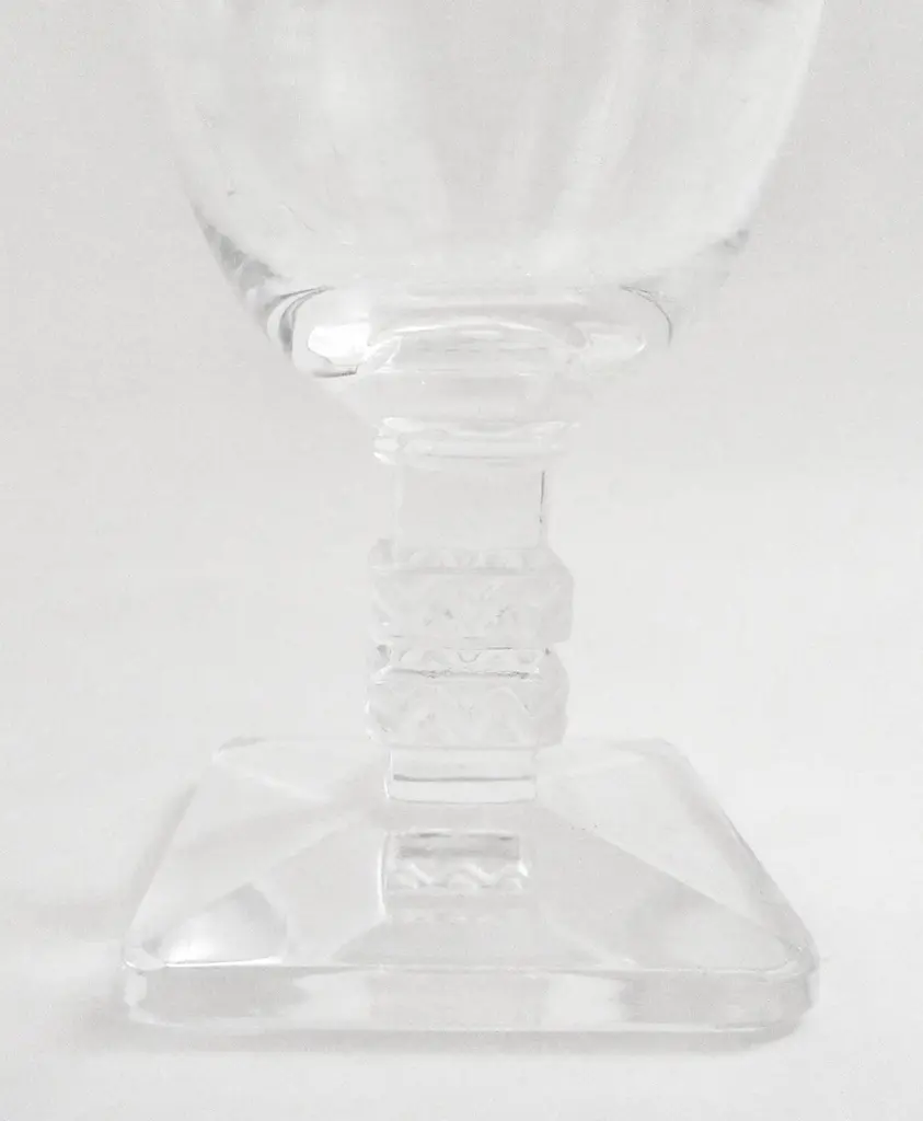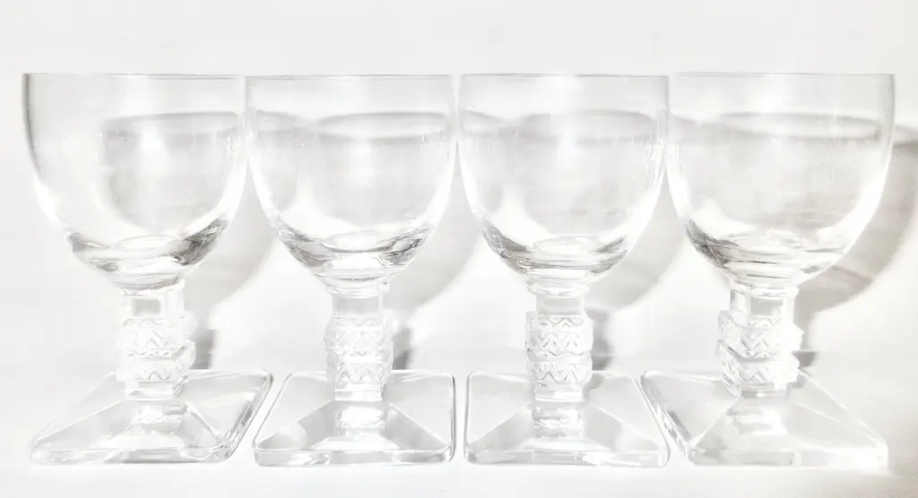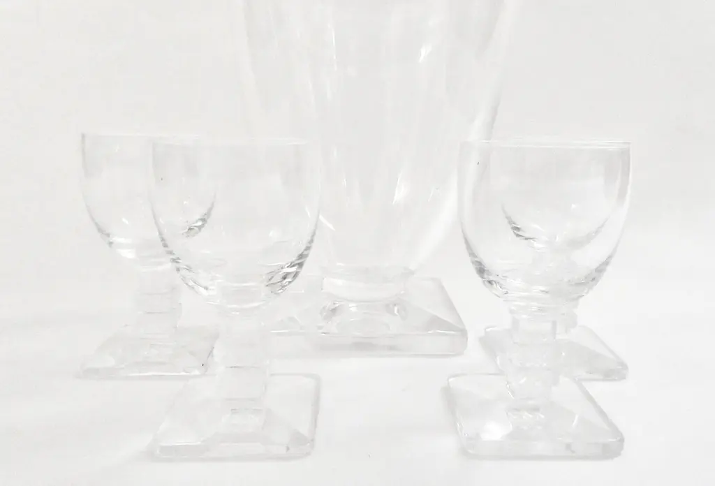 Rare set of four Lalique French Art Deco crystal cordial glasses and decanter in the exquisite Argos pattern. Sensual glasses with superb double chevron stems and square bases. The chevron design and square base repeats in the decanter stopper. Signed "Lalique France" with marks used by Lalique from 1945 until 1960. Dimensions: decanter: 4.5"D, 11"H; glasses: 2.25"D, 3.25"H