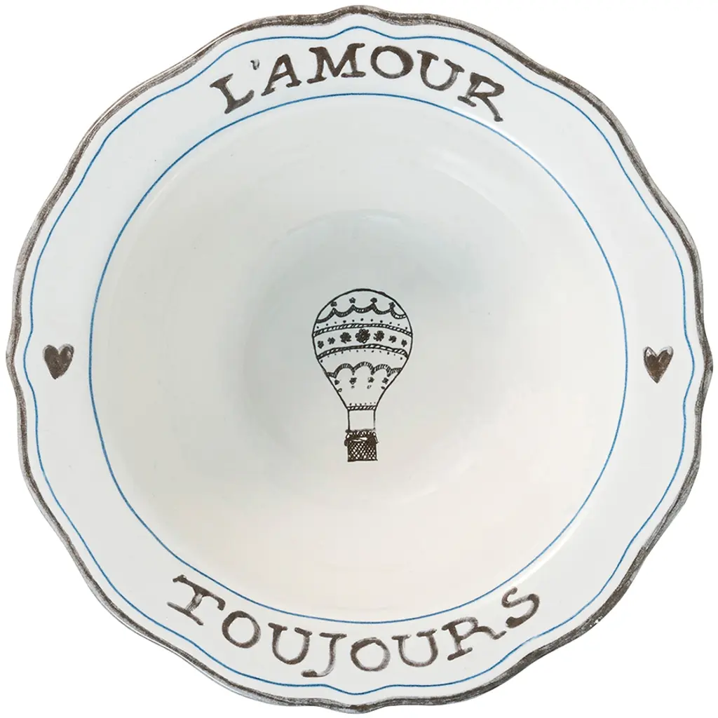 L'amour Toujours, French for "Love Always," is the sentiment inscribed on this stoneware bowl, along with a hand-sketched hot-air balloon, and this bowl is indeed one you'll love always. Made in Portugal, it's as practical as it is lovely: It can go from freezer to oven or microwave to dishwasher with ease.