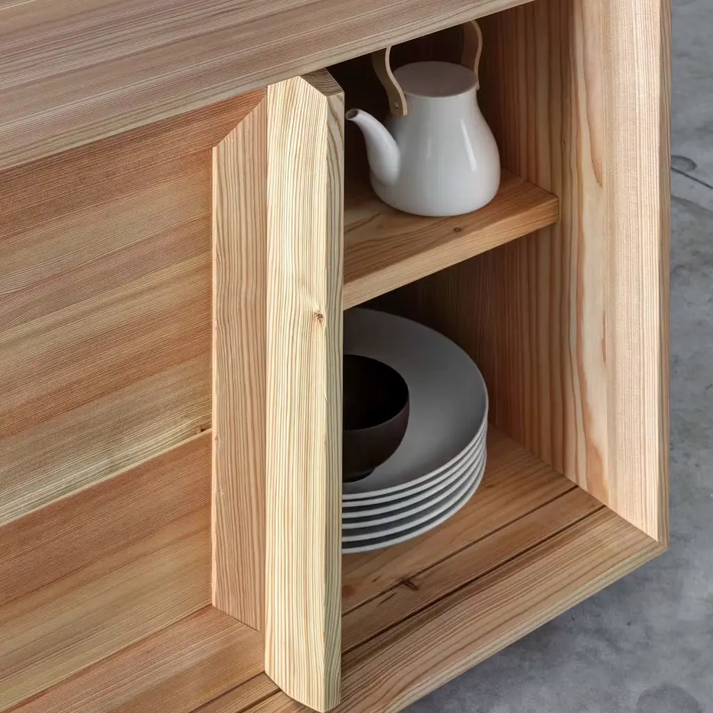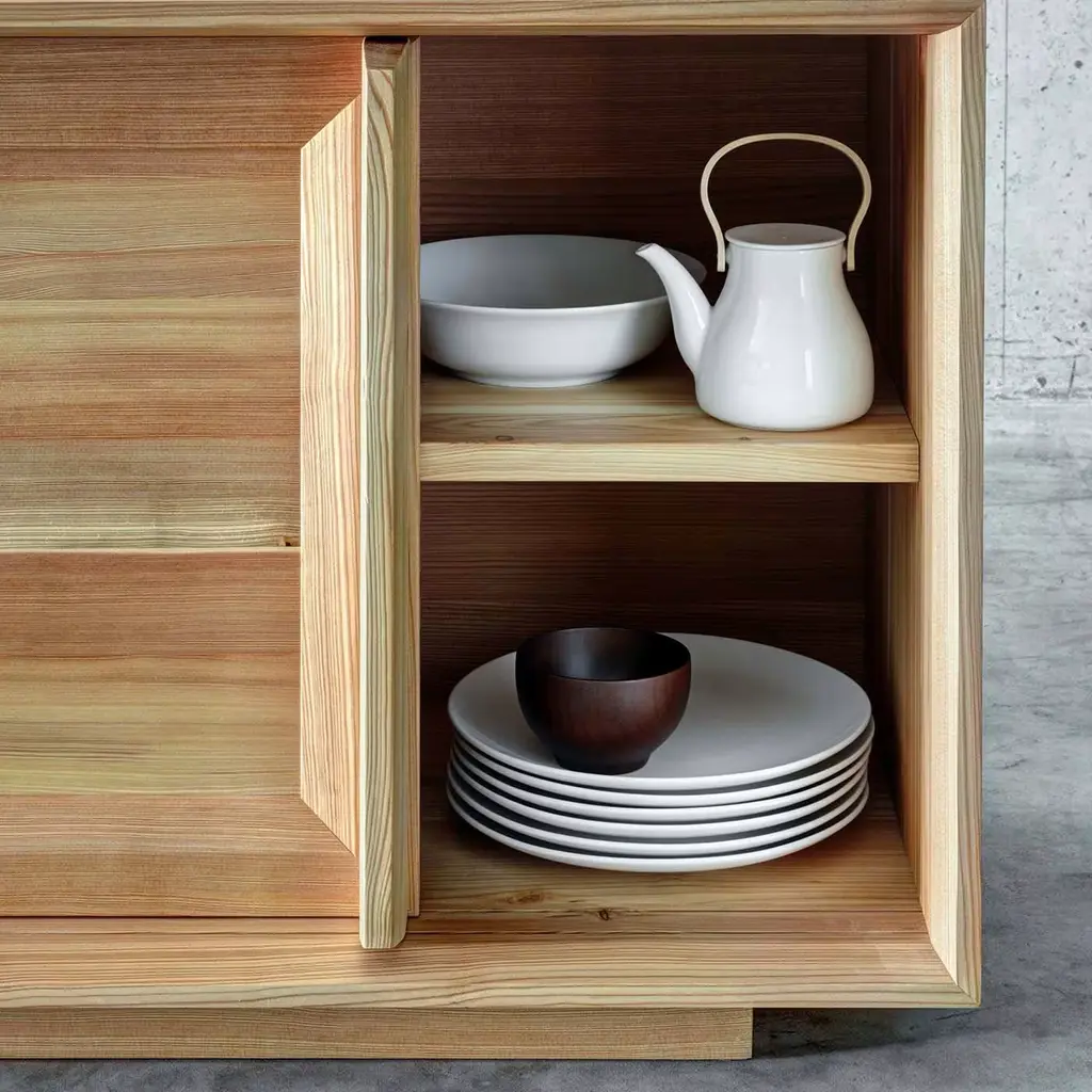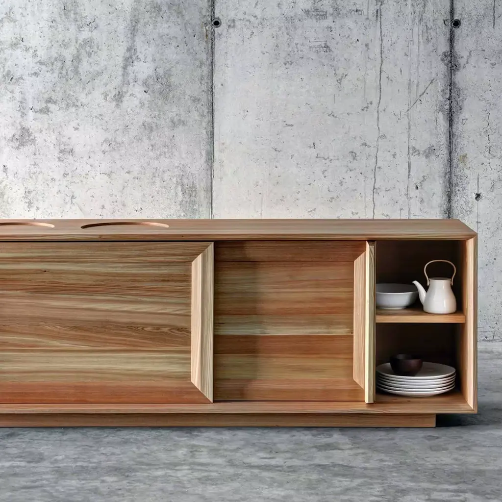 Designed by Act_Romegialli, this elegant and timeless cupboard will be a striking presence in any home. Its rectangular shape was crafted entirely of solid larch with the front featuring two sliding framed doors with tapered wood handles that open up into an interior separated with a solid shelf. The top is adorned with two round concave elements that can be used to hold collectibles or as minimalist vide poche. Superb details and fine craftsmanship make this unique design a versatile object of functional decor in a living room, dining room, or entryway.