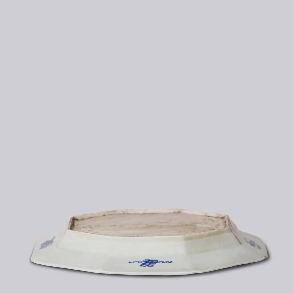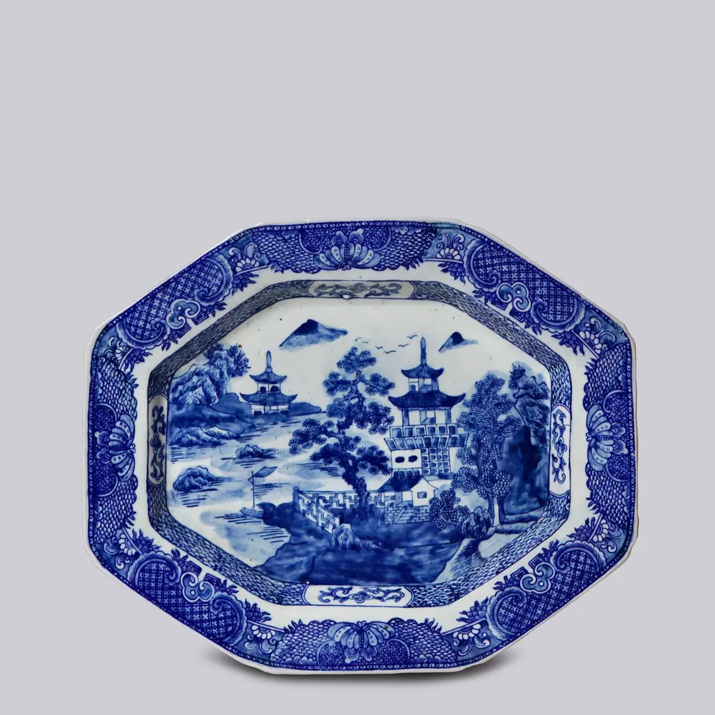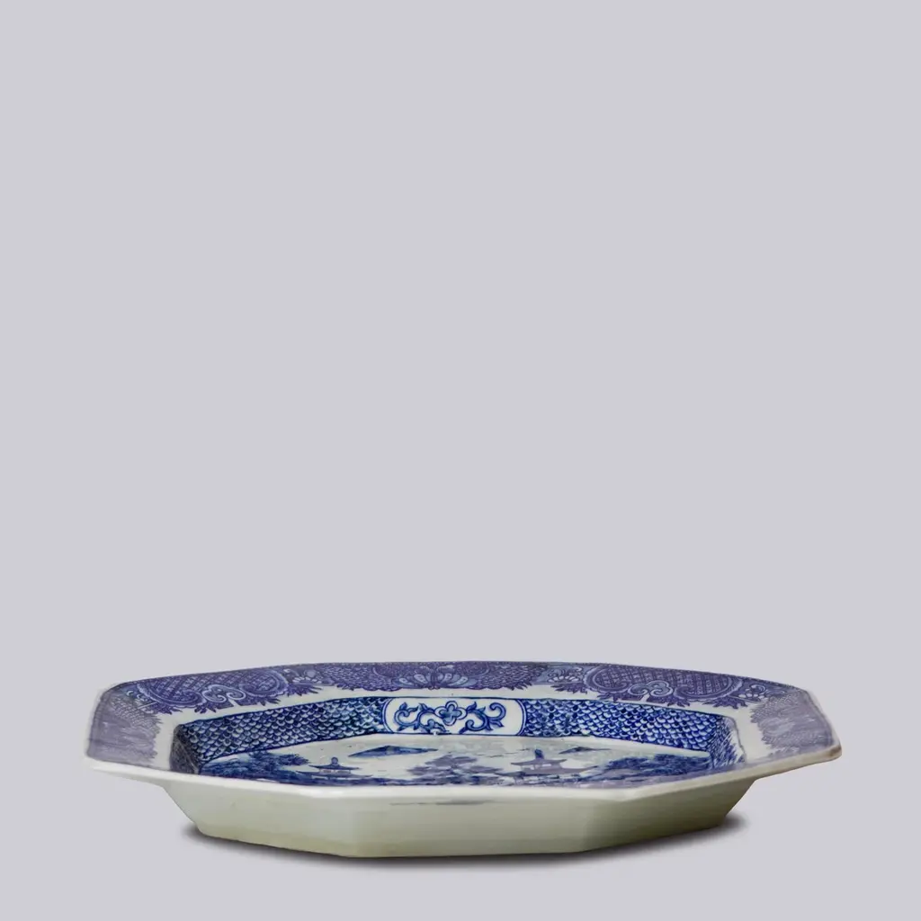 Large Blue And White Willow Ware Octagonal Porcelain Platter