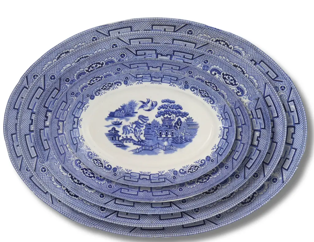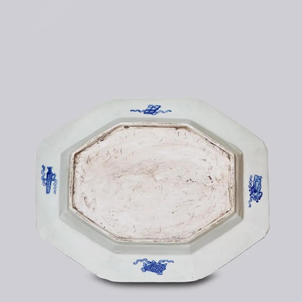 This platter is a traditional style from Jingdezhen, a town long distinguished by imperial patronage. The Willow Ware pattern is a beloved traditional Chinese style that was interpreted and reinterpreted by European potteries and is still popular today. Due to the unusual shape, this platter was formed by hand in a well mold and then trimmed to the final dimensions and slightly rustic finish.