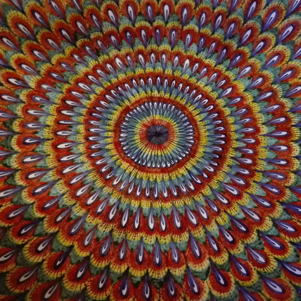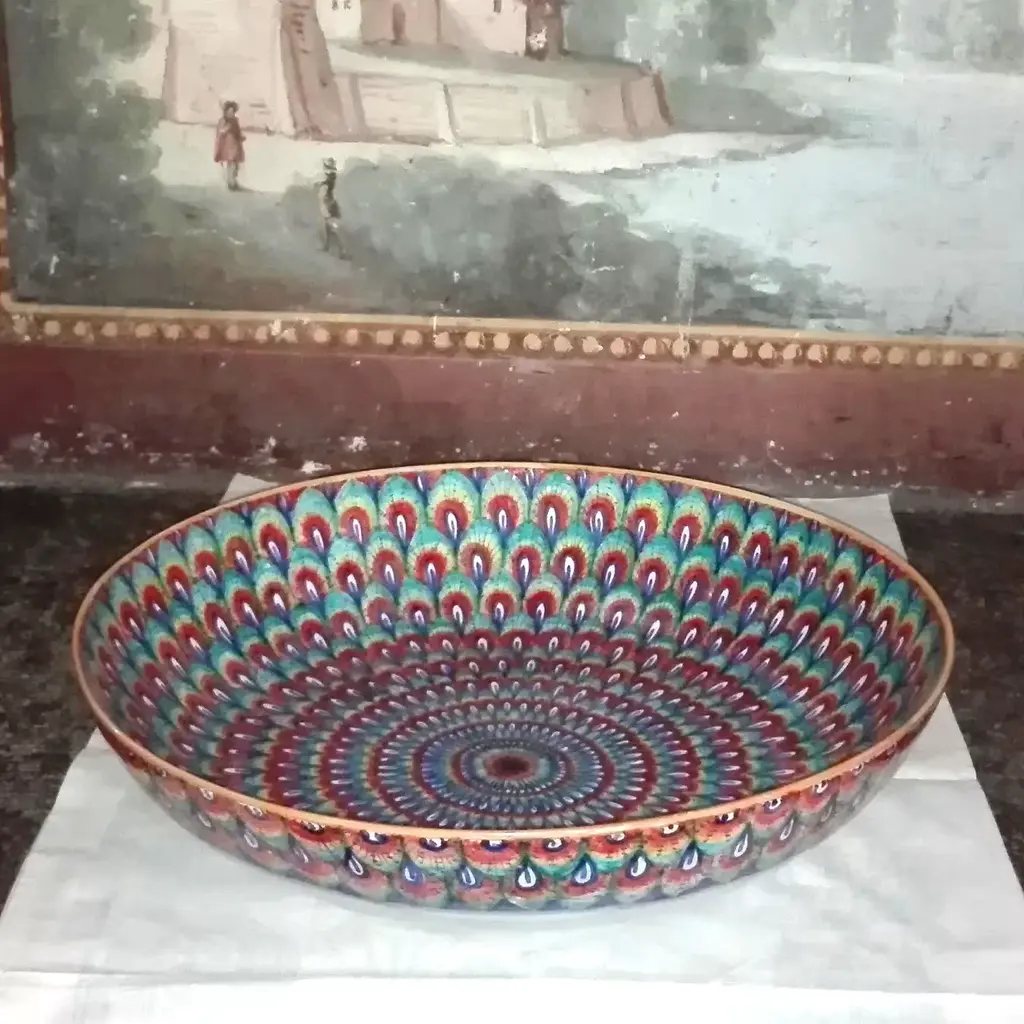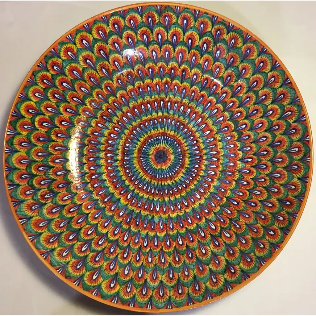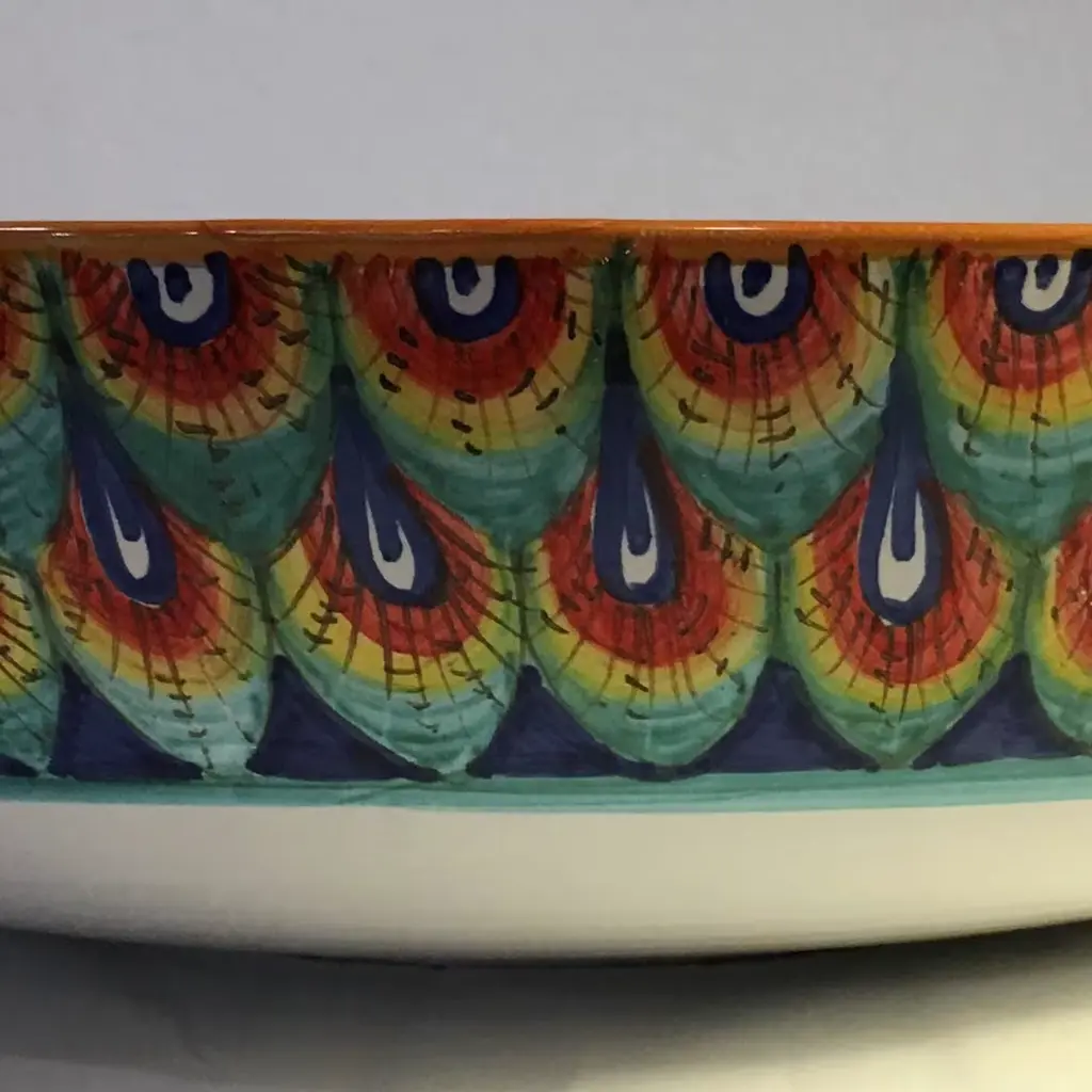 This large salad bowl in thin ceramic features a rounded shape and was crafted entirely by hand. Its elegant hand-painted decorations allow for this piece to be used as a centerpiece for ornamental purposes as well. The traditional Penne di Pavone motif from the renaissance period is featured on this bowl using bright colors like yellow, blue, turquoise, and orange with the addition of an intense red color, giving the piece a more modern look and a stronger visual impact.