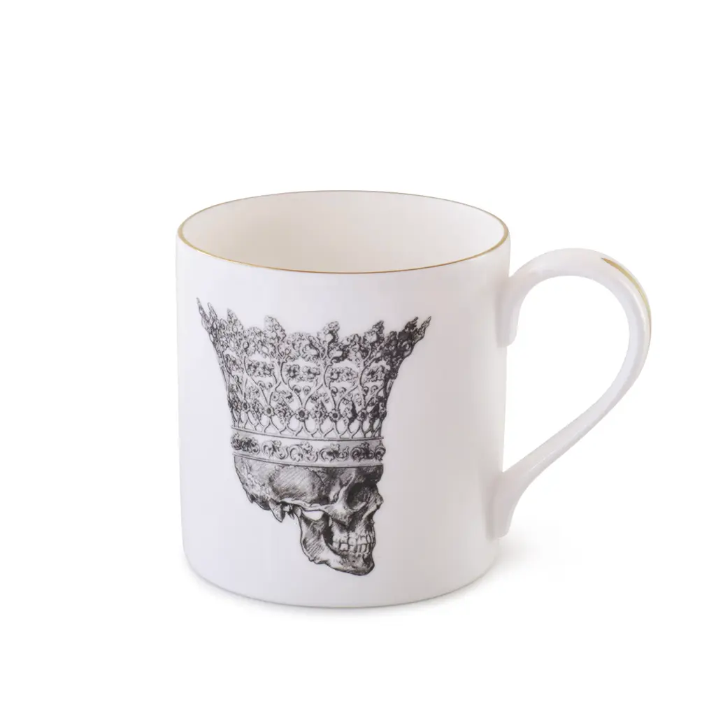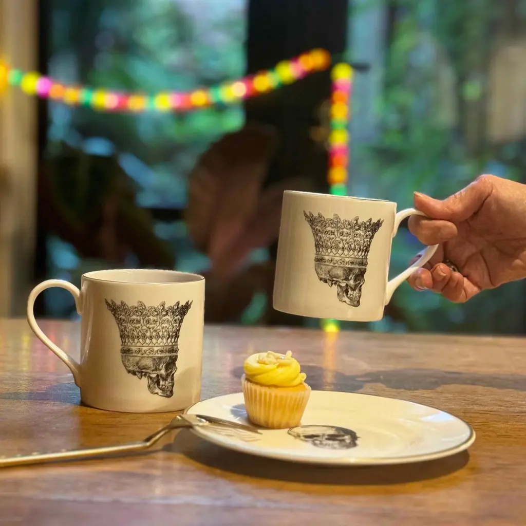A set of two exquisitely handcrafted fine bone china mugs in a new larger size perfect for sharing a moment with a hot tea, coffee or hot cocoa. Featuring the Skull in Crown design from the Melody Rose Rock and Roll Collection.Each mug is finished with hand painted 22kt burnished gold gilded rim, both luxurious and dishwasher friendly.The playful designs paired with the best of British craftsmanship make a wonderful gift for coffee and tea lovers.Perfect on their own, or mix and match pieces from the Melody Rose fine bone china range to create a unique heritage set with a 21st century twist.