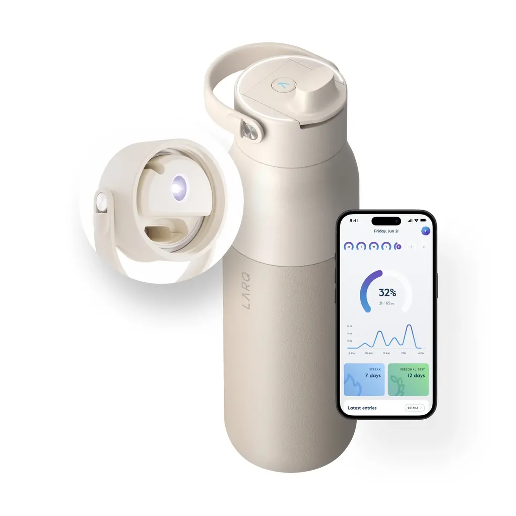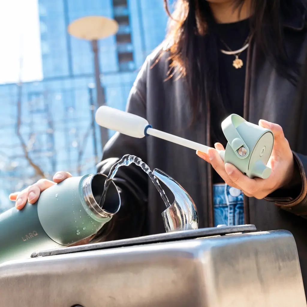 The LARQ, the world’s first self-cleaning water bottle providing on-the-go water purification from a clean bottle, is back in a new and improved version. The self-cleaning Larq PureVis 2.0 Bottle provides both purification and filtration, thanks to a filter that removes chlorine and PFOA/PFOS. It also eliminates bio-contaminates like E. coli and salmonella. Features of the Larq PureVis 2.0 Bottle include: Double-walled insulated stainless steel design keeps water cold for up to 24 hours. Enhances water quality with 2-stage filtration and purification for cleaner, better-tasting water. PureVis™ technology that eliminates up to 99.9999% of bio-contaminates like E. coli and salmonella. Nano Zero filtration that improves taste and removes chlorine and PFOA/PFOS. Innovative plant-based filter that’s independently tested to NSF/ANSI 42 & 53 standards to be effective against a wide range of pollutants. 1 filter included. A dedicated app that tracks your hydration habits and sets goals so that you can improve your hydration. PureVis™ technology activates every 2 hours to keep your bottle clean and odor-free—aand prevents bio-contaminant growth. Built-in, detachable soft-touch handle making it easier to take your hydration on-the-go. USB-C charging port: one full charge lasts up to 2–3 weeks of use. Measures 10h x 3"diam. Generous capacity, holds 23oz. 3-pack of replacement filters sold separately. One filter will last up to 40 gallons for 2 months before needing to be replaced. Features of the Larq PureVis 2.0 Essential Bottle Filter include: Long-lasting: Filters up to 25 gallons (94 liters) of water or 2 months of use — this equals to 189 single-use plastic bottles. The innovative plant-based filters are independently tested to NSF/ANSI 42 & 53 standards to be effective against a wide range of pollutants. Protects against chlorine, PFAS (PFOA/PFOS), pharmaceuticals and more.