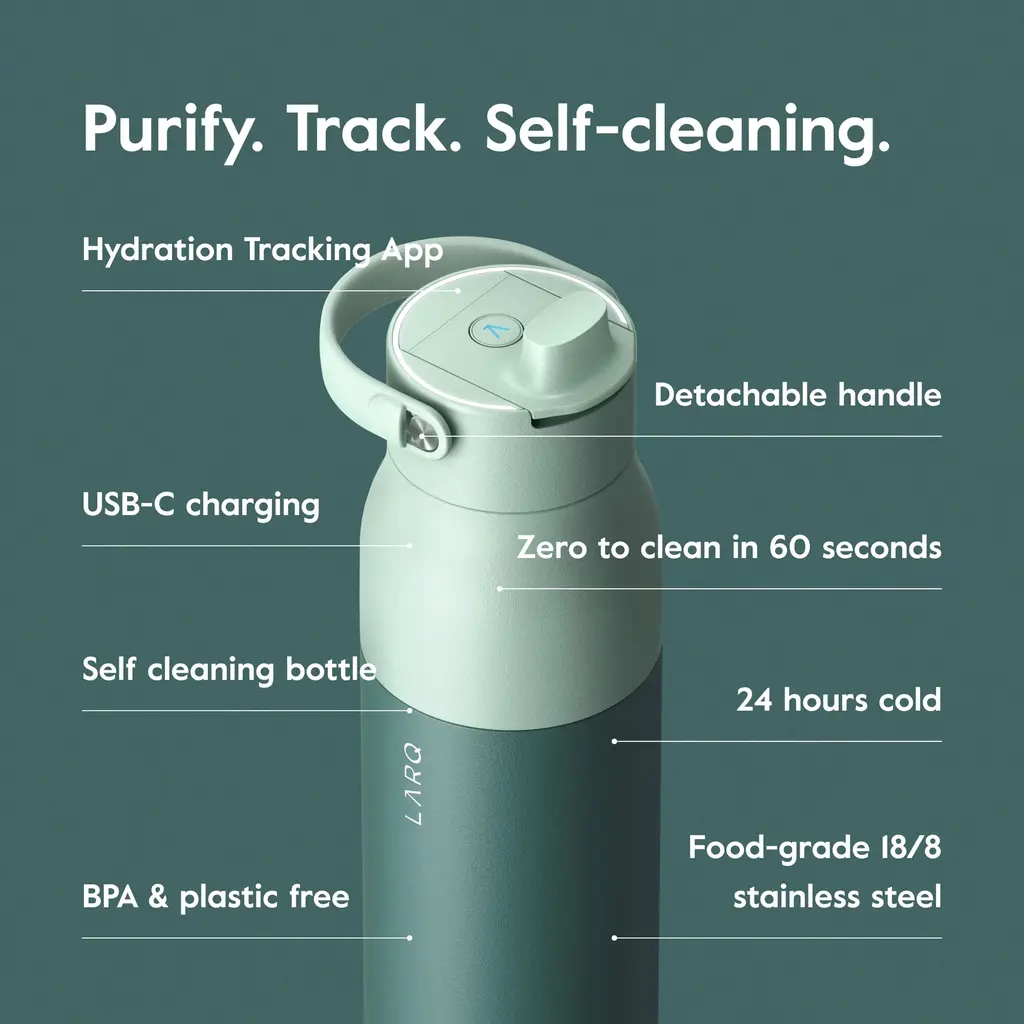 The LARQ, the world’s first self-cleaning water bottle providing on-the-go water purification from a clean bottle, is back in a new and improved version. The self-cleaning Larq PureVis 2.0 Bottle provides both purification and filtration, thanks to a filter that removes chlorine and PFOA/PFOS. It also eliminates bio-contaminates like E. coli and salmonella. Features of the Larq PureVis 2.0 Bottle include: Double-walled insulated stainless steel design keeps water cold for up to 24 hours. Enhances water quality with 2-stage filtration and purification for cleaner, better-tasting water. PureVis™ technology that eliminates up to 99.9999% of bio-contaminates like E. coli and salmonella. Nano Zero filtration that improves taste and removes chlorine and PFOA/PFOS. Innovative plant-based filter that’s independently tested to NSF/ANSI 42 & 53 standards to be effective against a wide range of pollutants. 1 filter included. A dedicated app that tracks your hydration habits and sets goals so that you can improve your hydration. PureVis™ technology activates every 2 hours to keep your bottle clean and odor-free—aand prevents bio-contaminant growth. Built-in, detachable soft-touch handle making it easier to take your hydration on-the-go. USB-C charging port: one full charge lasts up to 2–3 weeks of use. Measures 10h x 3"diam. Generous capacity, holds 23oz. 3-pack of replacement filters sold separately. One filter will last up to 40 gallons for 2 months before needing to be replaced. Features of the Larq PureVis 2.0 Essential Bottle Filter include: Long-lasting: Filters up to 25 gallons (94 liters) of water or 2 months of use — this equals to 189 single-use plastic bottles. The innovative plant-based filters are independently tested to NSF/ANSI 42 & 53 standards to be effective against a wide range of pollutants. Protects against chlorine, PFAS (PFOA/PFOS), pharmaceuticals and more.