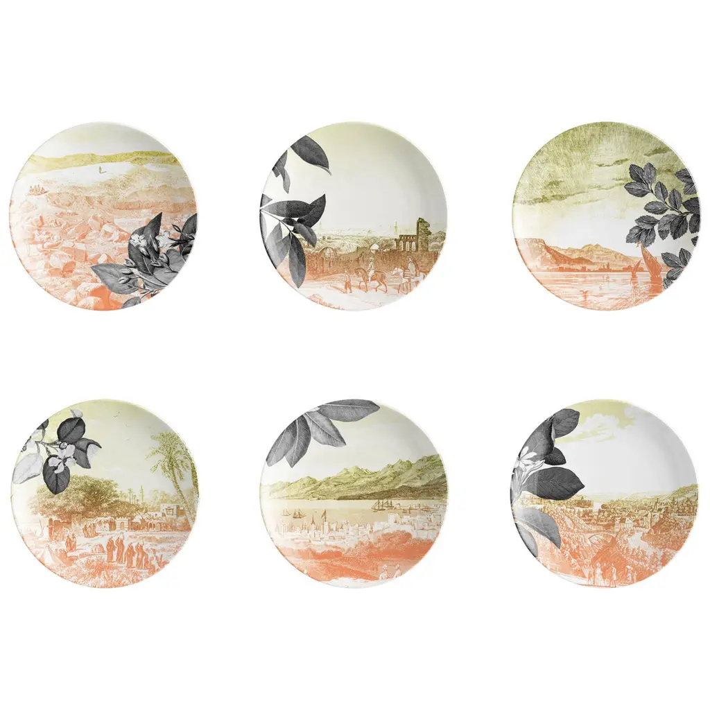 Elegant and timeless, this unique set of six porcelain plates is part of the Las Palmas series of plates feature images of the Amazon Rainforest landscape near the city of Palmas, Brazil. Using warm tones of yellow-gold for the design and an eye-catching, glossy-green for the rim, Vito Nesta has created pieces that are functional yet decorative. These plates can be used every day or on special occasion, filling every family gathering around the dinner table with boundless imagination.