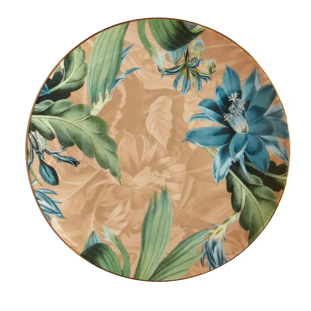 The lively yet peaceful landscape of the Amazonian forest is masterfully painted by hand on this exquisite soup plate. Fashioned of fine porcelain, the plate is marked by a dynamic arrangement of tropical foliage depicted in golden and blue hues. This plate will be an elegant addition to any modern or classic dining table.