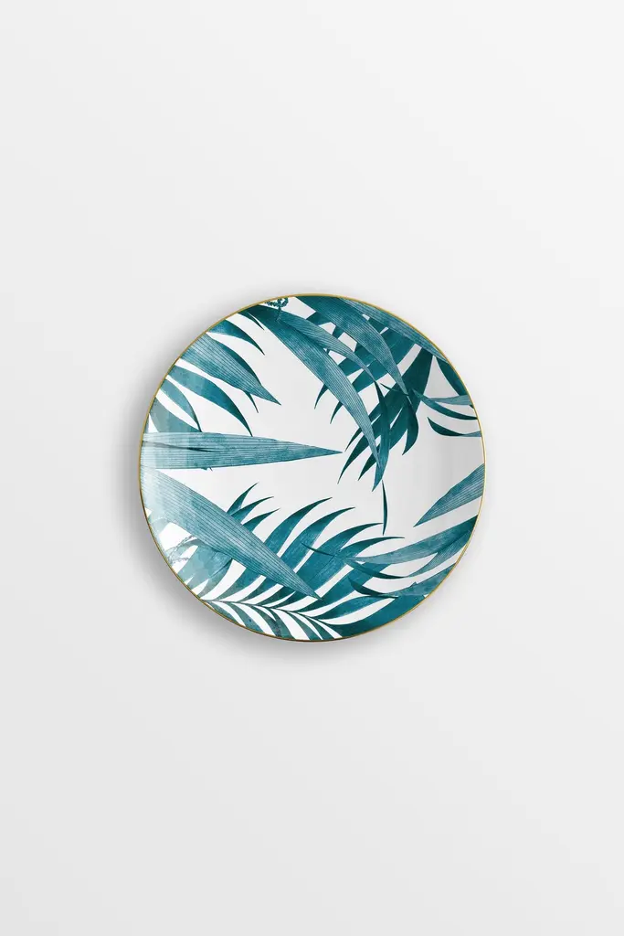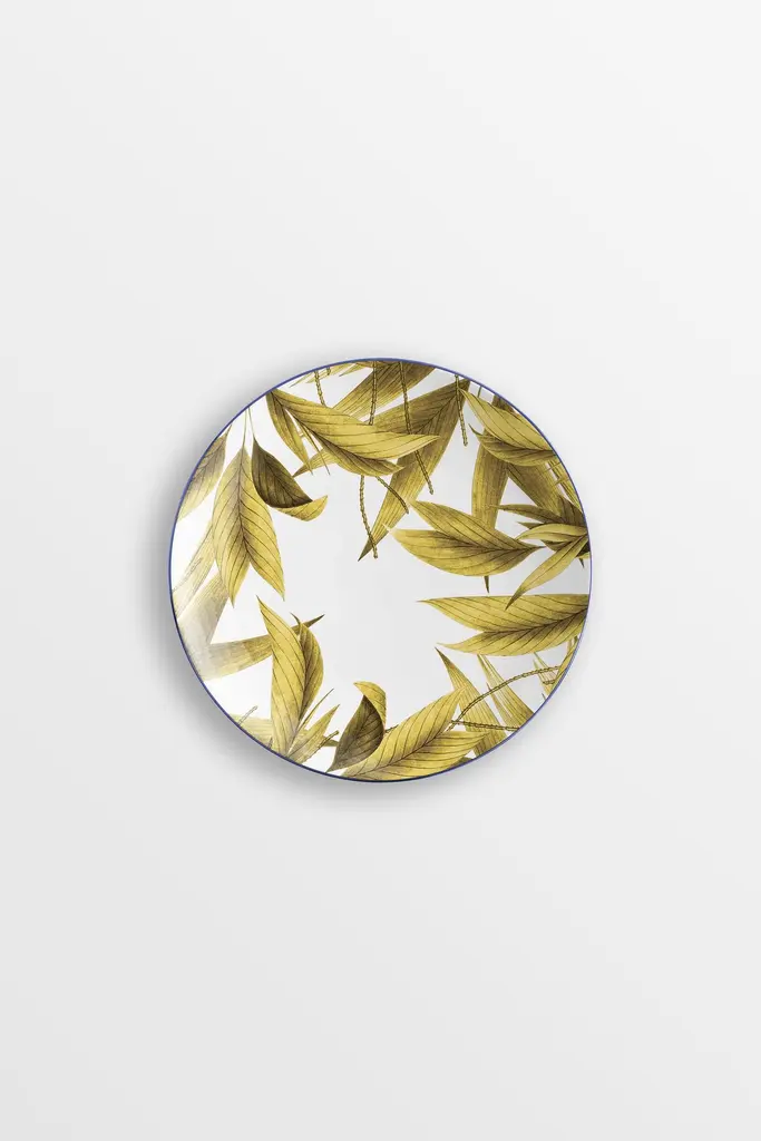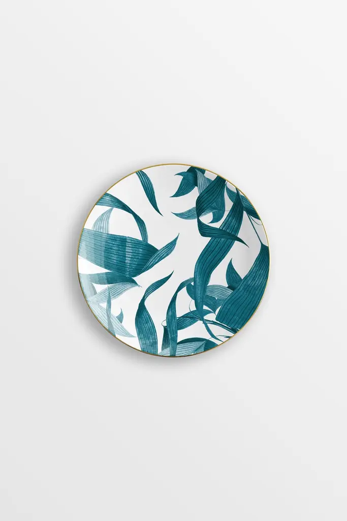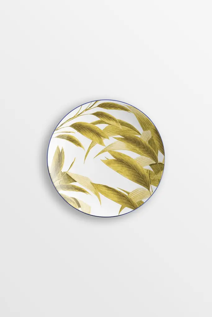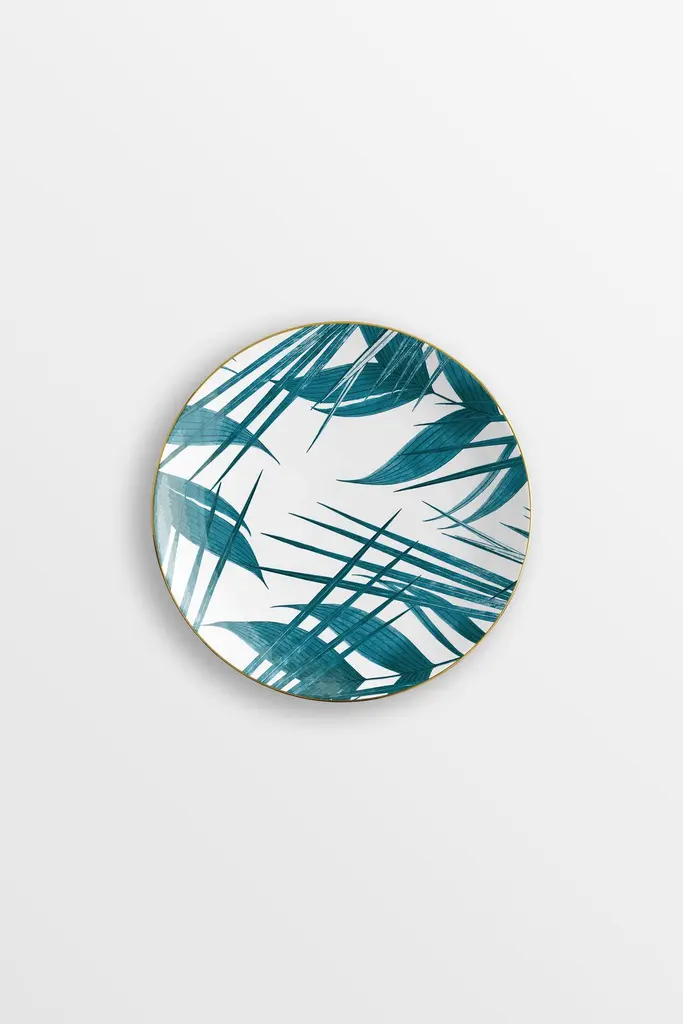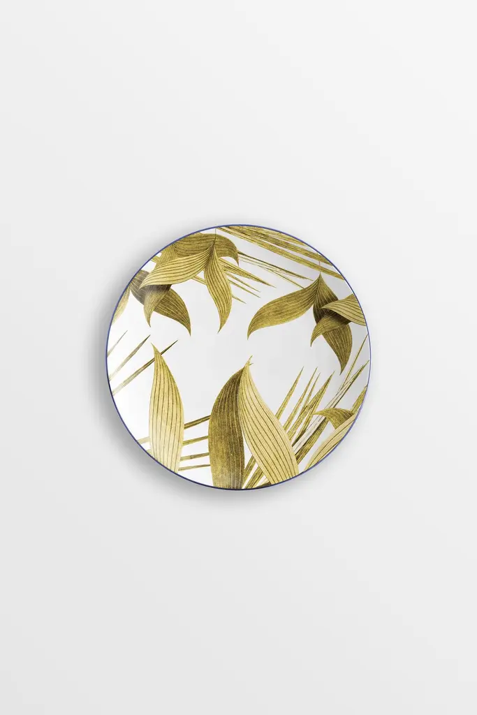 The Las Palmas Porcelain Collection owes its name to the city of Palmas, in Brazil. It is a true tribute to palm trees, whether it is their leaves, the whole plant, or even the landscape in which they live and thrive. The varied species represented on these exotic plates, characterized by two colors, blue and golden yellow, lend their shapes to create a dreamy and vibrant imagery, suitable for any setting, from the most formal to the most elegant.6 bread plates.