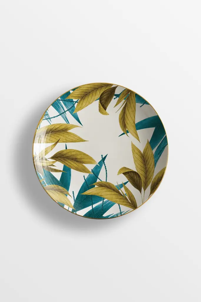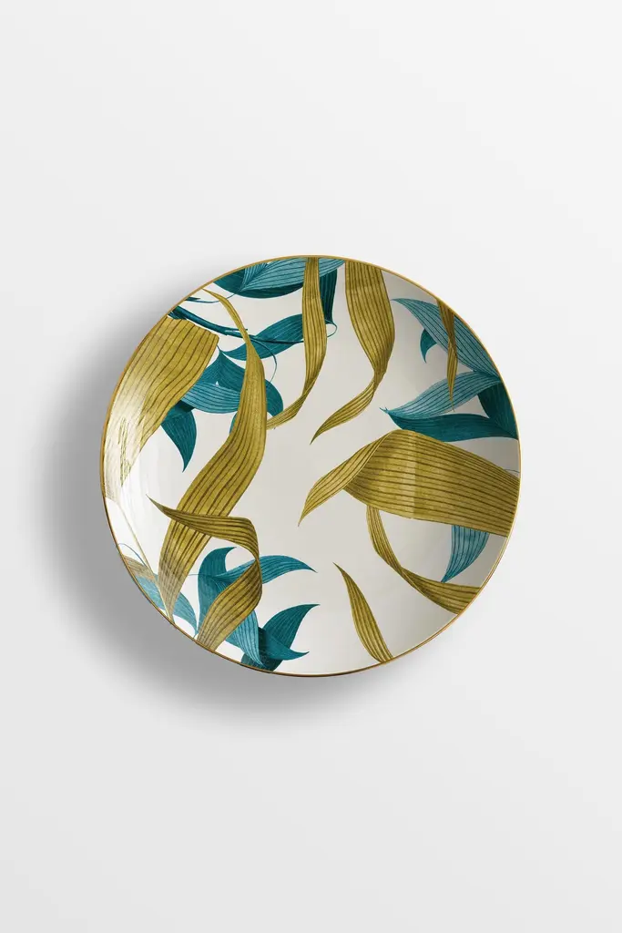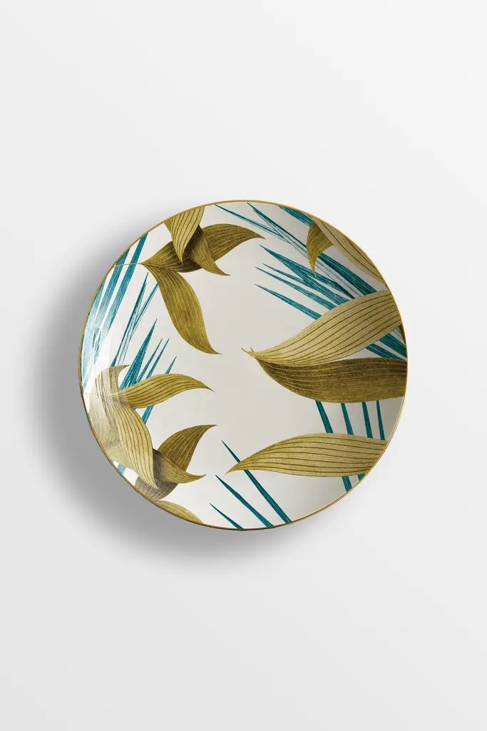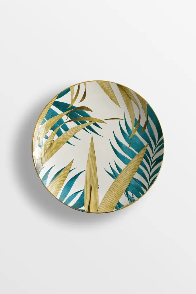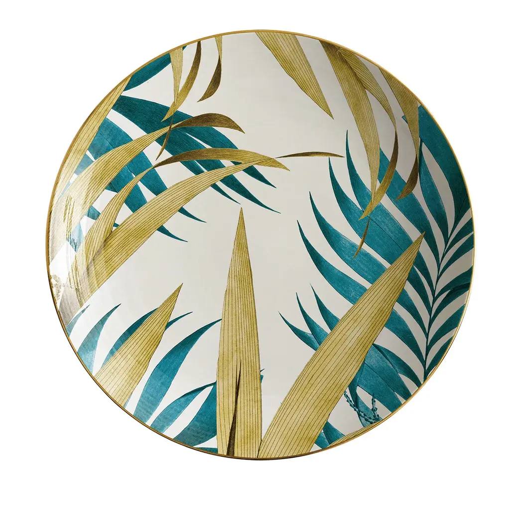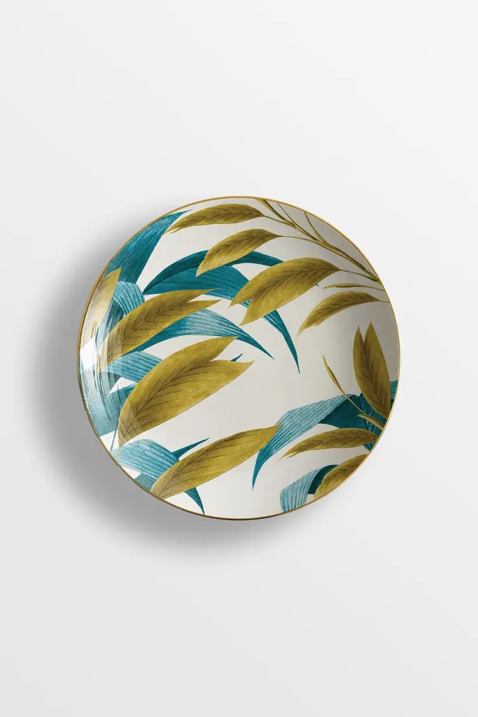 The Las Palmas Porcelain Collection owes its name to the city of Palmas, in Brazil. It is a true tribute to palm trees, whether it is their leaves, the whole plant, or even the landscape in which they live and thrive. The varied species represented on these exotic plates, characterized by two colors, blue and golden yellow, lend their shapes to create a dreamy and vibrant imagery, suitable for any setting, from the most formal to the most elegant.6 Soup plates.