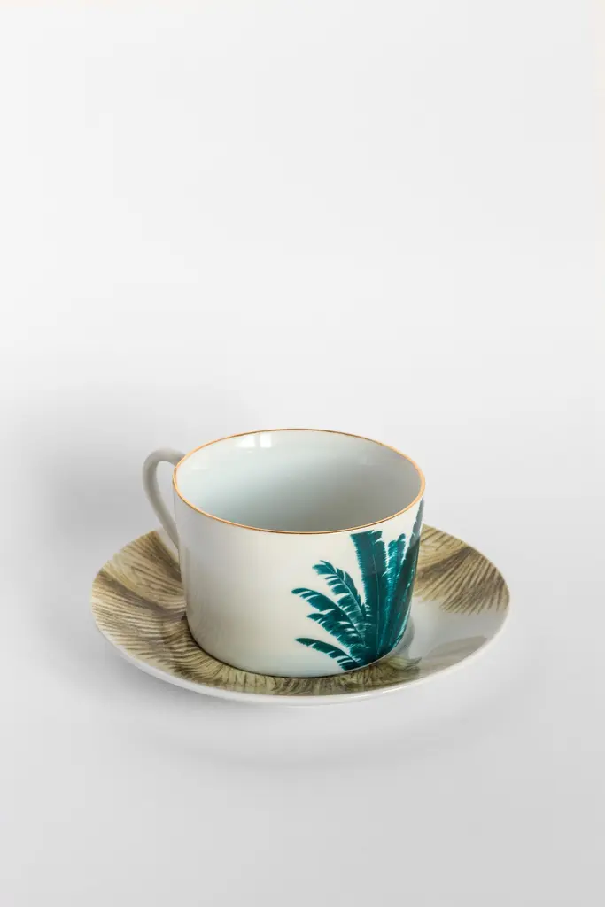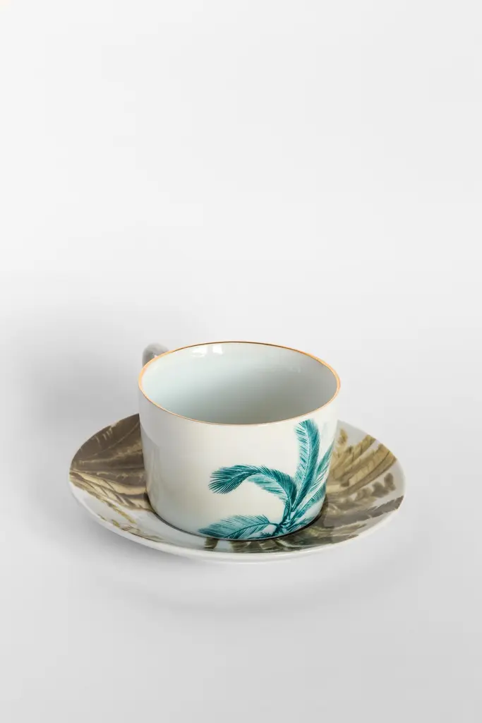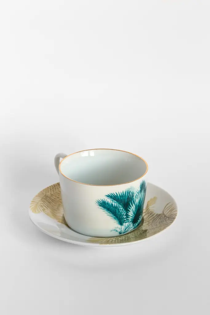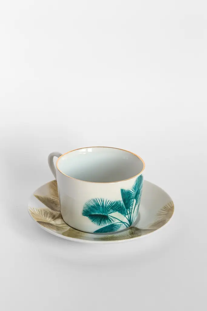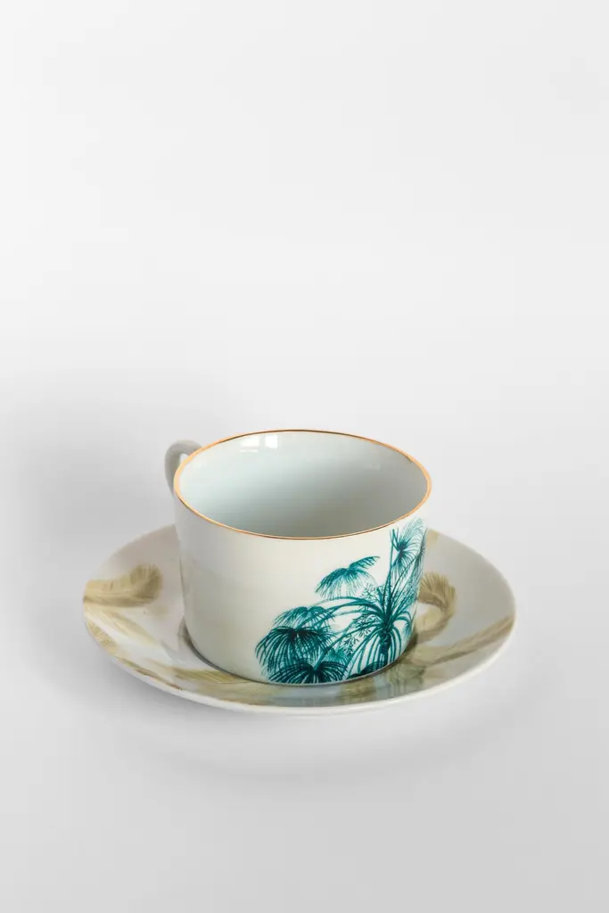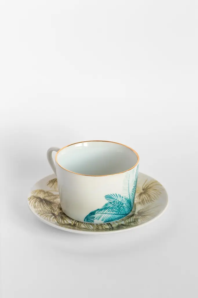 The Las Palmas Porcelain Collection owes its name to the city of Palmas, in Brazil. It is a true tribute to palm trees, whether it is their leaves, the whole plant, or even the landscape in which they live and thrive. The varied species represented on these exotic plates, characterized by two colors, blue and golden yellow, lend their shapes to create a dreamy and vibrant imagery, suitable for any setting, from the most formal to the most elegant.Tea set with 6 coffee cups and plates.