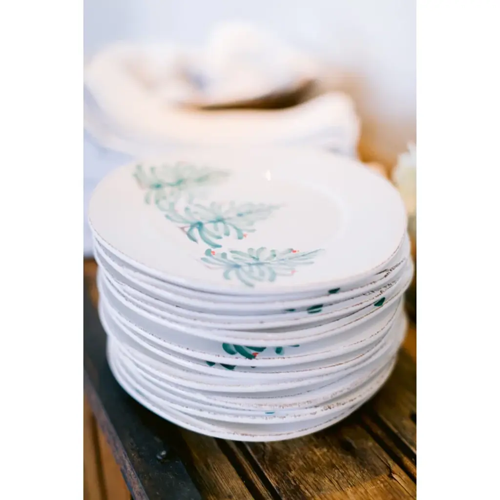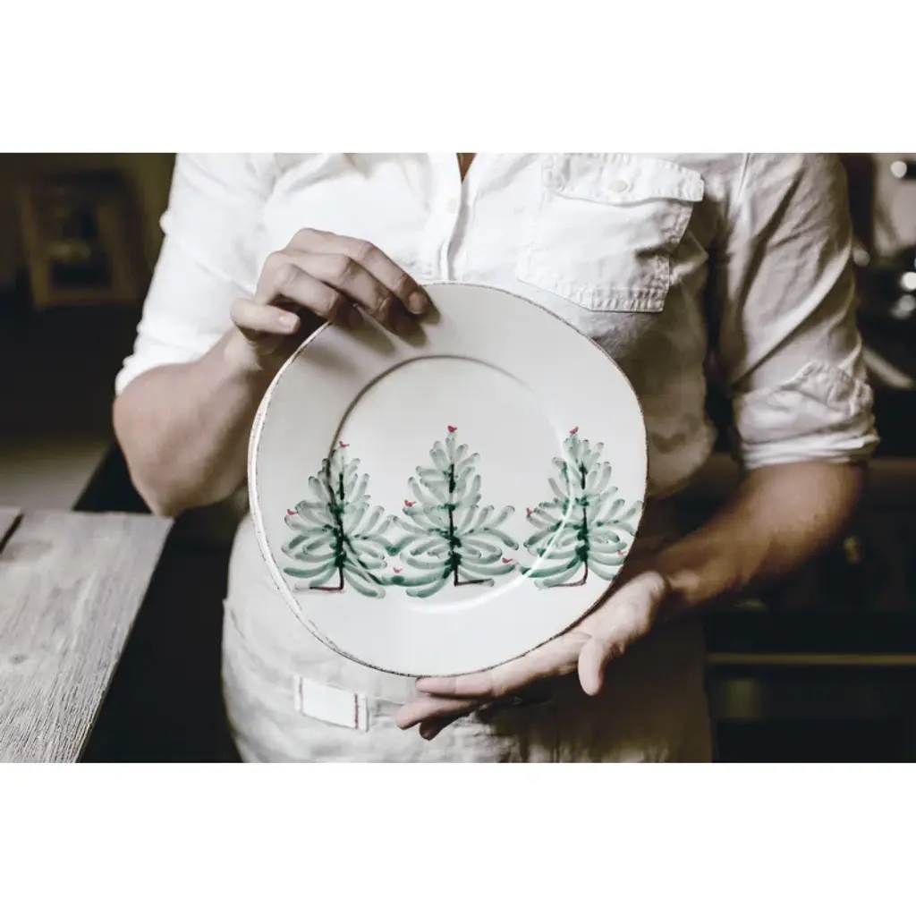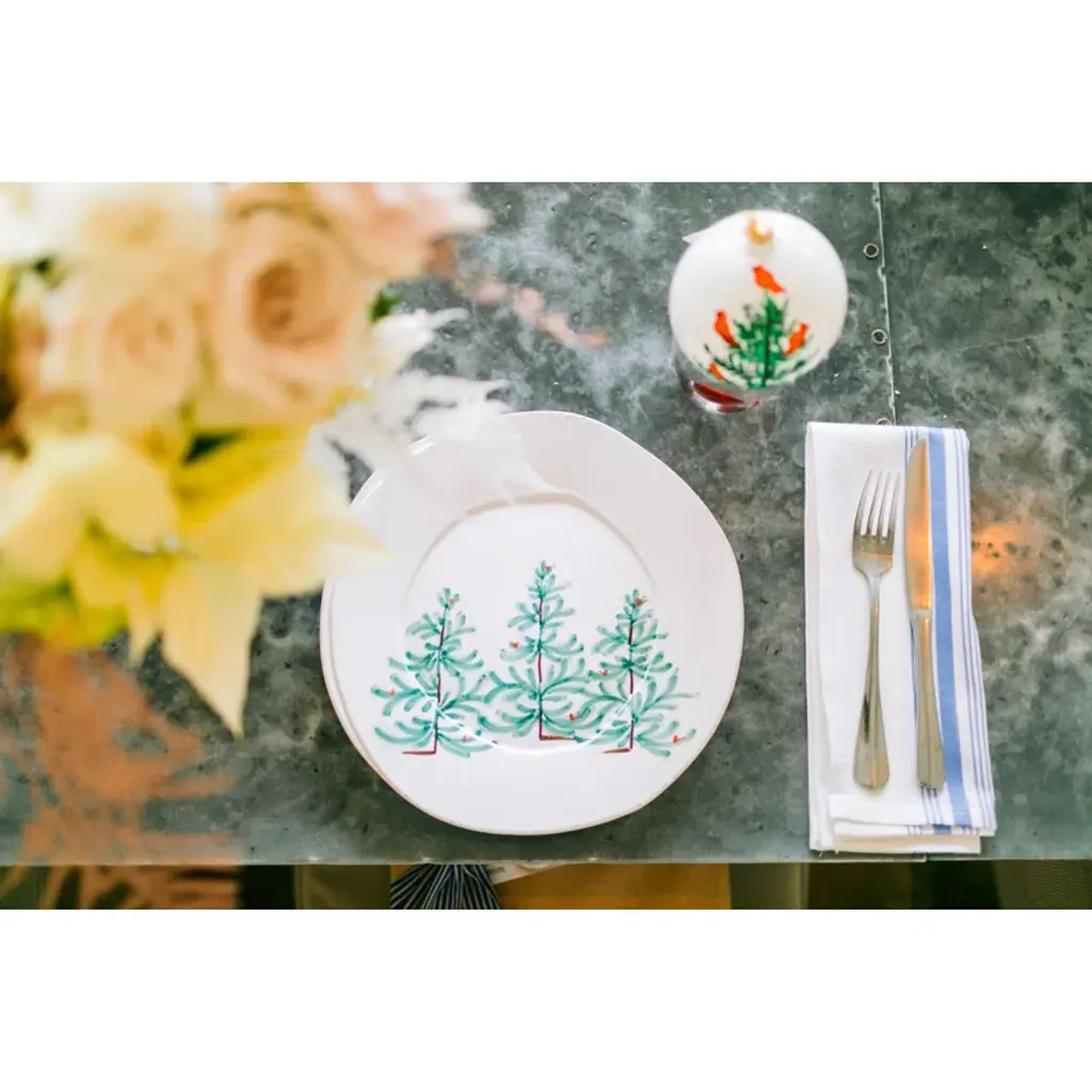 Delight in the holiday magic as handpainted fir trees and bright cardinals drift across the fresh white canvas of the Lastra holiday salad plate. Mix and match with the Lastra collection for a fun and sophisticated holiday table. Handpainted on Italian stoneware in Tuscany.