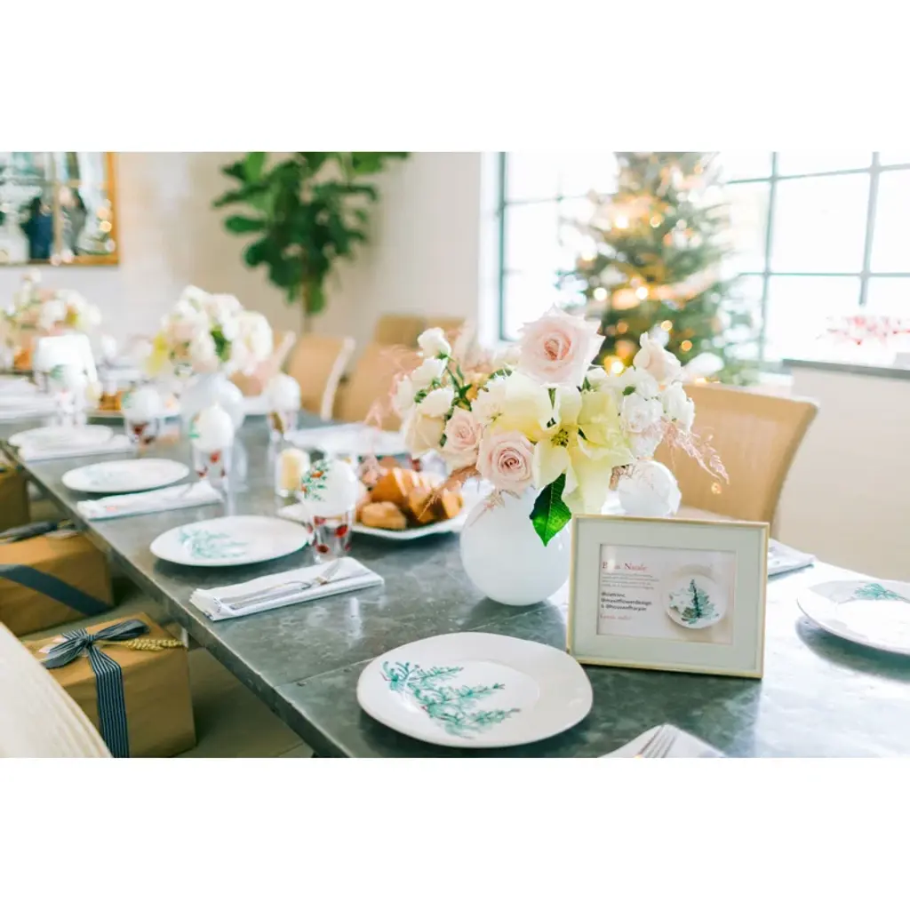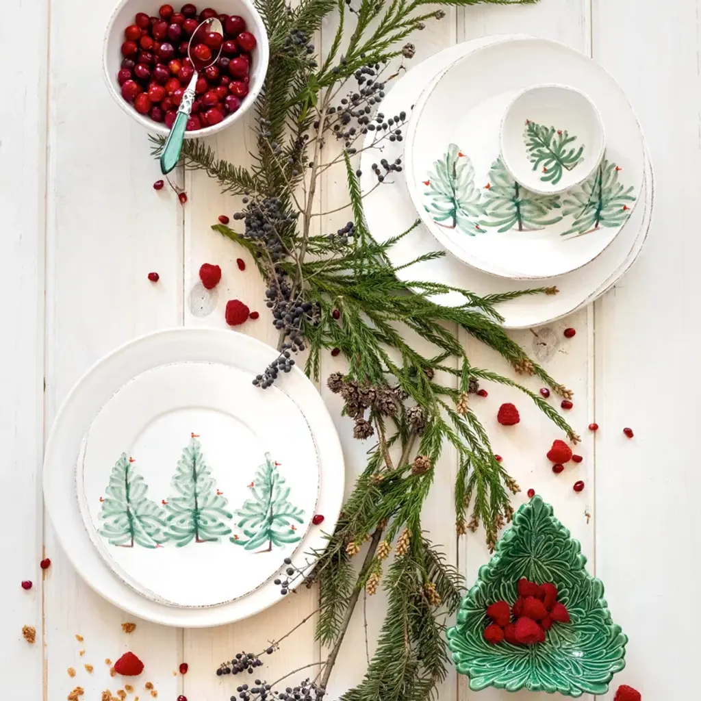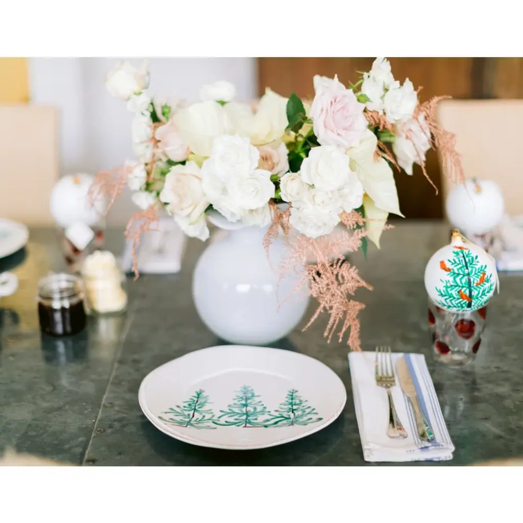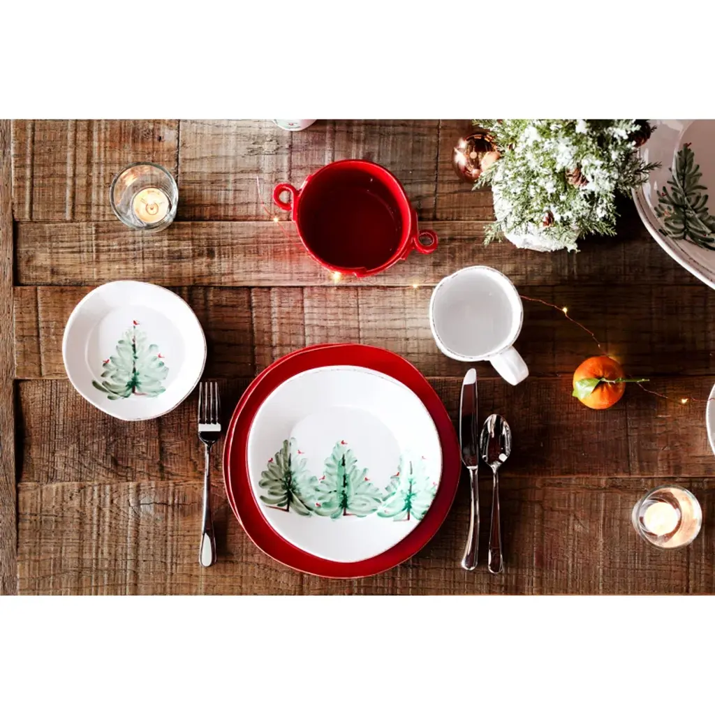 Delight in the holiday magic as handpainted fir trees and bright cardinals drift across the fresh white canvas of the Lastra holiday salad plate. Mix and match with the Lastra collection for a fun and sophisticated holiday table. Handpainted on Italian stoneware in Tuscany.