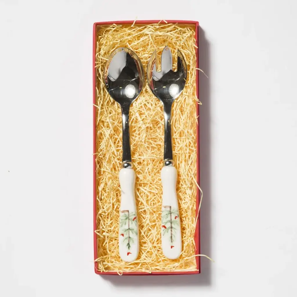 Add a festive touch to your table setting with this delightful pair of salad servers. Handmade from high-quality 18/10 stainless steel, these servers feature ceramic handles adorned with a holiday-inspired pattern. They're not only attractive but also practical, as they're dishwasher, microwave, freezer, and oven-safe. So go ahead, serve up your favorite salads and sides with these cheerful servers, and bring a little extra joy to your gatherings. Just remember, they're designed for residential use only.