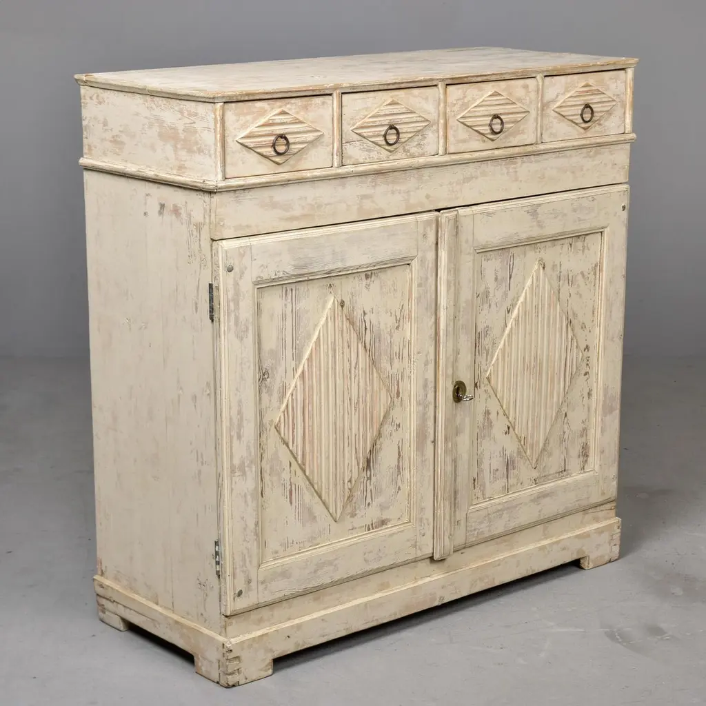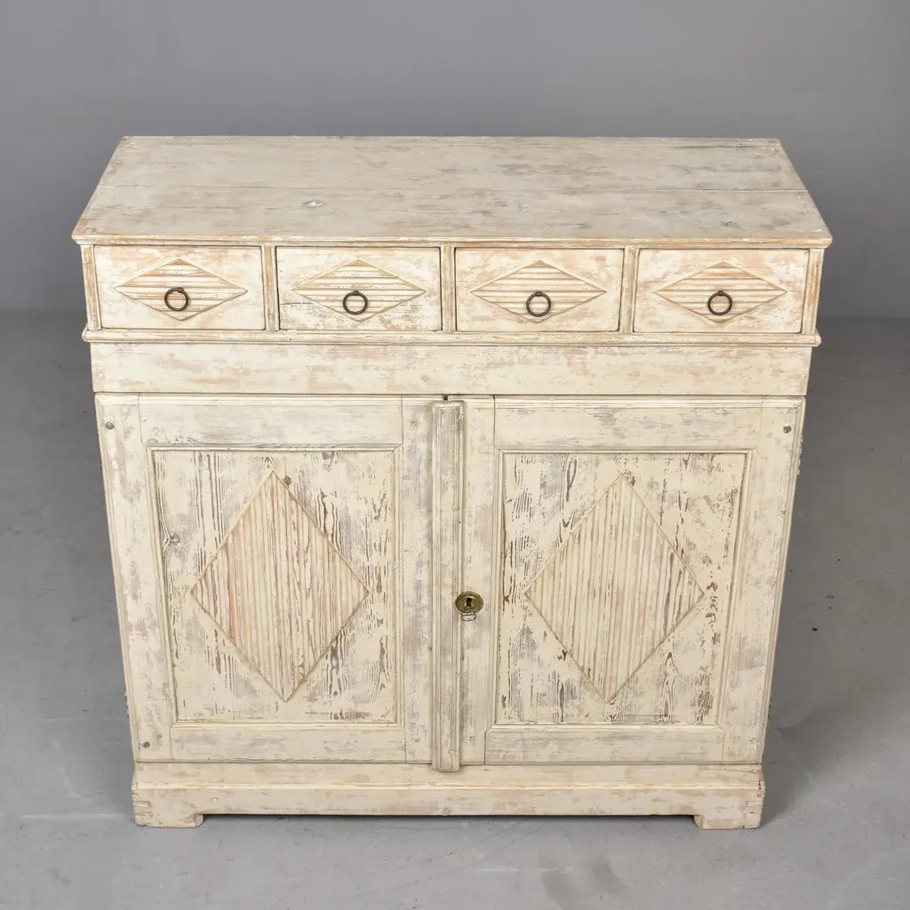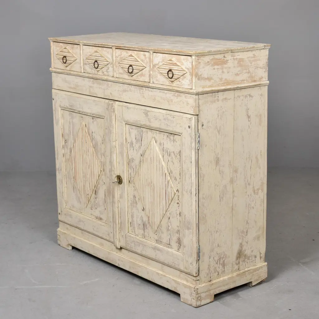 Found in Sweden, this cabinet dates from the 1880s. Tall cabinet with antique white / cream colored painted finish. Top section features four functional drawers with ring-pull hardware and dovetail construction. Bottom cabinet features a functional lock and single internal fixed shelf. Decorative elements include ridged/carved diamond shapes on drawer fronts and cabinet doors. Unknown maker. Heavy, sturdy construction in very good antique condition with some visible wear to painted surface.