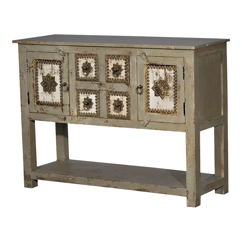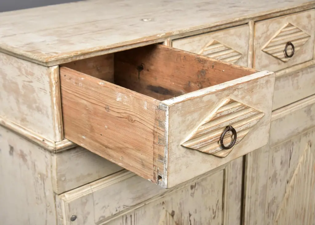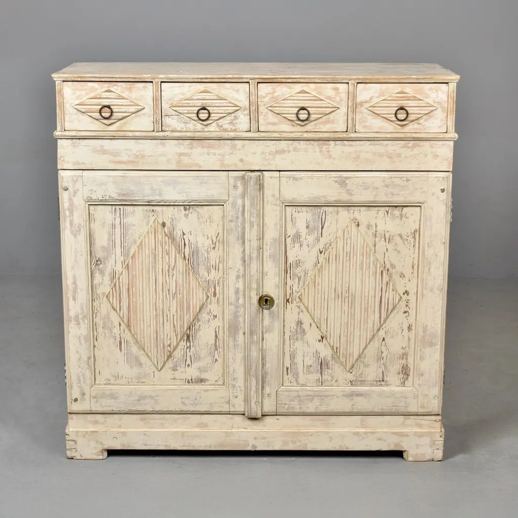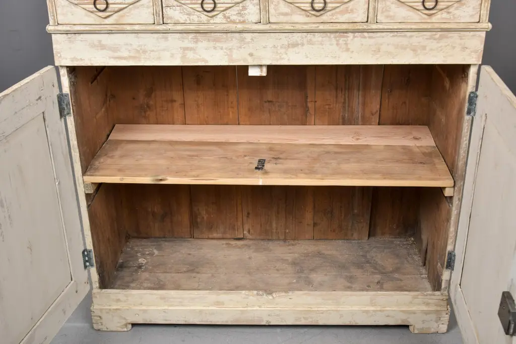 Found in Sweden, this cabinet dates from the 1880s. Tall cabinet with antique white / cream colored painted finish. Top section features four functional drawers with ring-pull hardware and dovetail construction. Bottom cabinet features a functional lock and single internal fixed shelf. Decorative elements include ridged/carved diamond shapes on drawer fronts and cabinet doors. Unknown maker. Heavy, sturdy construction in very good antique condition with some visible wear to painted surface.