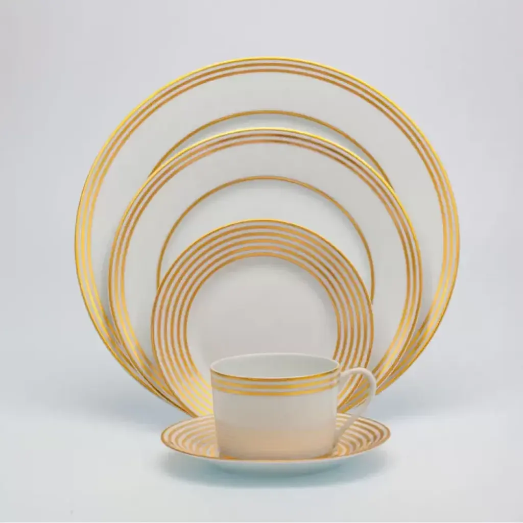 A classic pattern from Royal Limoges, Latitudes dinnerware features a multi gold band design on white porcelain. Five-piece place setting includes dinner plate, dessert plate, bread/butter plate, teacup, and saucer. As the oldest porcelain factory in the French city of Limoges, Royal Limoges boasts a long history of creating hand crafted dinnerware from its own kaolin clay. Since 1797, its exclusive patterns have been enjoyed by clients worldwide.