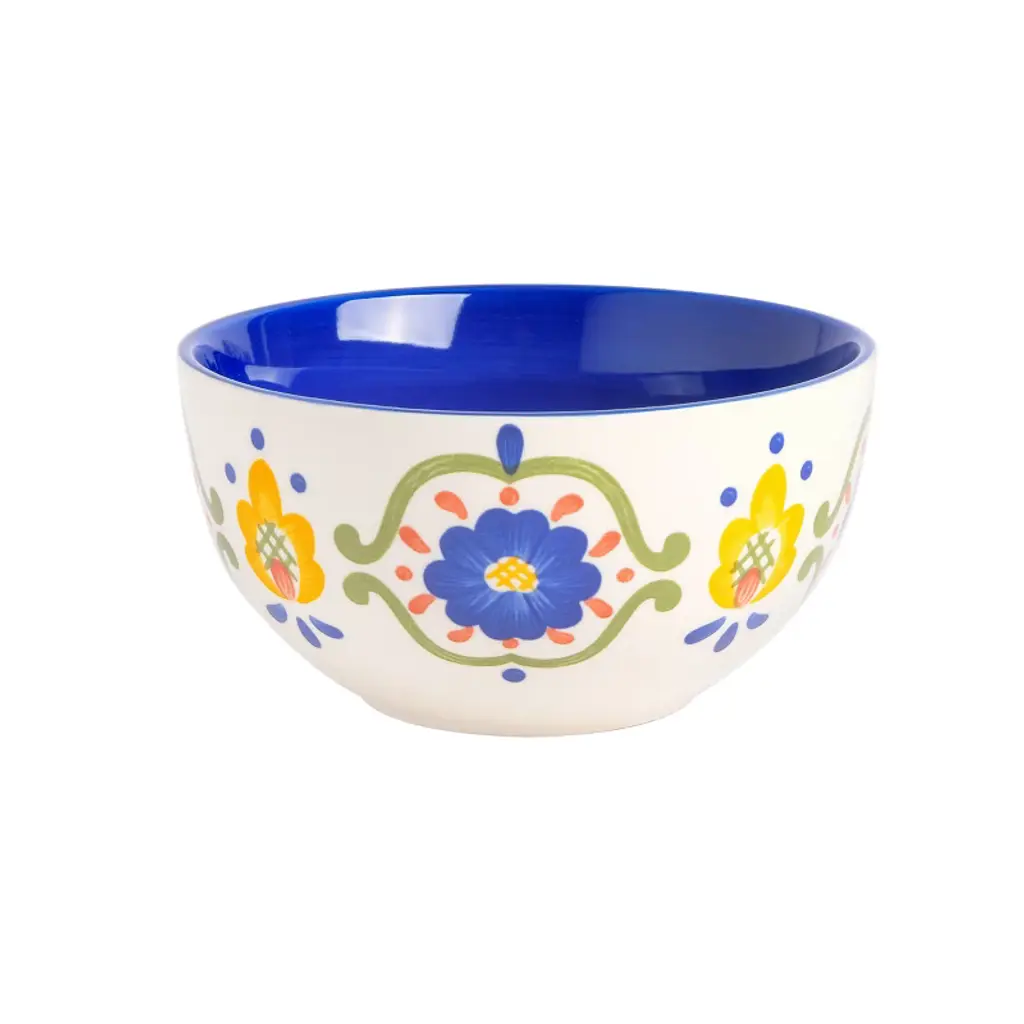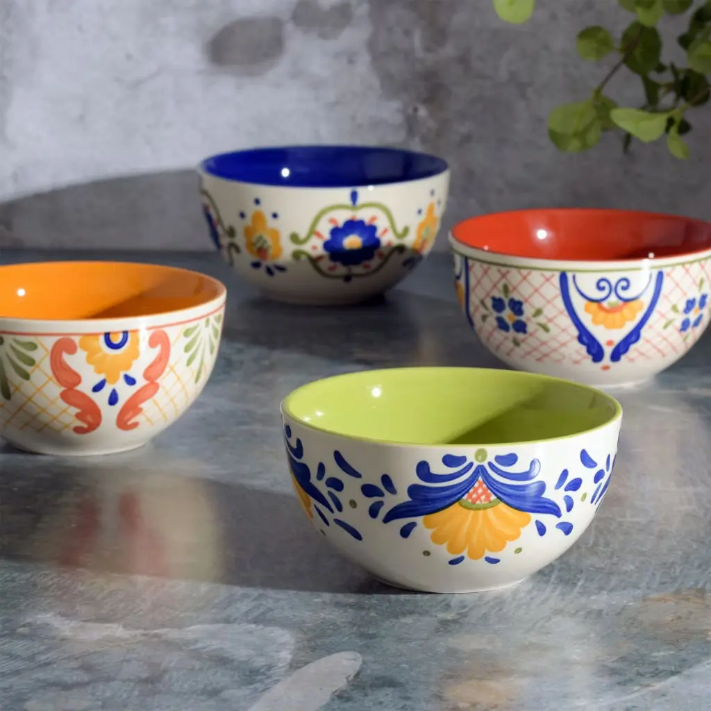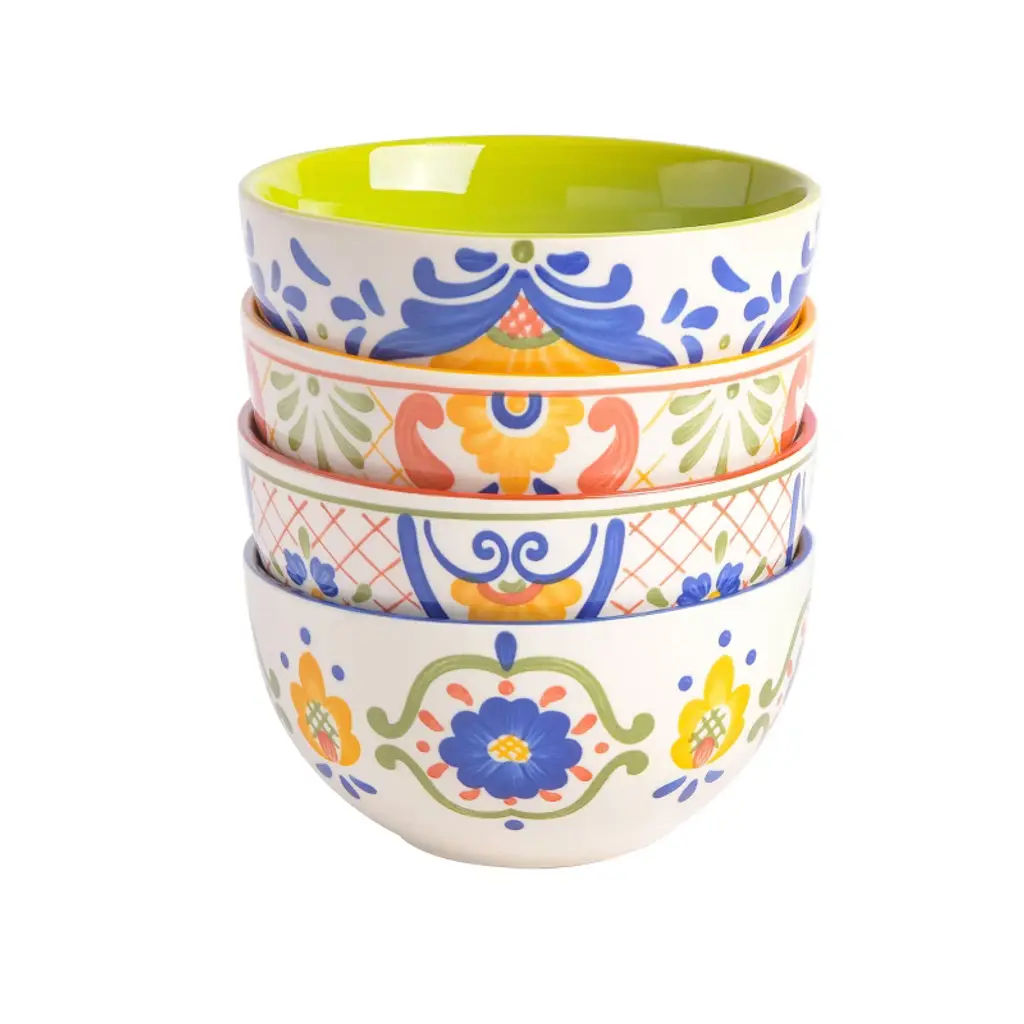 The Laurie Gates Tierra 4 Piece 6 Inch Stoneware Cereal Bowl Set in Assorted Designs welcomes anyone to the table with a warm embrace. Every bowl features it's own unique hand painted floral design along the exterior and vibrant color within the interior. The stoneware body allows for easy practicality with its microwave safe and dishwasher safe capabilities. Serve guests warm soups, enjoy your favorite cereals, or have the family snack away fresh fruits. Includes: Four 6" Bowls