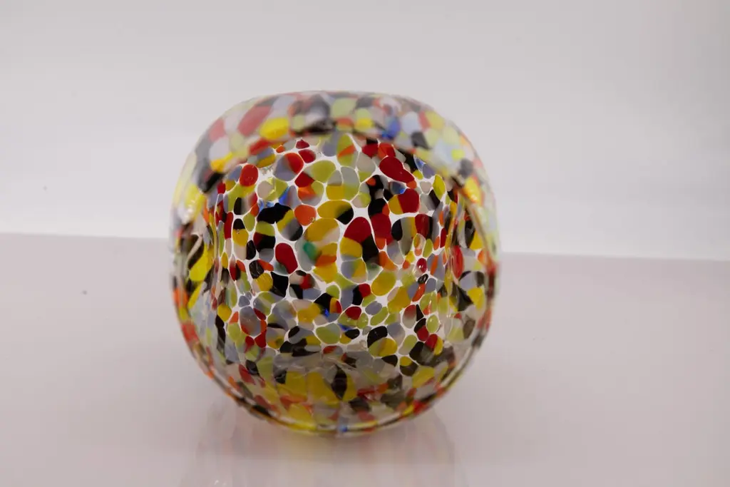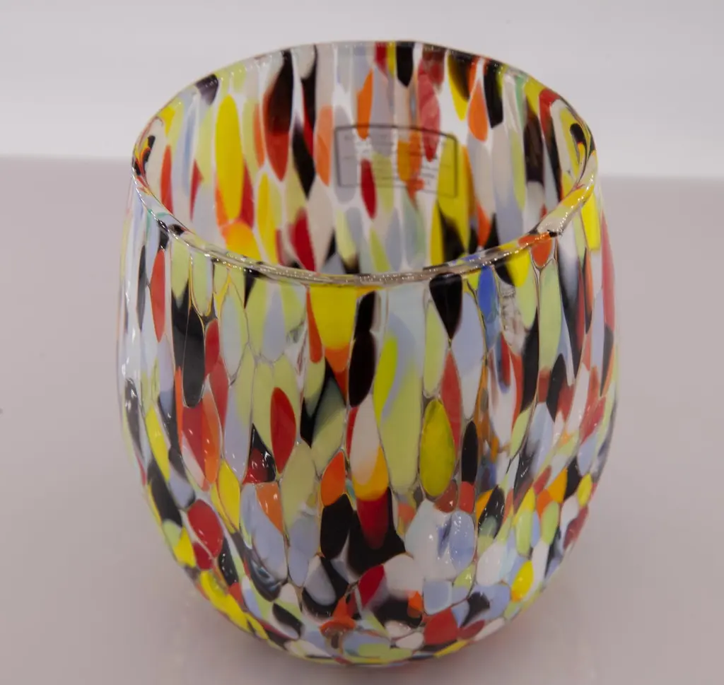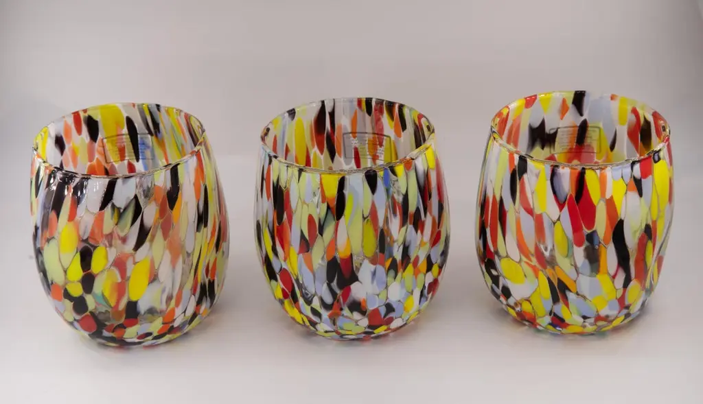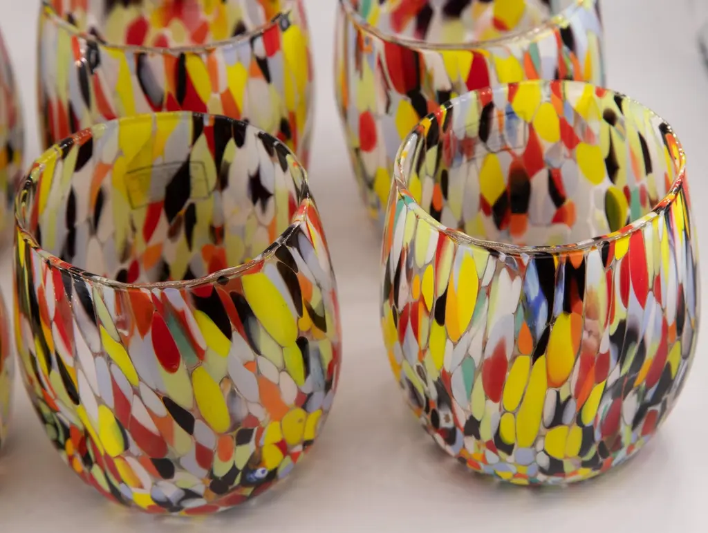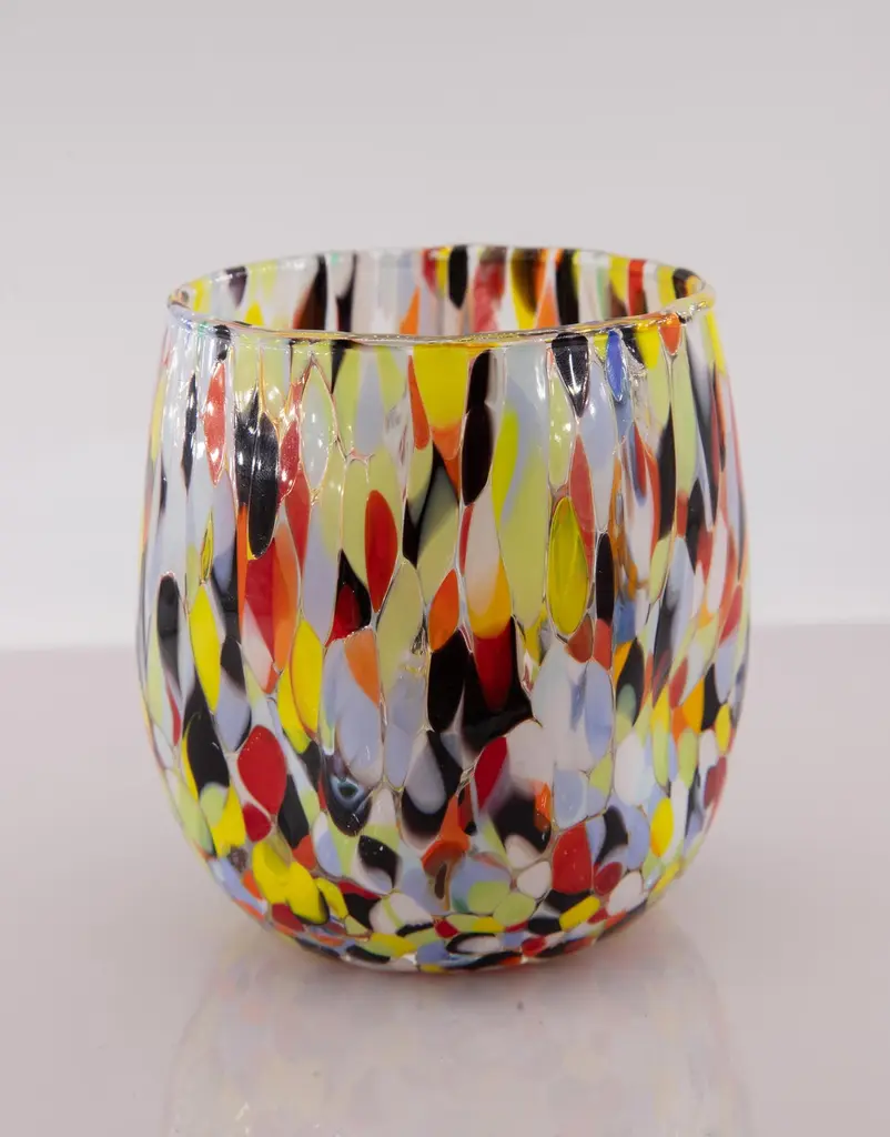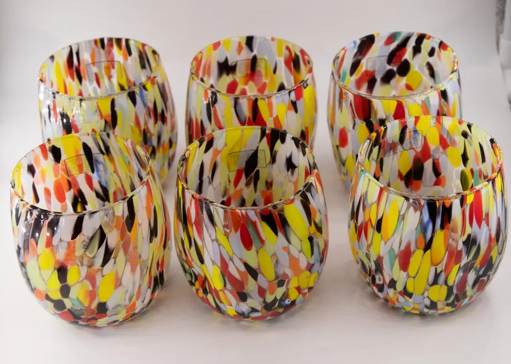 Set of six water/drink/wine glasses color Arlecchino - Murano glass - Made in Italy.These individual Murano glasses are inspired by the classic "Goto Botte" Murano glass.Other colors available: harlequin, petrol green, blue, red, ivory, periwinkle, mustard.These are typical Venetian glasses blown and opened by hand with the insertion of murrine .Dimensions:Base diameter 7.5 cmMouth diameter 8 cmHeight 10 cmCapacity 300 mlAll products are sent with a stamp of authenticity.Being handcrafted products color and shape may slightly vary.SHIPPING DAMAGES: We ensure extremely professional packaging to preserve the goods. Sometimes damage may occur: in this case, please photograph the broken piece in the packaging and email it immediately