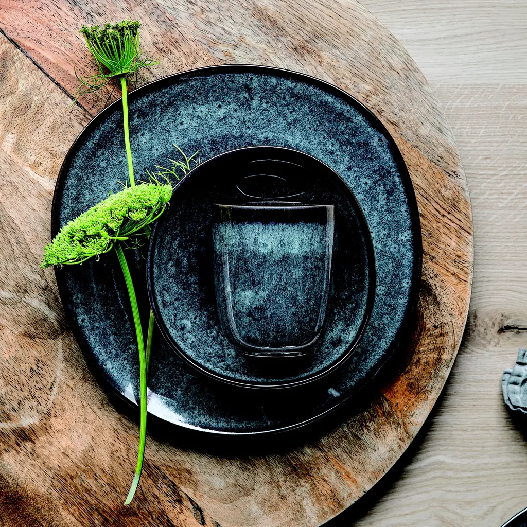 The Lave Stoneware Collection offers artisanal appeal to your tabletop with asymmetrical shapes and a special reactive glaze rendering each piece unique.