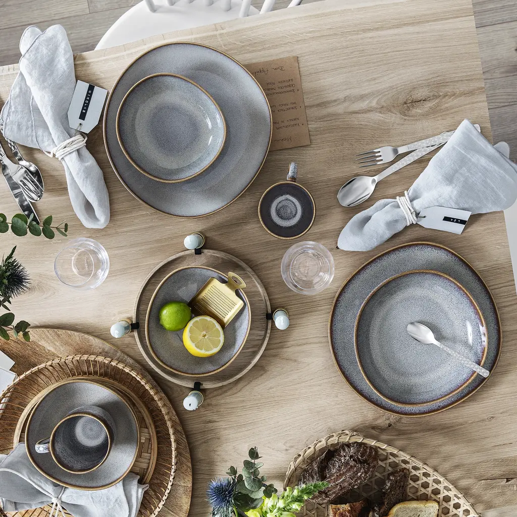 The Lave Stoneware Collection offers artisanal appeal to your tabletop with asymmetrical shapes and a special reactive glaze rendering each piece unique.