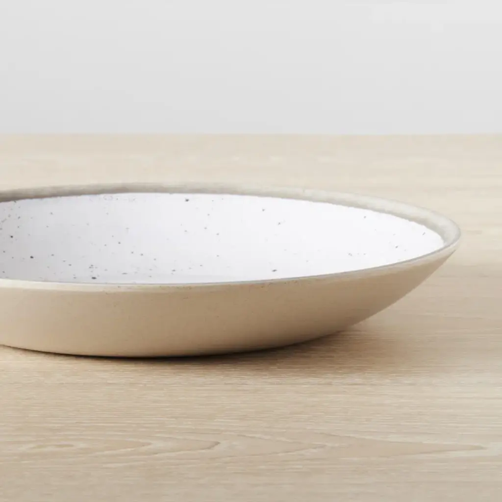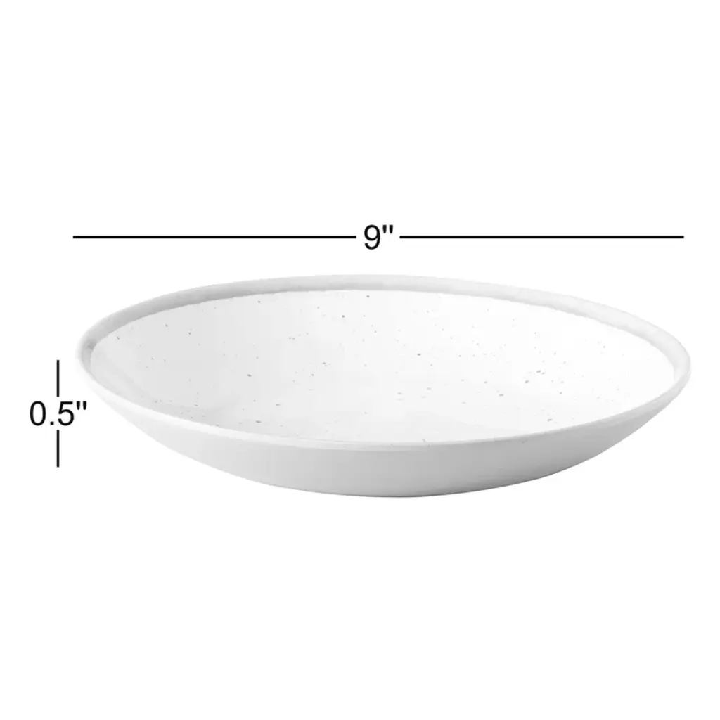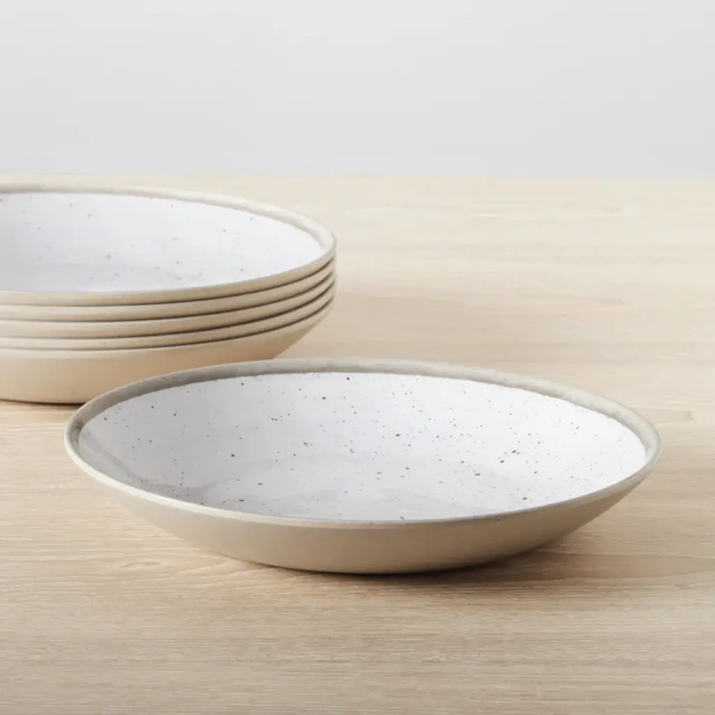 Treat yourself to life's little luxuries with this set of 6 pasta bowls. Crafted from melamine, these plates mimic the look of stoneware artistry while maintaining a lightweight feel. Details include a speckled white glaze and an organic gray rim. They’re sized just right for pastas, soups, and sauce-based dishes and are free of BPA, PTFE, and PFOA. Plus, they're safe to clean in the dishwasher, making them an effortless addition to your collection.