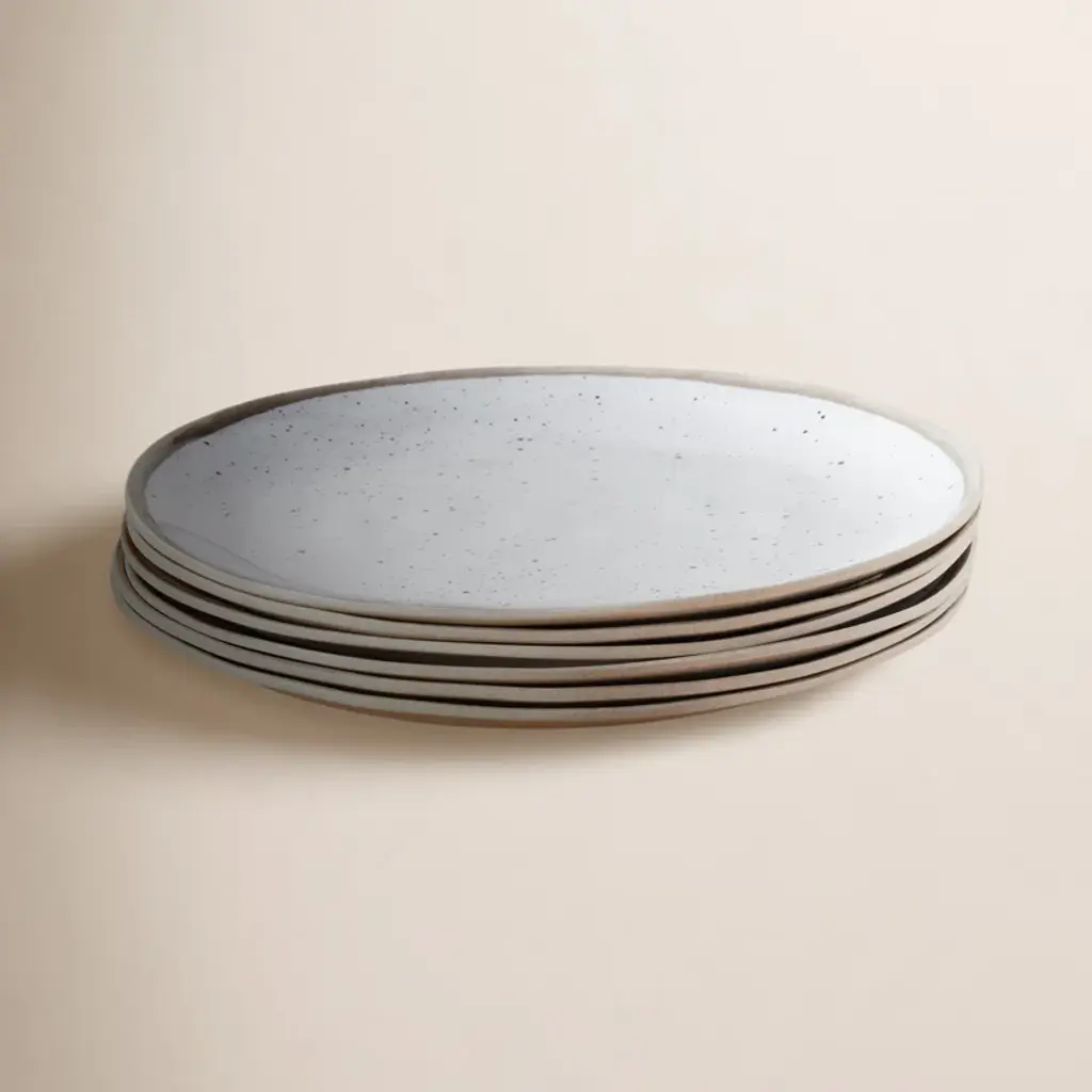 Treat yourself to life's little luxuries with this set of 6 salad plates. Crafted from melamine, these plates mimic the look of stoneware artistry while maintaining a lightweight feel. Details include a speckled white glaze and an organic gray rim. Their size makes them sized just right for salads, appetizers, and pastries. These plates are free of BPA, PTFE, and PFOA. Plus, they're safe to clean in the dishwasher, making them an effortless addition to your collection.
