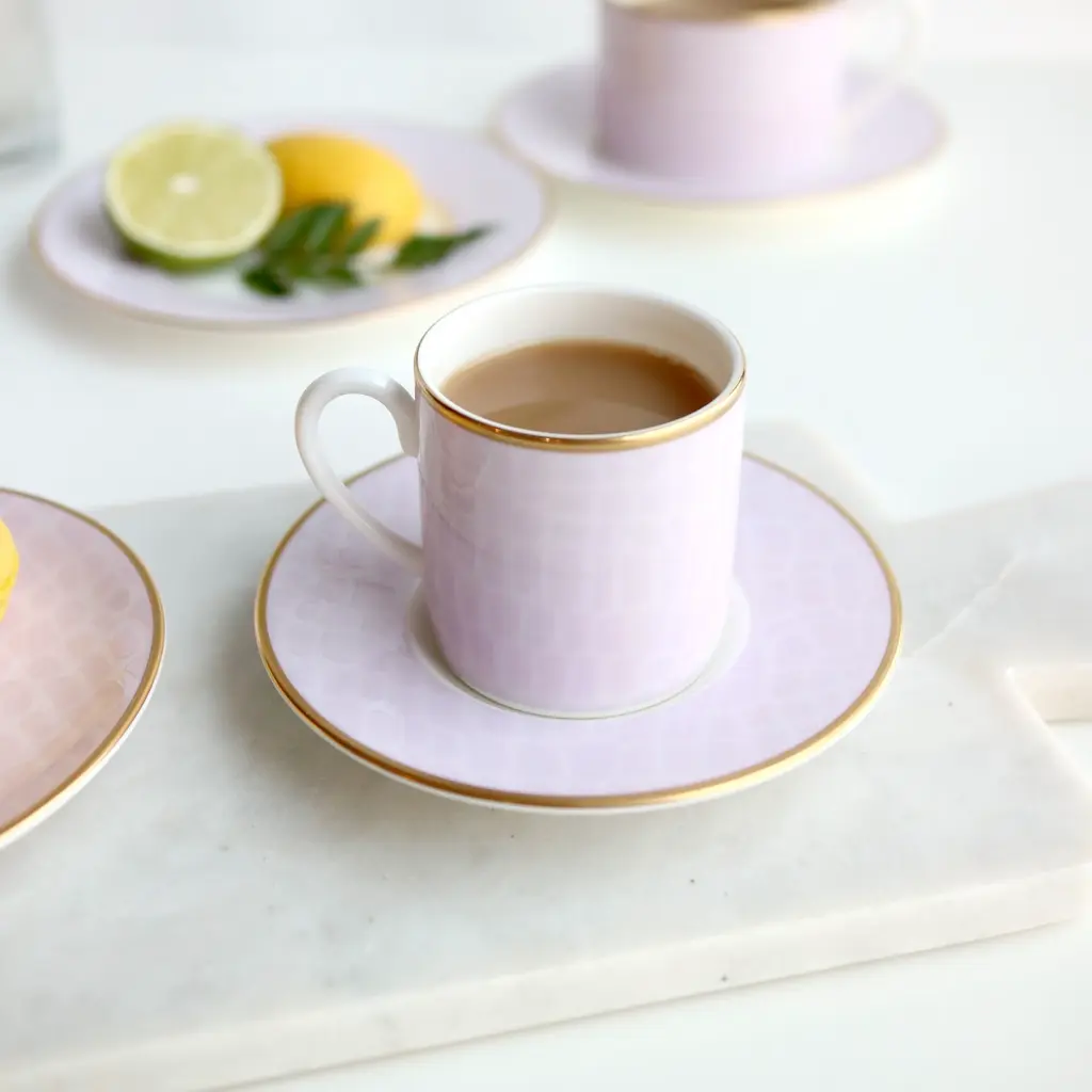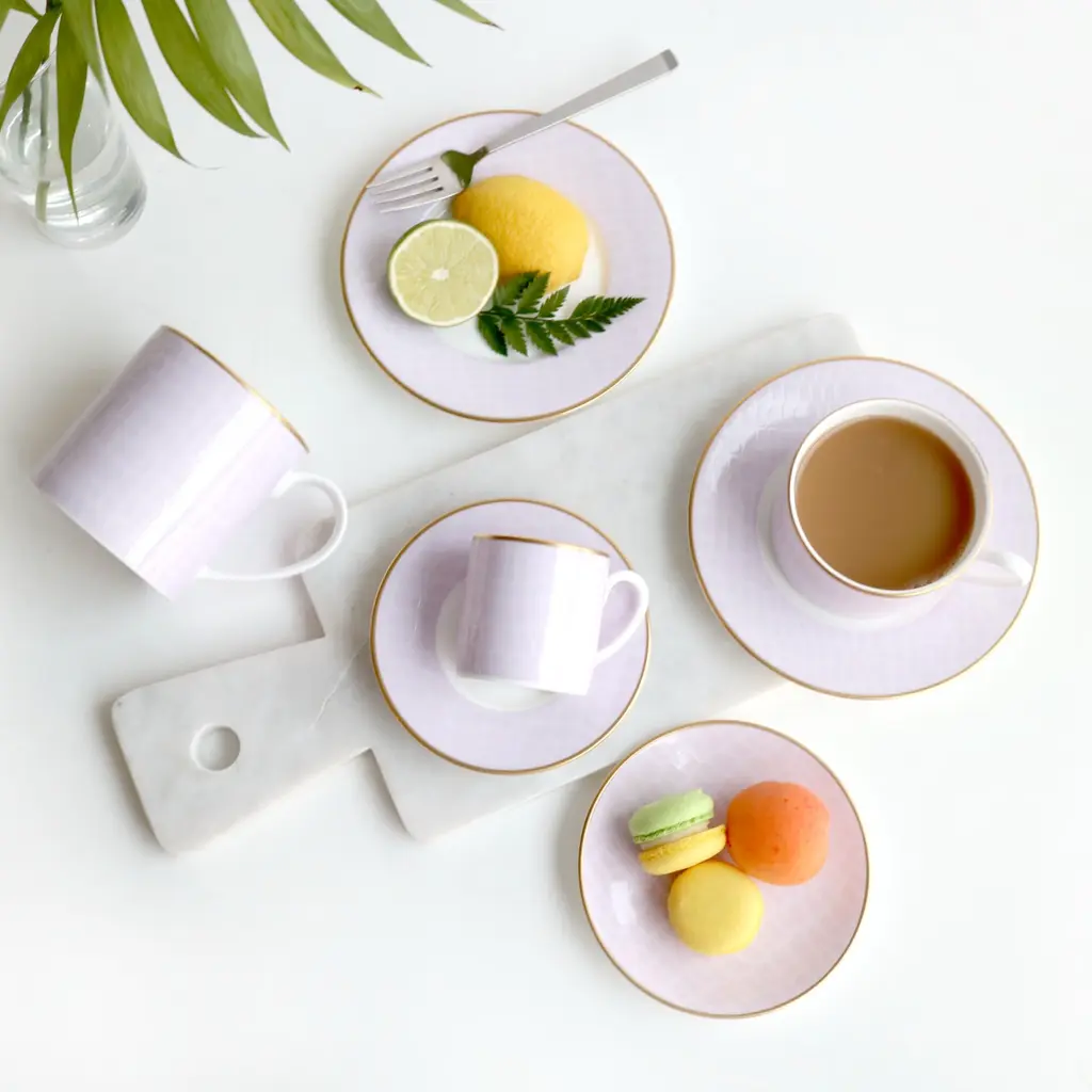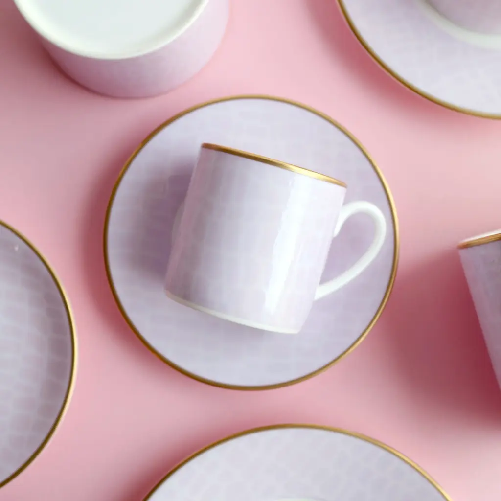 Drawing from the luxurious feel of shagreen and alligator leather, the Charlotte and Layla Collection is a truly special assemblage, designed around the tradition of drinking Tea and Coffee. With style in mind, each item in this collection has a hand-painted 24K gold rim. Textured Luxury from the Charlotte & Layla Collection by Twig New York.Ideal for espressoTwo sets per boxFine Bone China with 24K Gold hand-painted rimCharlotte & Layla Collection