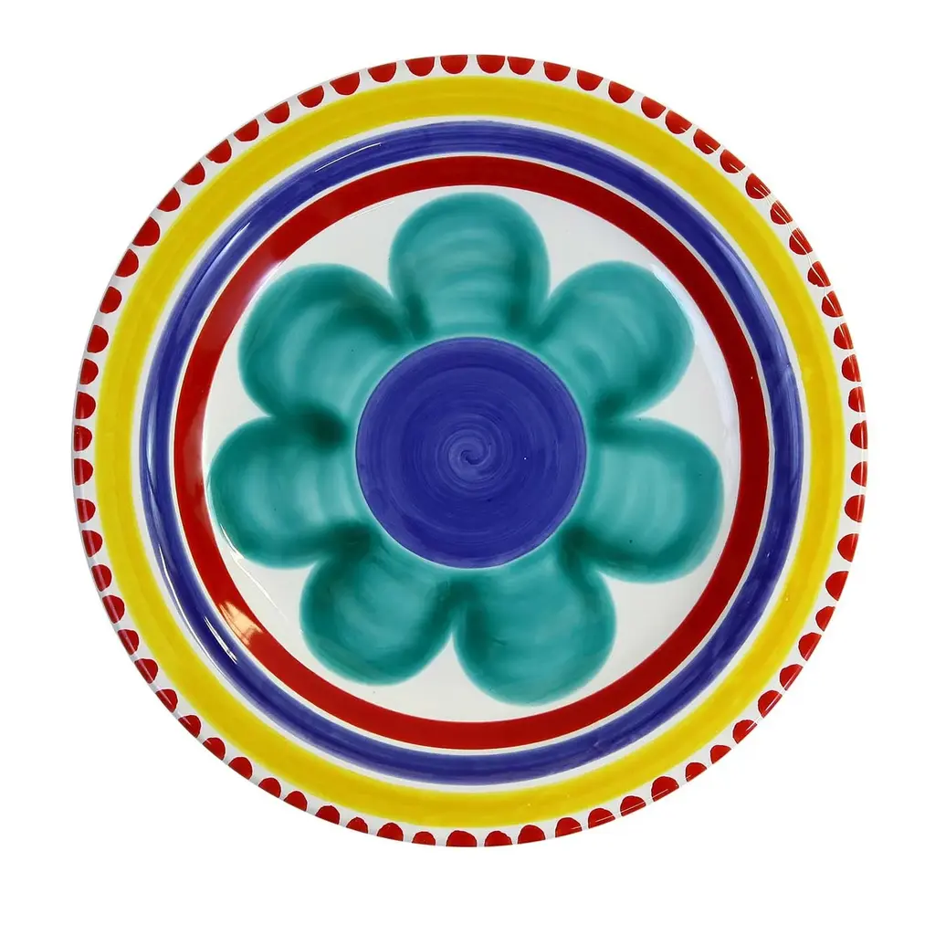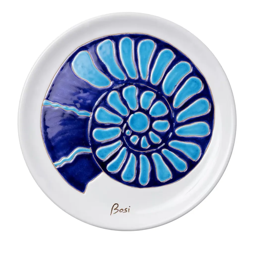 The splendid blue and yellow colors of the seashell enhance the white ceramic plate. Designed by Giorgio Bosi, this expressive decoration is handmade using the graffito method, in which Cerasarda's artisans scratch the terracotta with enamels to create a unique and textural objet d'art.