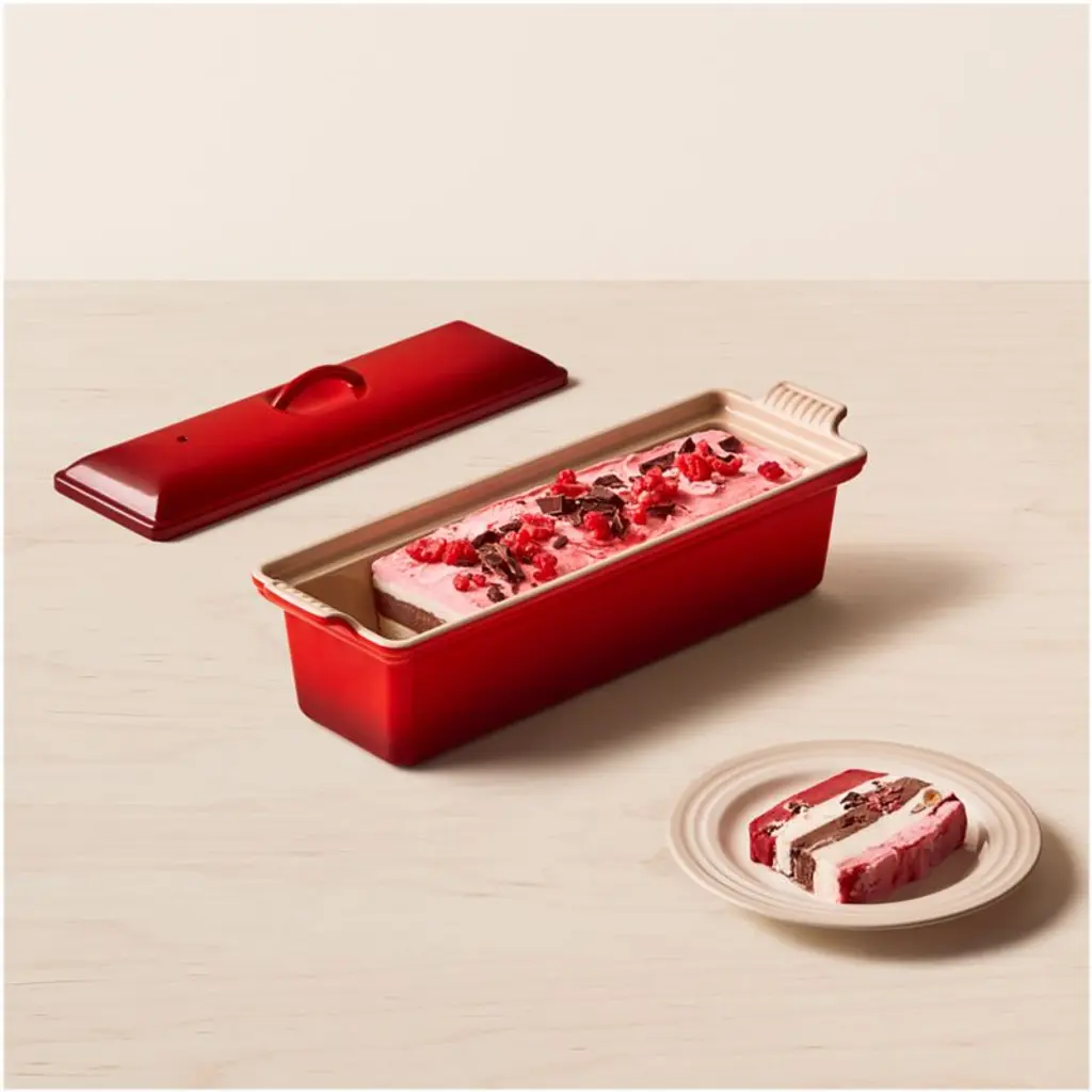 Made with high walls and a tight-fitting lid, this pan is designed to mold and slow cook terrines for a compact, evenly cooked and sliceable loaf. Like Le Creuset's famed cookware, the pan is made of cast iron with excellent heat retention and distribution. The cherry-red enamel glaze makes the pan impervious to stains and odors and chip-, crack- and scratch-resistant. Try your hand at a classic terrine or use the pan to bake bread, custard, lasagna or meatloaf.Revered by both professional chefs and home cooks since its 1925 debut, Le Creuset's classic cookware is prized for its utilitarian beauty and unsurpassed heat retention.