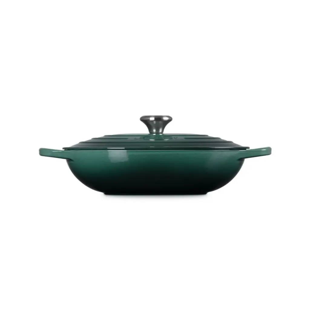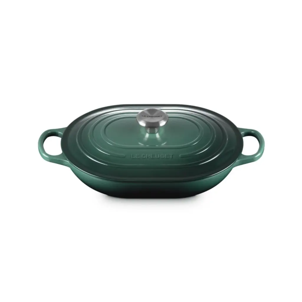 Porcelain enamel coats this display-worthy casserole dish in a deep green hue inspired by artichokes. The shallow oval shape accommodates fish, large cuts of meat or vegetables and roasts them to perfection. Or top the baking pan with the lid to bake deliciously moist casseroles. Cast iron offers impeccable heat distribution and retention, while the enameled surface minimizes sticking and staining. Designed with sloped sides for effortless serving, the covered casserole goes beautifully from stove to oven to table and cleans up easily in the dishwasher.Revered by both professional chefs and home cooks since its 1925 debut, Le Creuset's classic French cookware is prized for its utilitarian beauty and unsurpassed heat retention.