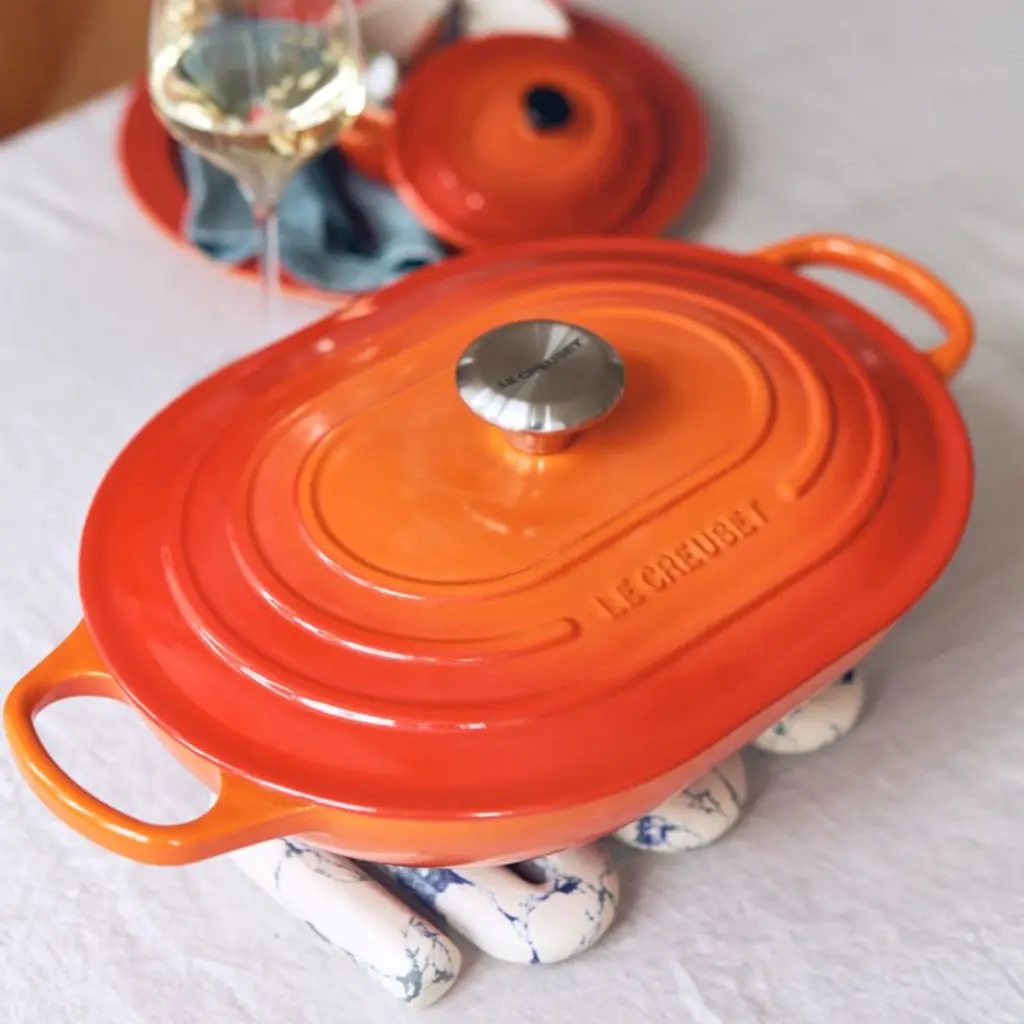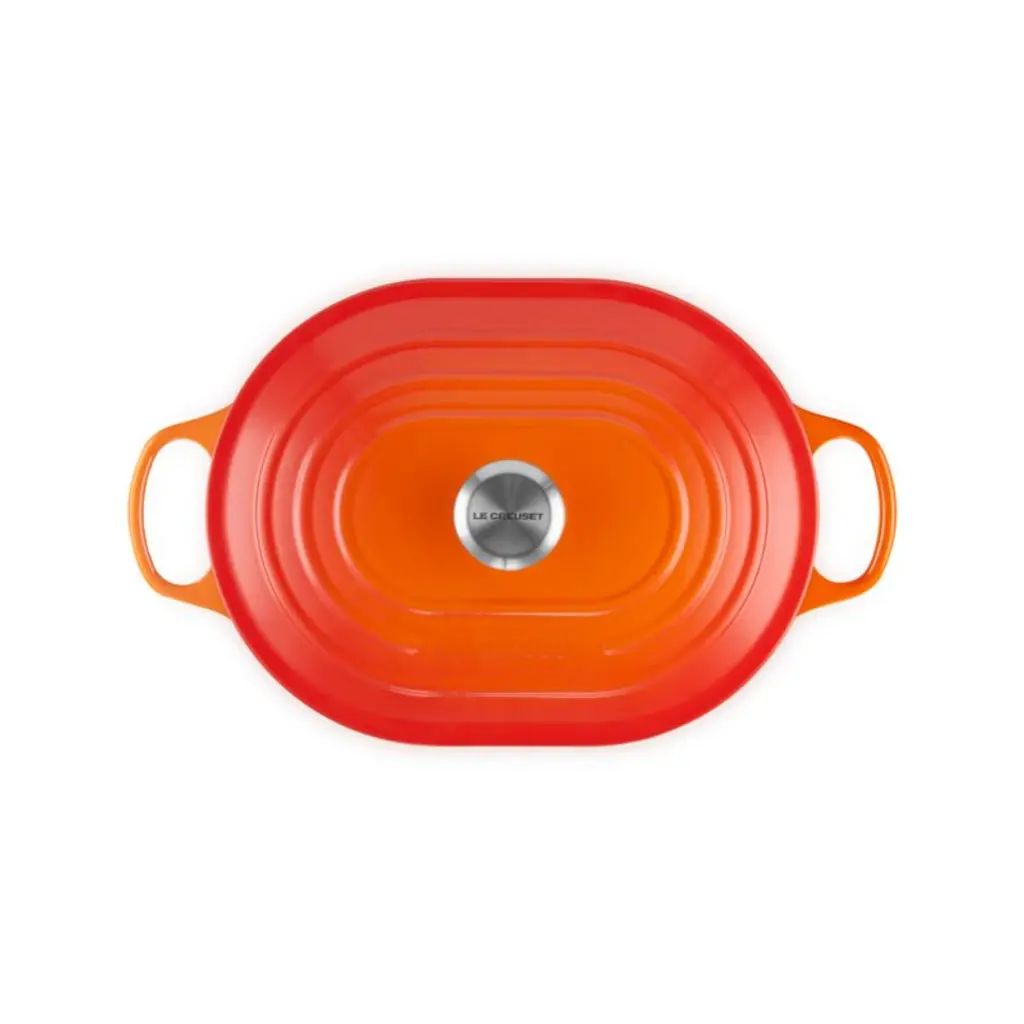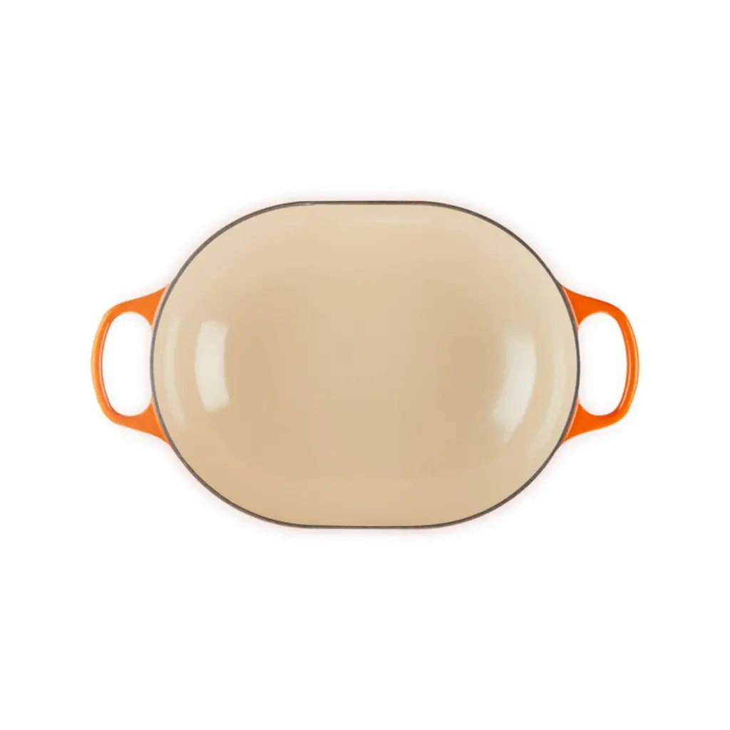 Porcelain enamel coats this display-worthy casserole dish in Le Creuset's signature red-orange enamel, inspired by the raw beauty of molten iron being poured from a crucibleor "creuset". The shallow oval shape accommodates fish, large cuts of meat or vegetables and roasts them to perfection. Or top the baking pan with the lid to bake deliciously moist casseroles. Cast iron offers impeccable heat distribution and retention, while the enameled surface minimizes sticking and staining. Designed with sloped sides for effortless serving, the covered casserole goes beautifully from stove to oven to table and cleans up easily in the dishwasher.Revered by both professional chefs and home cooks since its 1925 debut, Le Creuset's classic French cookware is prized for its utilitarian beauty and unsurpassed heat retention.
