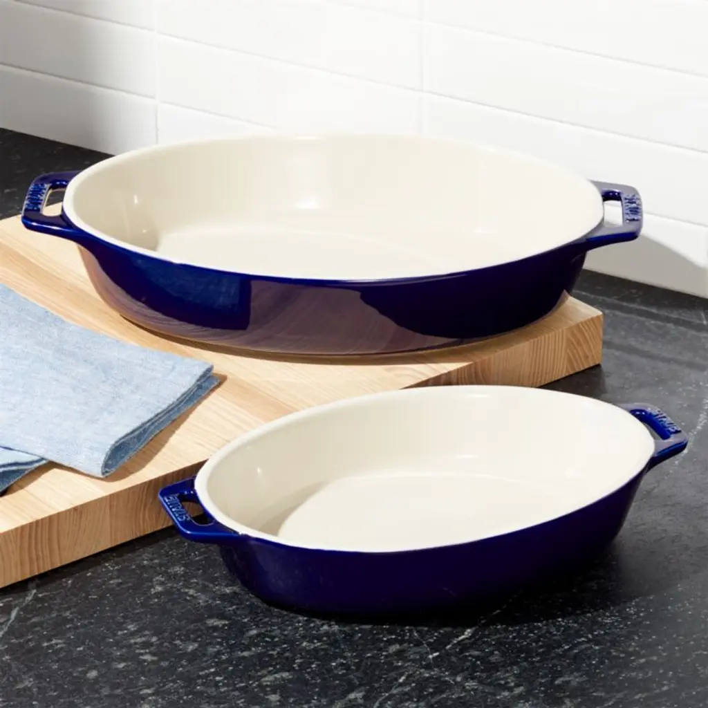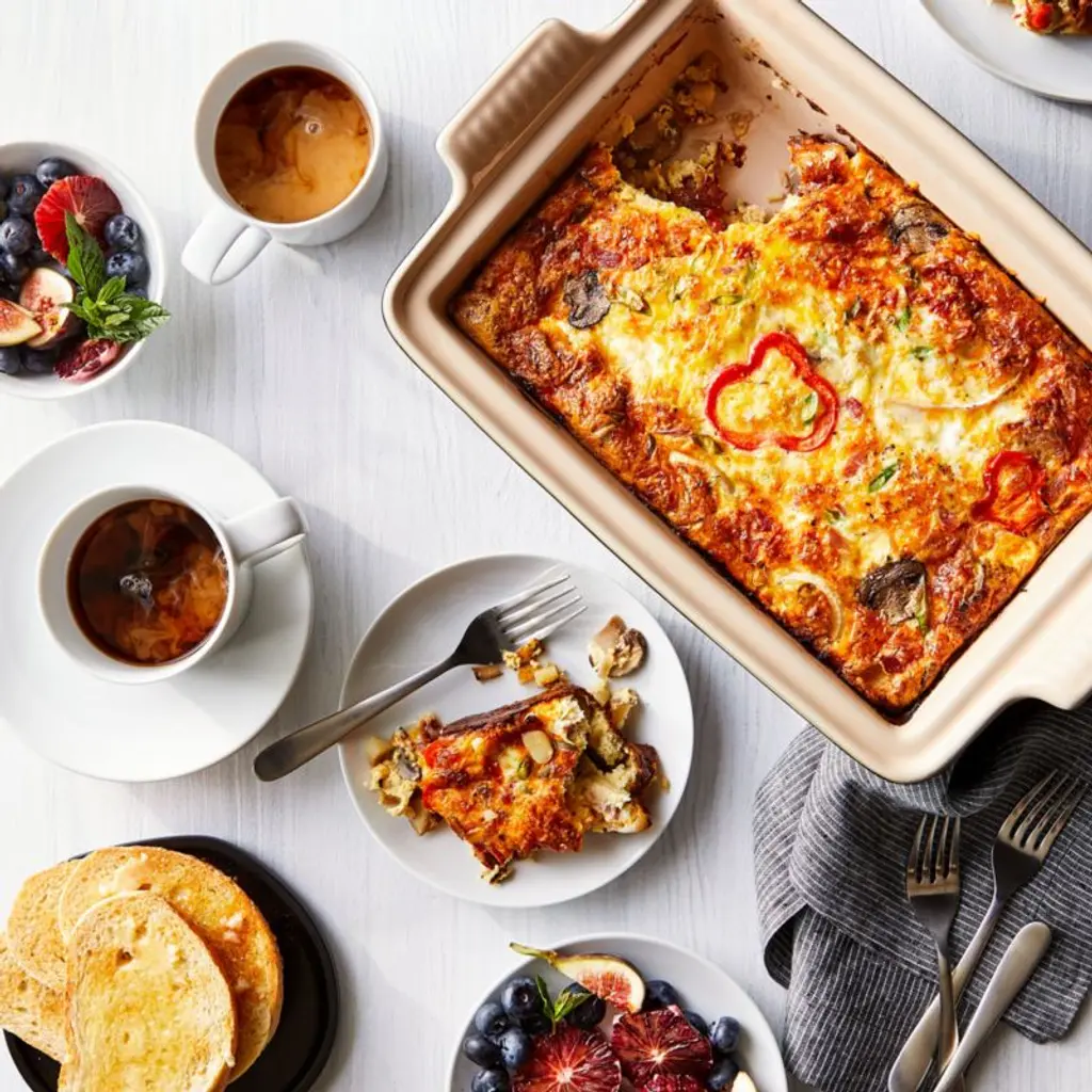 Revered by both professional chefs and home cooks since its 1925 debut, Le Creuset's classic French cookware is prized for its utilitarian good looks and unsurpassed heat retention. As beautiful as it is functional, this line of stoneware bakeware features superior performance in the oven or microwave and is ideal for baked goods and roasted dishes. Crafted of dense, enamel-glazed stoneware, this rectangular dish blocks moisture absorption to prevent cracking and crazing and has a brightly colored exterior that resists scratches and stains. The nearly non-stick interior resists sticking, effortlessly releases foods and cleans up easily. The cerise red baking dish is a versatile, oven-to-table option for marinating, roasting and serving, with an ideal size for roasts and casseroles. Le Creuset bakeware is also available in palm.