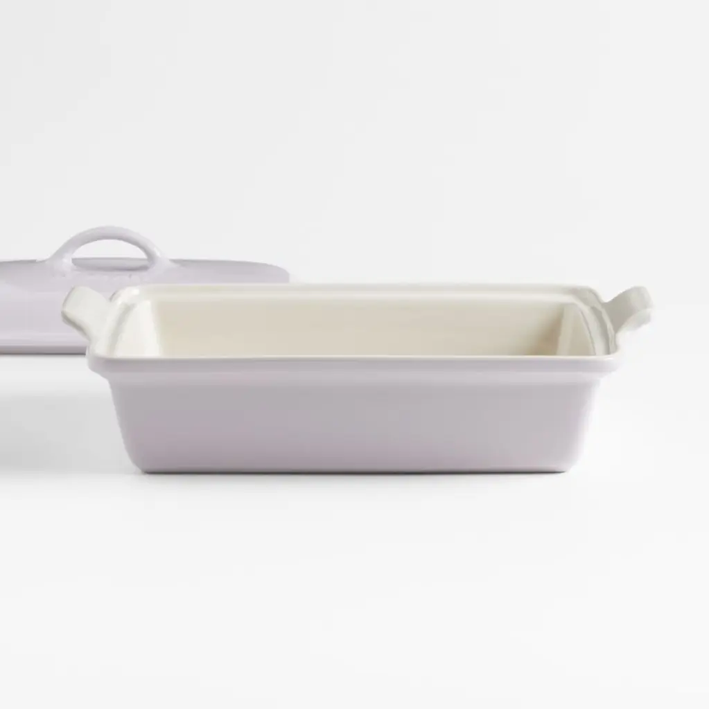 Enamel in creamy blush-purple inspired by shallots coats this gorgeous covered casserole.Inspired by vintage designs from Le Creuset's early days, the pan features traditional styling with scalloped handles. Crafted of dense stoneware, the rectangular baking dish blocks moisture absorption to prevent cracking and crazing. The nearly non-stick interior resists sticking, effortlessly releases food and cleans up easily. Ideal for baking and serving fruit crisps, lasagna and more, the lidded baker brings spring color and Le Creuset style to the kitchen and table.Revered by both professional chefs and home cooks since its 1925 debut, Le Creuset's classic French cookware is prized for its utilitarian beauty and unsurpassed heat retention.