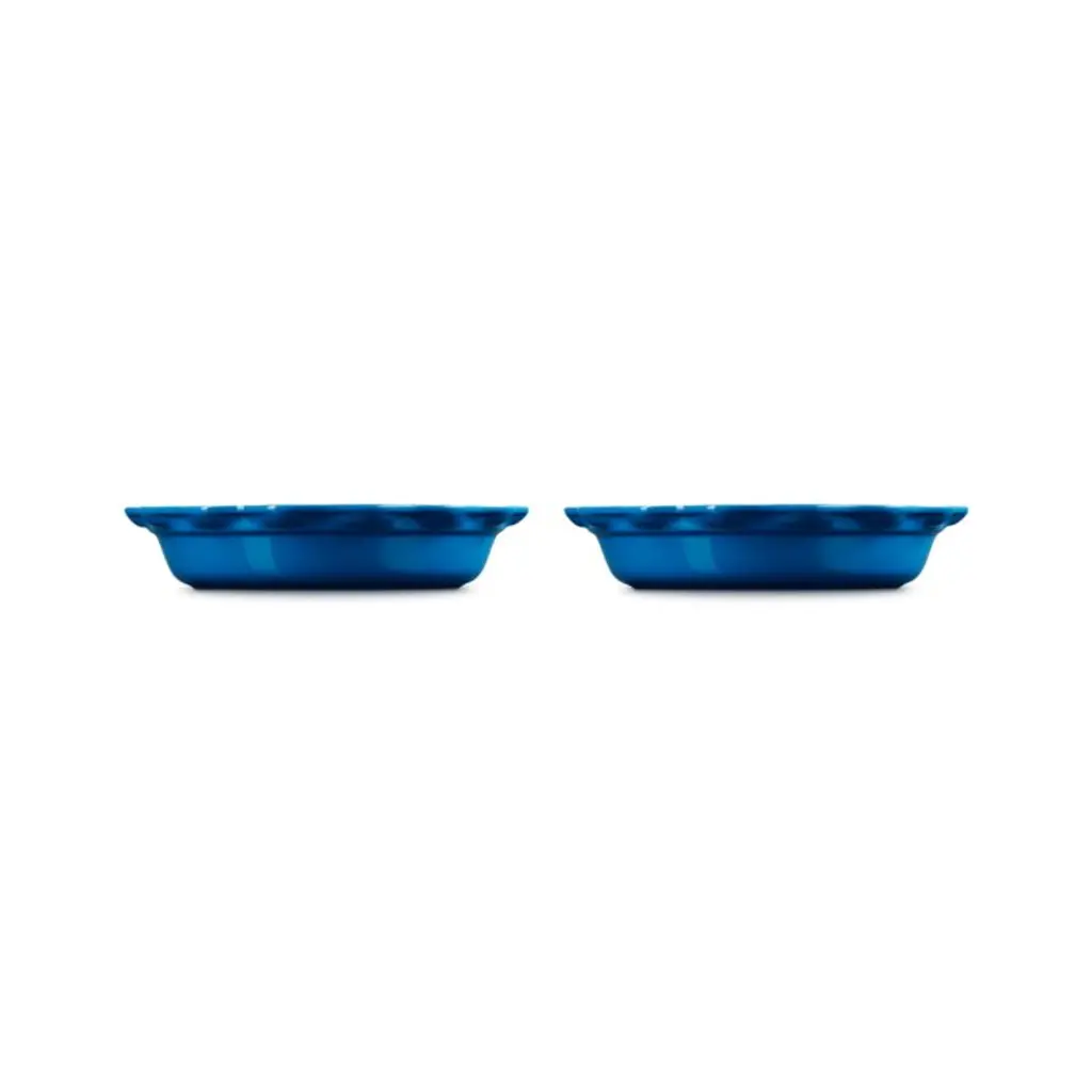 Enamel in an ocean-blue hue inspired by the French port city of Marseille glazes these pie pans for an eye-catching presentation of home-baked pies and quiches. Based on vintage designs from Le Creuset's early days, the pie dishes feature traditional styling with scalloped rims. The two pans are made of premium stoneware to distribute heat evenly for golden-brown flaky crusts and perfectly baked fillings. Angled side walls make it easy to serve neat sweet and savory slices from these scratch-resistant, virtually non-stick pie dishes.Revered by both professional chefs and home cooks since its 1925 debut, Le Creuset's classic French cookware is prized for its utilitarian beauty and unsurpassed heat retention.
