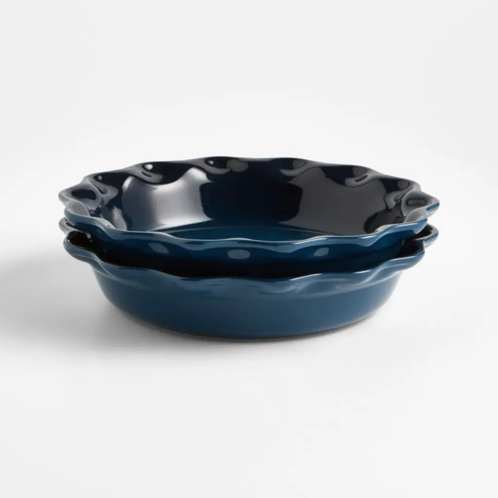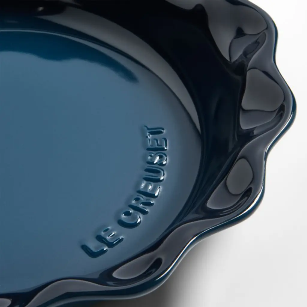 Named after the French word for night, inky blue enamel glazes these pie pans for an eye-catching presentation of home-baked pies and quiches. Based on vintage designs from Le Creuset's early days, the pie dishes feature traditional styling with scalloped rims. The two pansin a midnight blue exclusive to Crate & Barrelare made of premium stoneware to distribute heat evenly for golden-brown flaky crusts and perfectly baked fillings. Angled side walls make it easy to serve neat sweet and savory slices from these scratch-resistant, virtually non-stick pie dishes.Revered by both professional chefs and home cooks since its 1925 debut, Le Creuset's classic French cookware is prized for its utilitarian beauty and unsurpassed heat retention.