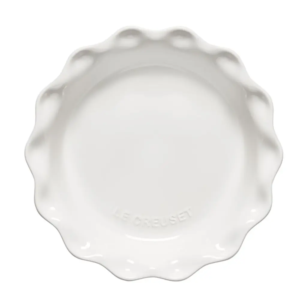 With its glossy white glaze and elegant scalloped rim, this pie dish makes an eye-catching presentation of home-baked pies and quiches. The dish is made of premium stoneware to distribute heat evenly for golden-brown flaky crusts and perfectly baked fillings. Angled side walls make it easy to serve neat slices from this scratch-resistant, virtually non-stick pie pan.Revered by both professional chefs and home cooks since its 1925 debut, Le Creuset's classic French cookware is prized for its utilitarian beauty and unsurpassed heat retention.