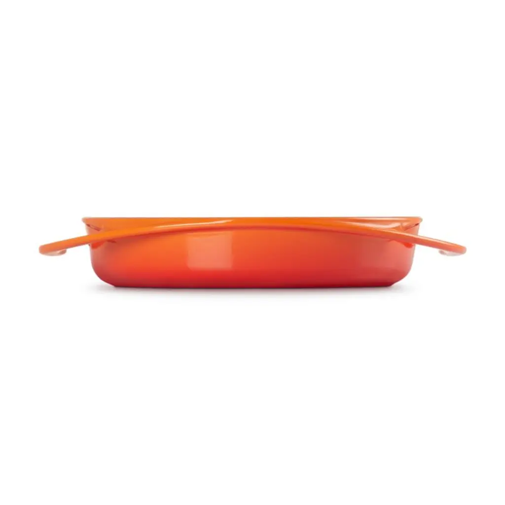 Indulge your daydreams of becoming a Parisian pastry chef with this tarte tatin dish. Designed for sauteing fruit or vegetables on the stovetop before baking in the oven, the shallow pan bakes the classic French upside-down apple dessert as well as quiches, frittatas and more. Inverted handles make it easy to flip the pan over to present your creation. Cast iron offers impeccable heat distribution and retention, while the enameled surface minimizes sticking and staining. Based on vintage designs from Le Creuset's early days, the traditionally styled baking dish is glazed in a fiery orange-red inspired by the raw beauty of molten iron being poured from a crucible, or ""creuset"" in French.Revered by both professional chefs and home cooks since its 1925 debut, Le Creuset's classic French cookware is prized for its utilitarian beauty and unsurpassed heat retention.