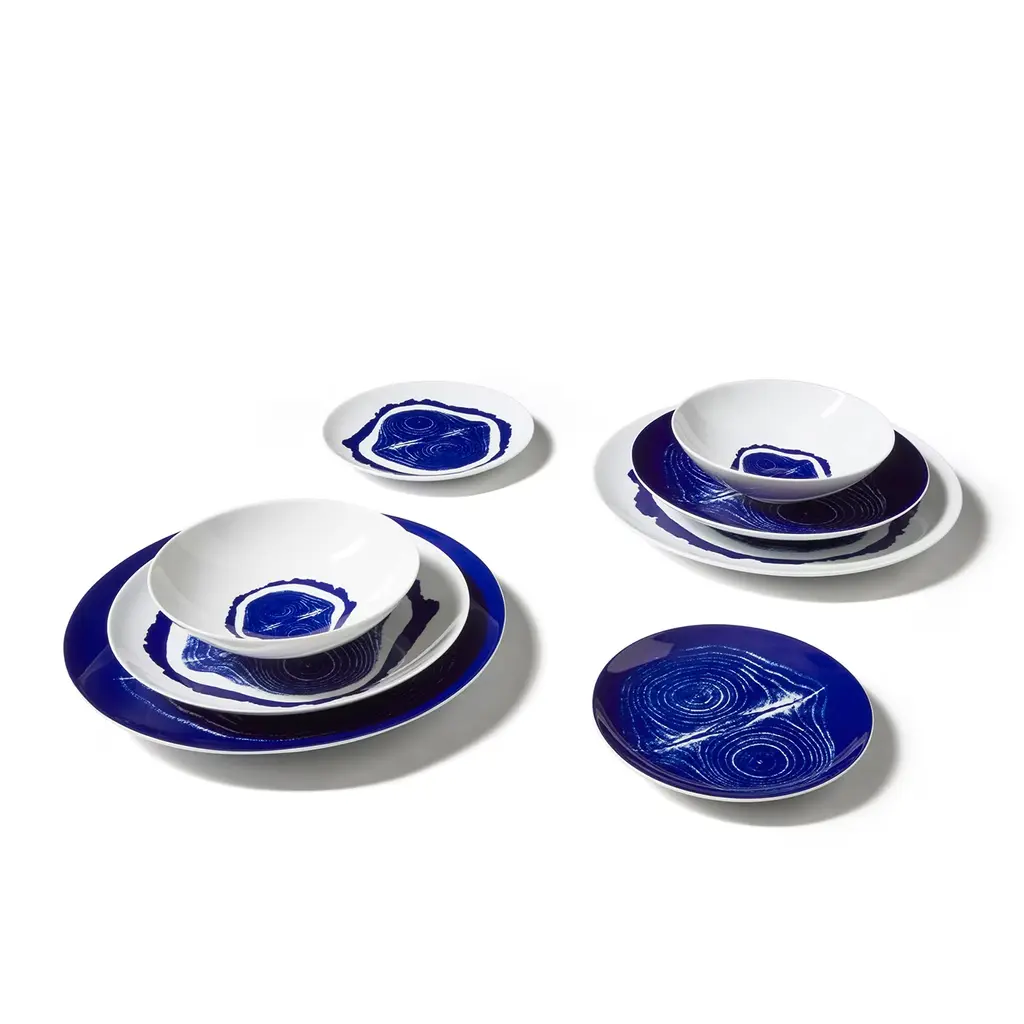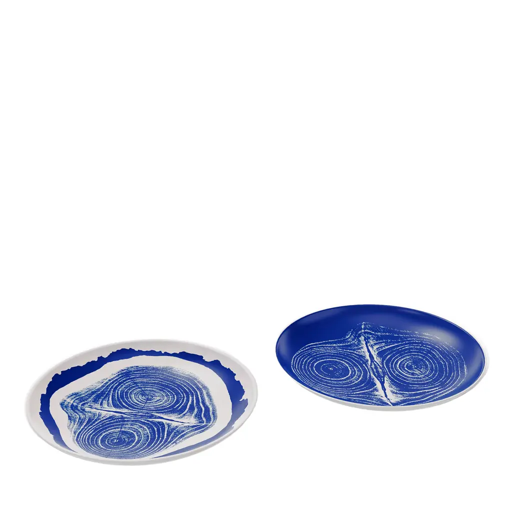 Set of 2 placeholder plates - Tronc. Le Monde de Charlotte Perriand: a new tableware collection inspired by her passion for nature: Cassina continues its collaboration with Ginori 1735 and presents the finest porcelain dinner set inspired by the photography of Charlotte Perriand. Hand-decorated and characterized by patterns that combine blue and white, this striking set of plates is the perfect proposal to embellish any dinner table. The Le Monde de Charlotte Perriand collection includes a service plate, a dinner plate, a bowl, and a side/dessert plate, presented in a set of two, with three different decorations that can be mixed and matched. Each piece is marked with the Cassina and Ginori 1735 logos to guarantee authenticity.