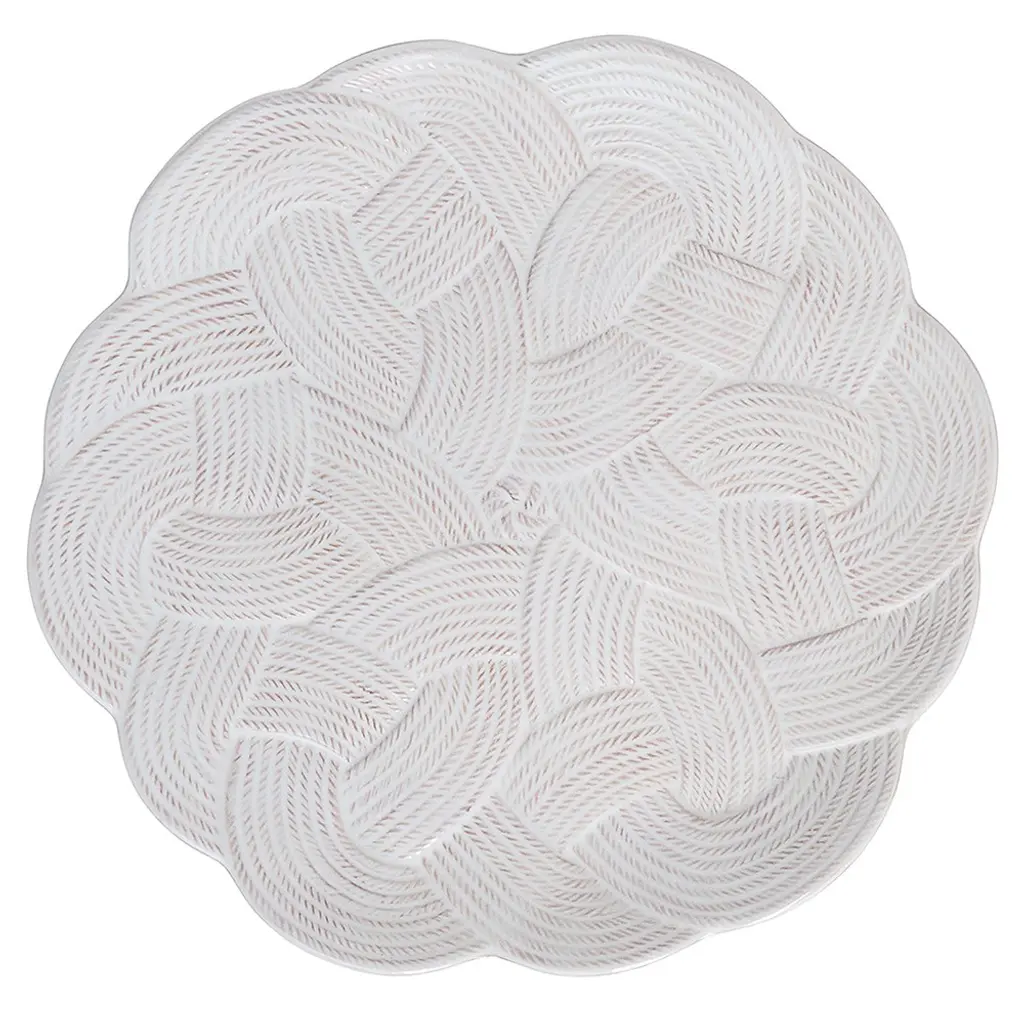 Symbolizing protection, love, and a long, happy life, the mystic knot has been cherished for generations by sailors as a tribute to their families and the sea. With its interwoven braided whorls, this large charger delivers a rich textural warmth, sculptural silhouette and timeless aesthetic to the table for layering with other patterns or to use as a beautiful serving platter.