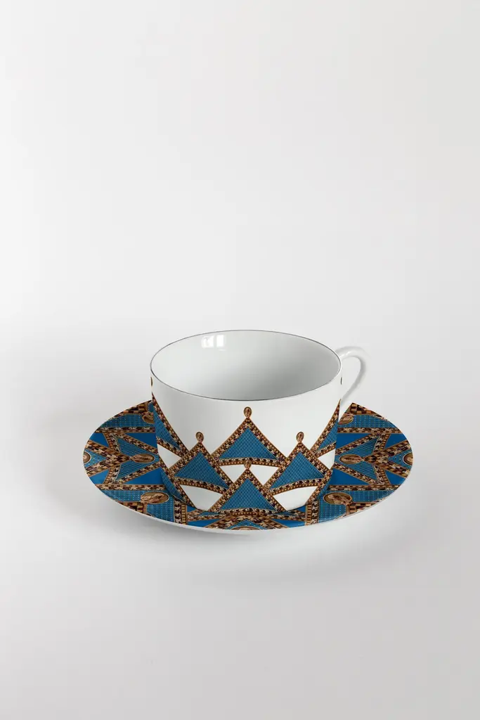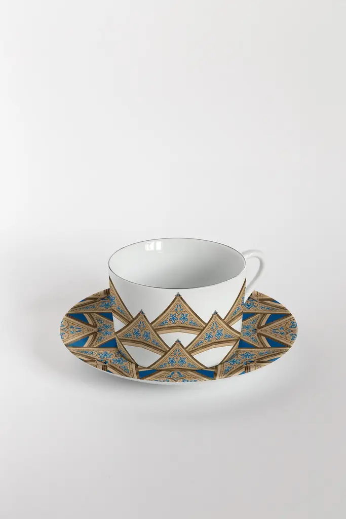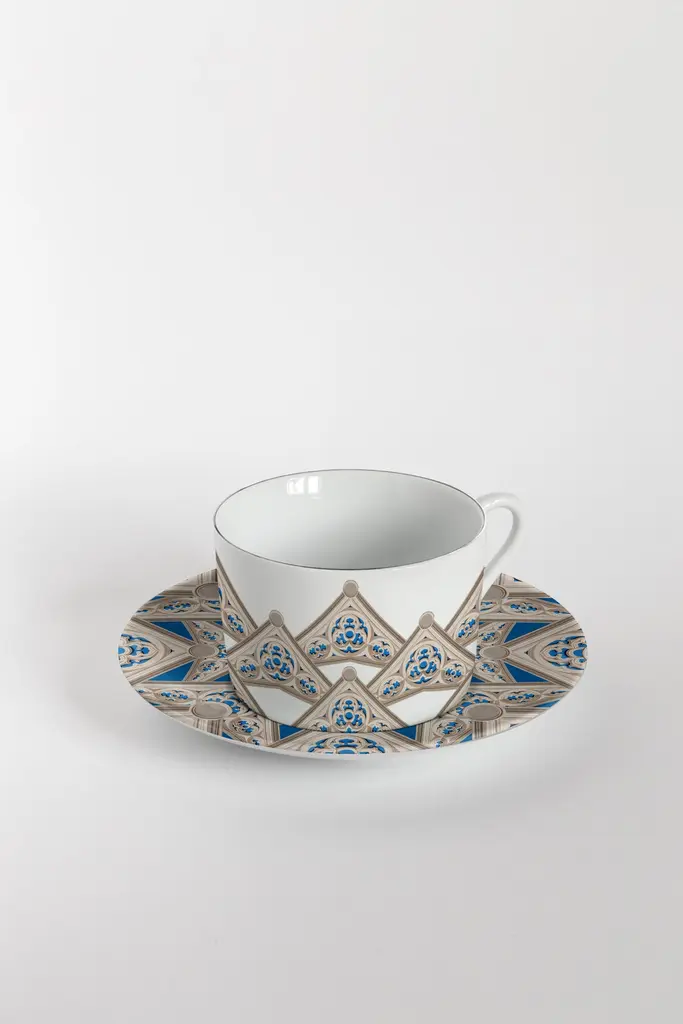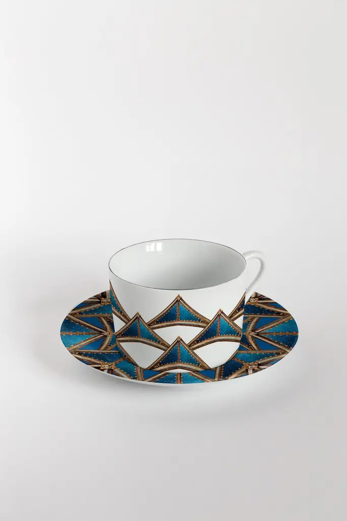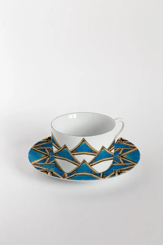 From the encounter between the historical archives of the Duomo di Milano and the imagery of Grand Tour by Vito Nesta, this unique collections of porcelains and fabrics were born. “Le Volte Celesti” creates, through the use of some historical sketches of frescoes dedicated to the naves of the Duomo, some geometric, almost kaleidoscopic games.Buyers, through the purchase of these collections, will contribute to the restructuring of the spiers of the Duomo as part of the proceeds will be donated to the Veneranda Fabbrica for this purpose.Set of 6 tea cups and plates.