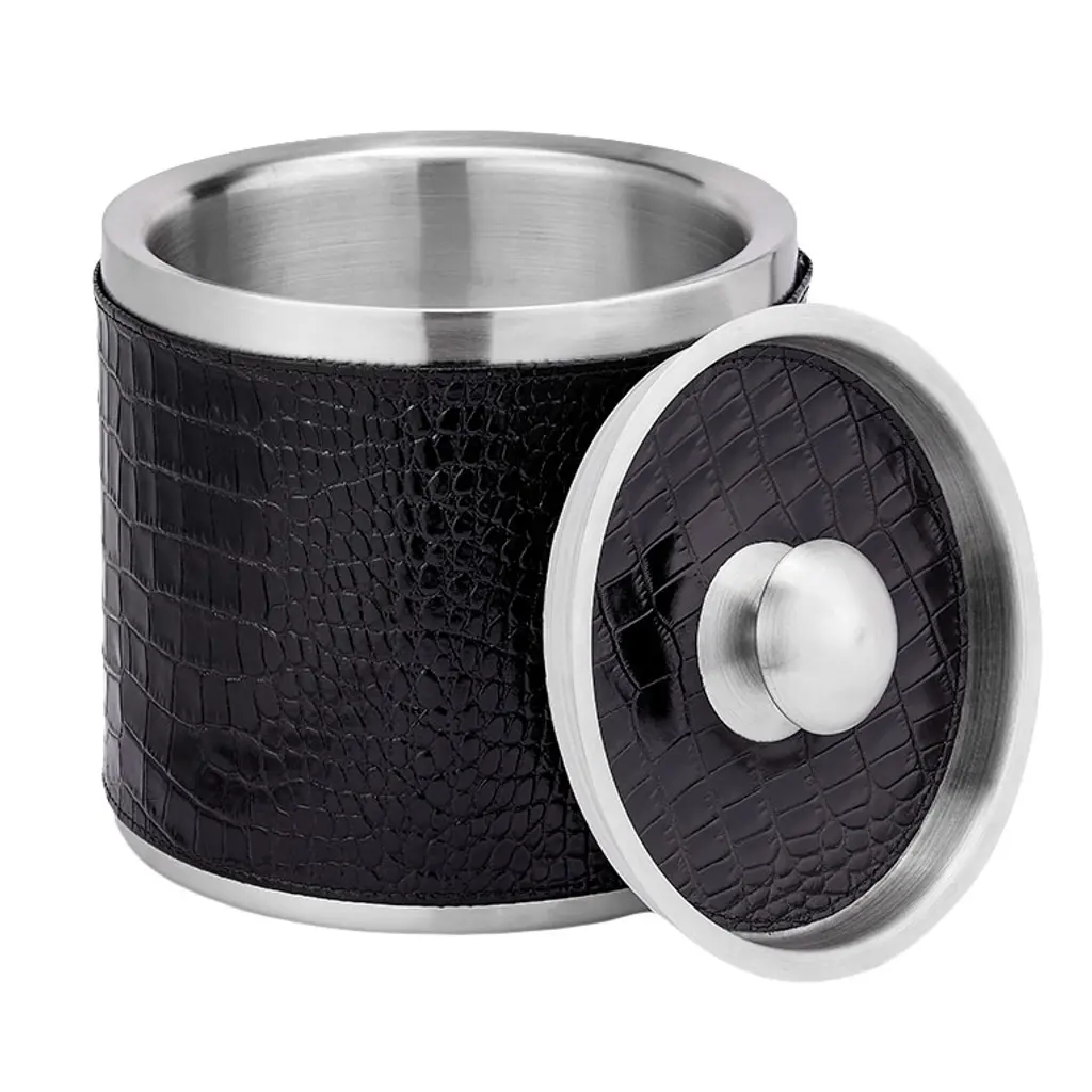 A classy and stylish lidded leather ice bucket in embossed croc with removable polished metal insert. Includes ice tongs. Italian Embossed Croc Leather Handcrafted stainless- steel ice bucket with ice tongs Leather wrapped Holds 3 quarts Size 7.5" round