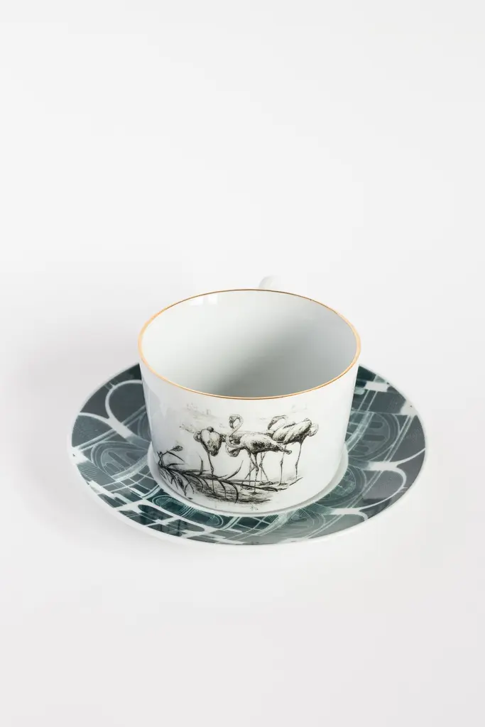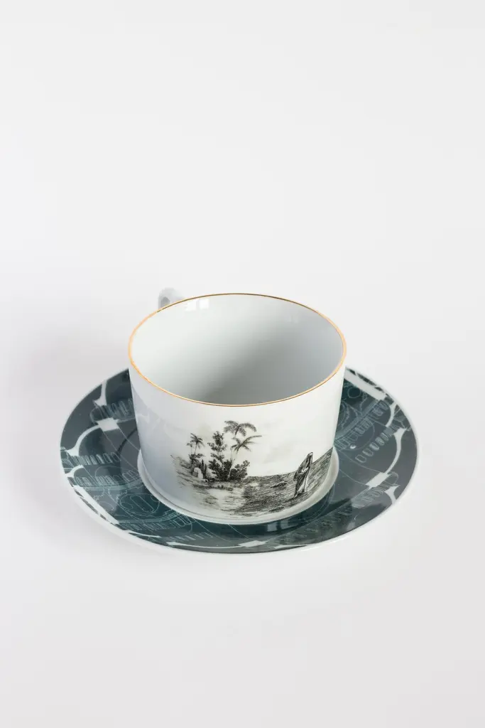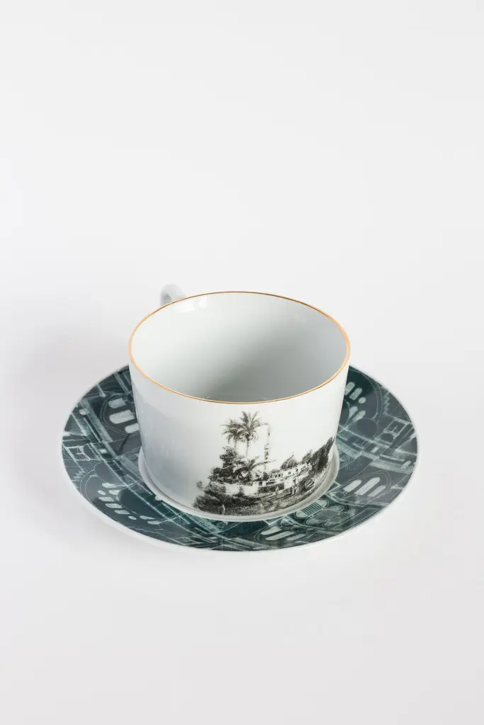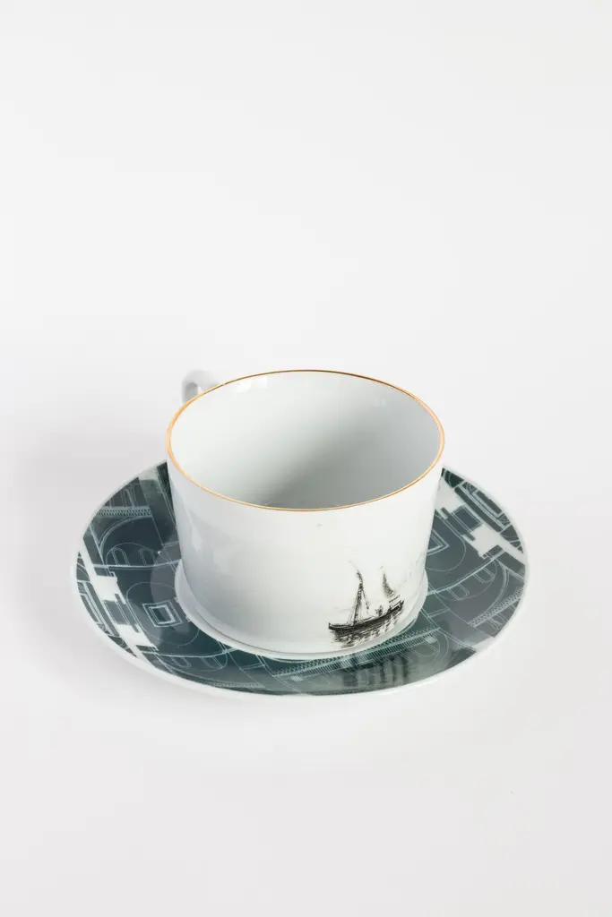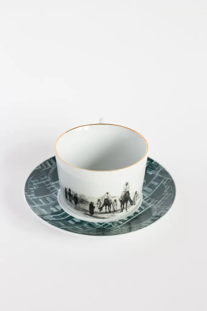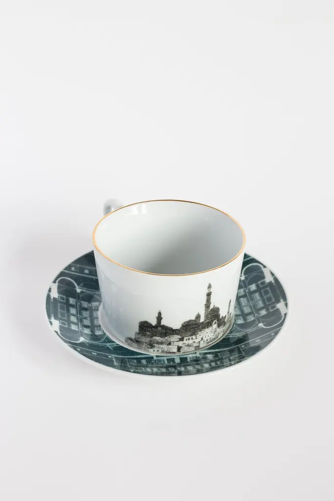 In Lebanon collection a different landscape depicts the local coasts, ruins, and architecture in black and white, with a sophisticated rim decoration that showcases blueprints of traditional buildings.Tea set with 6 coffee cups and plates.