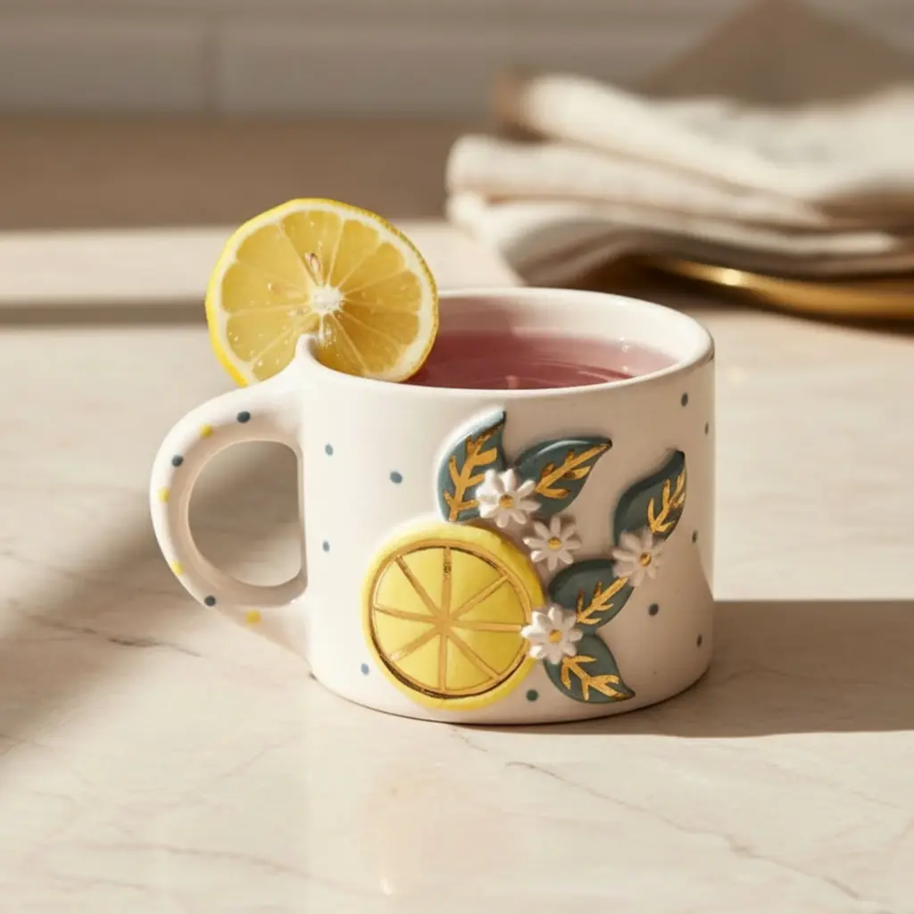 Infuse your coffee and tea rituals with a touch of artisanal charm. This Lemon Blossom Handcrafted Ceramic Mug is perfect for bringing a vibrant yet calming energy to your daily routine. The hand-painted lemon and floral design, embellished with delicate golden accents, evokes the freshness of a sun-drenched citrus grove. Ideal for sipping hot teas or cozy herbal infusions, this one-of-a-kind mug is a beautiful balance of whimsy and elegance. Each piece is uniquely crafted to bring a natural, hand-touched feel to your kitchen.