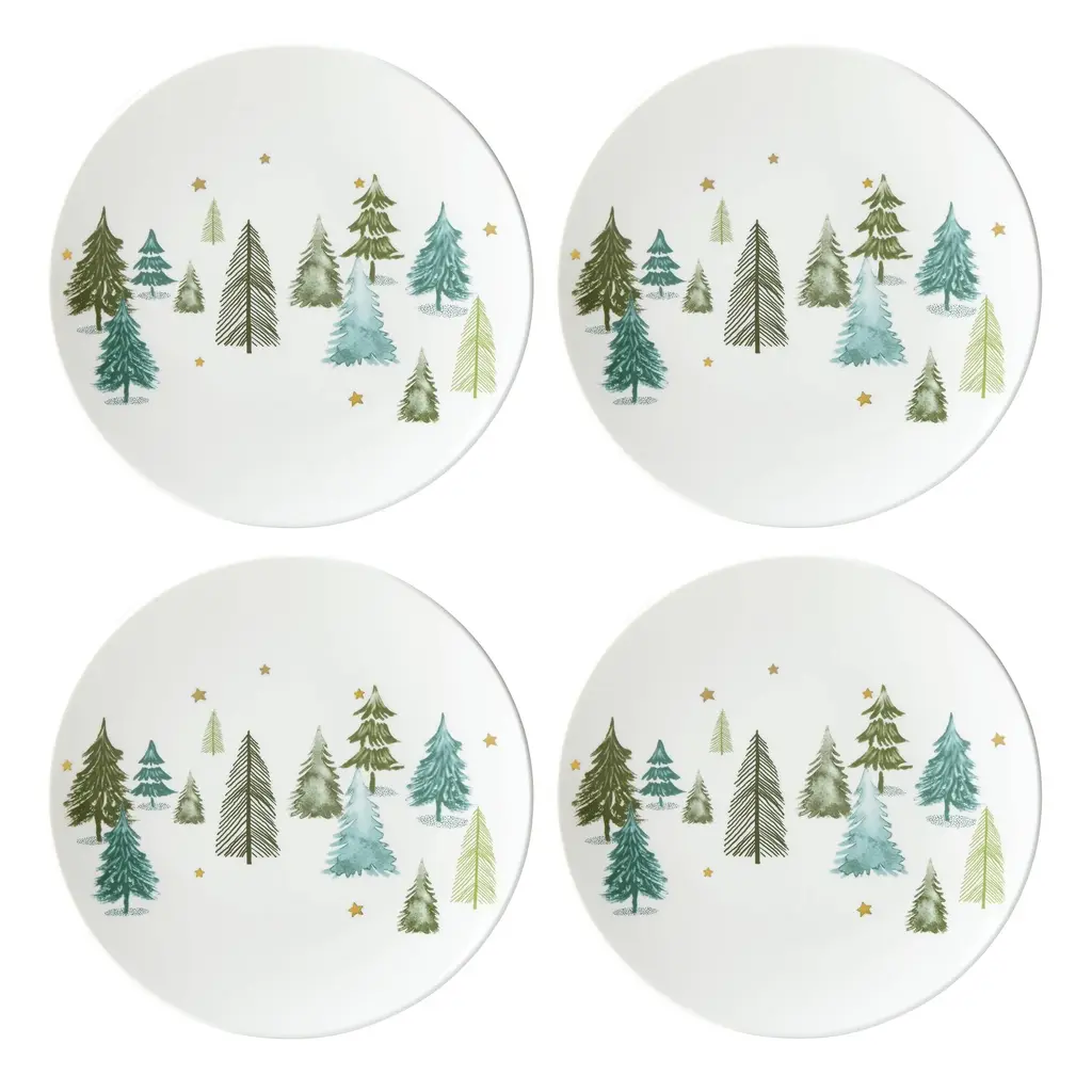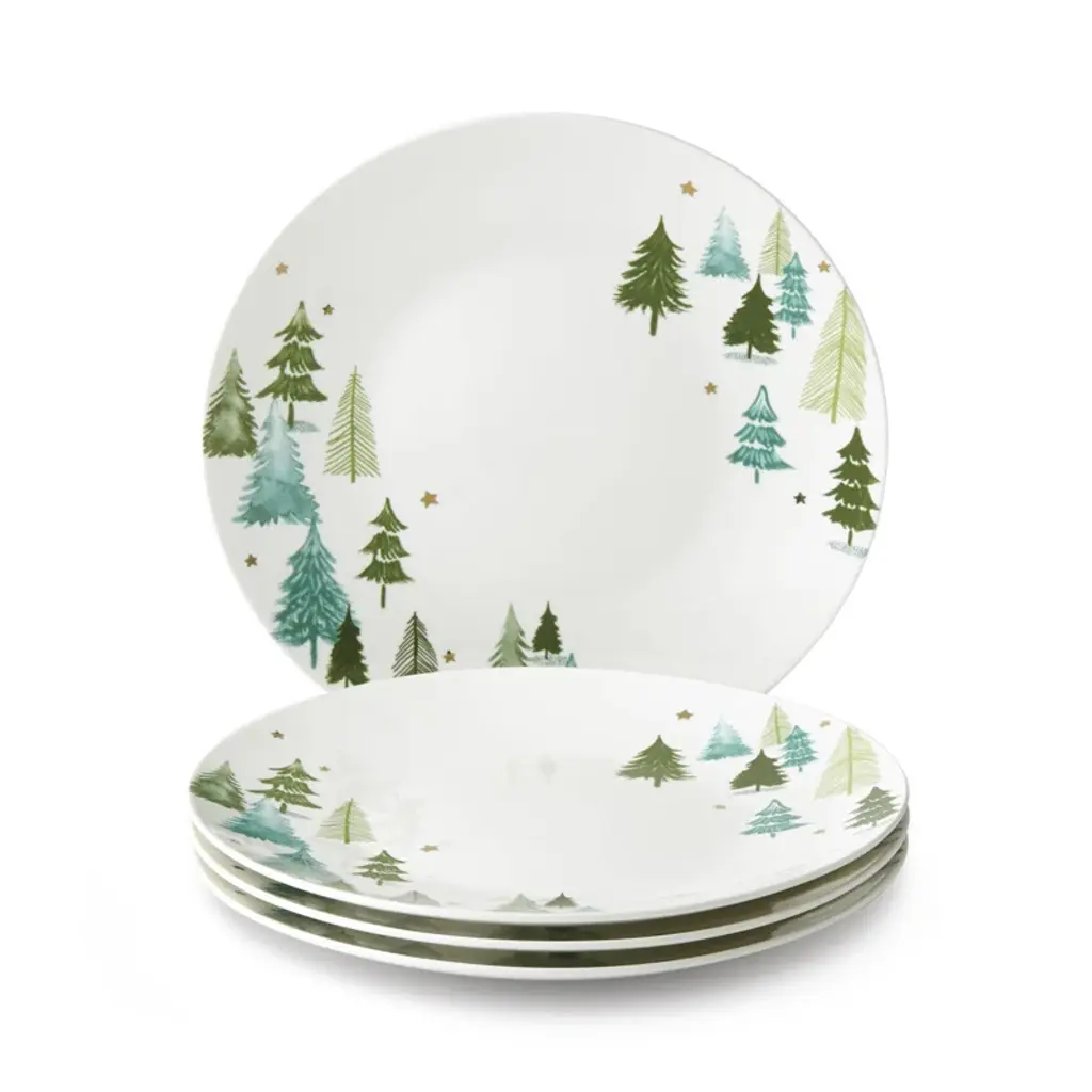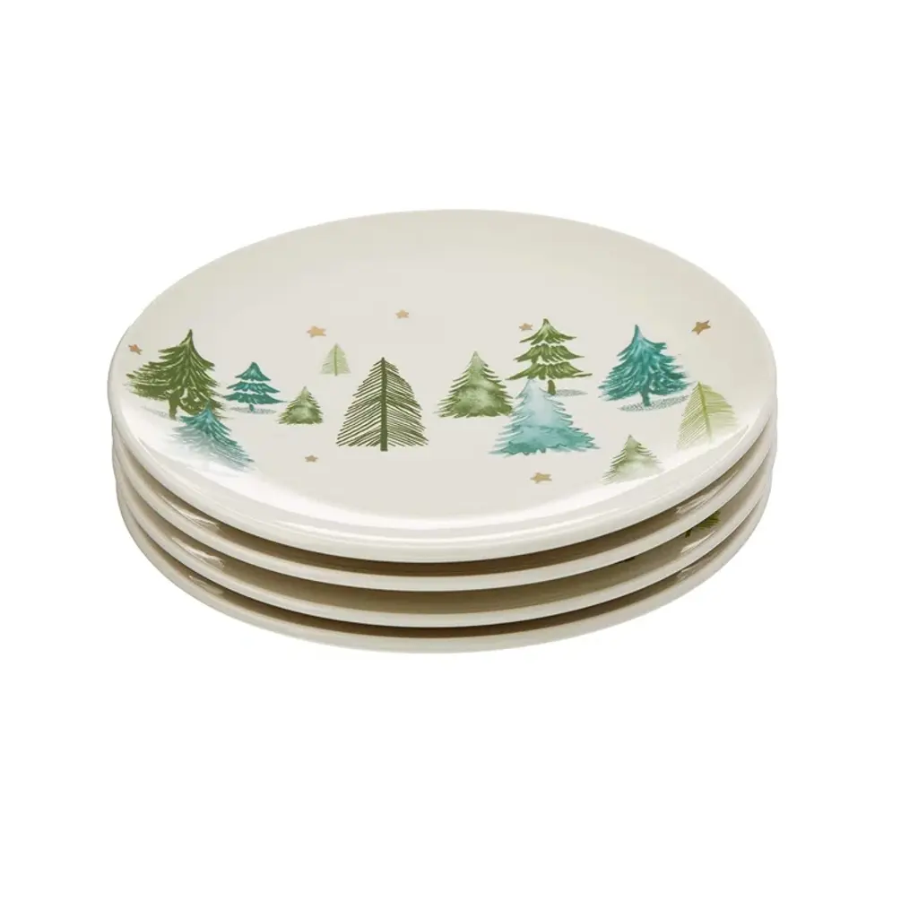 White ceramic is decorated with whimsical pine trees and metallic stars on this set of four dinner plates. Part of the Balsam Lane Collection, the set is perfect for entertaining.